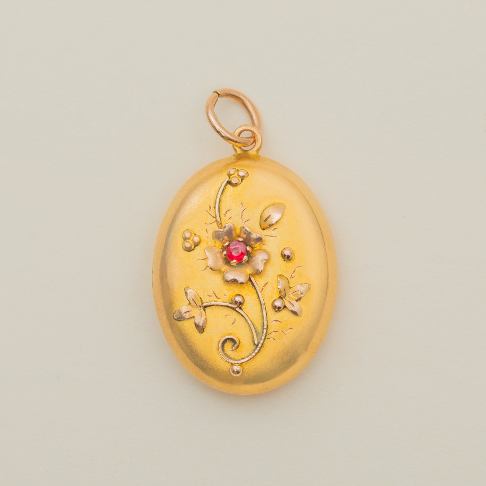 Crafted from buttery 9ct Gold, this antique locket features a gorgeous floral motif on her front panel and is adorned by a deep crimson Garnet in her centre, marrying the warmth of the Gold.