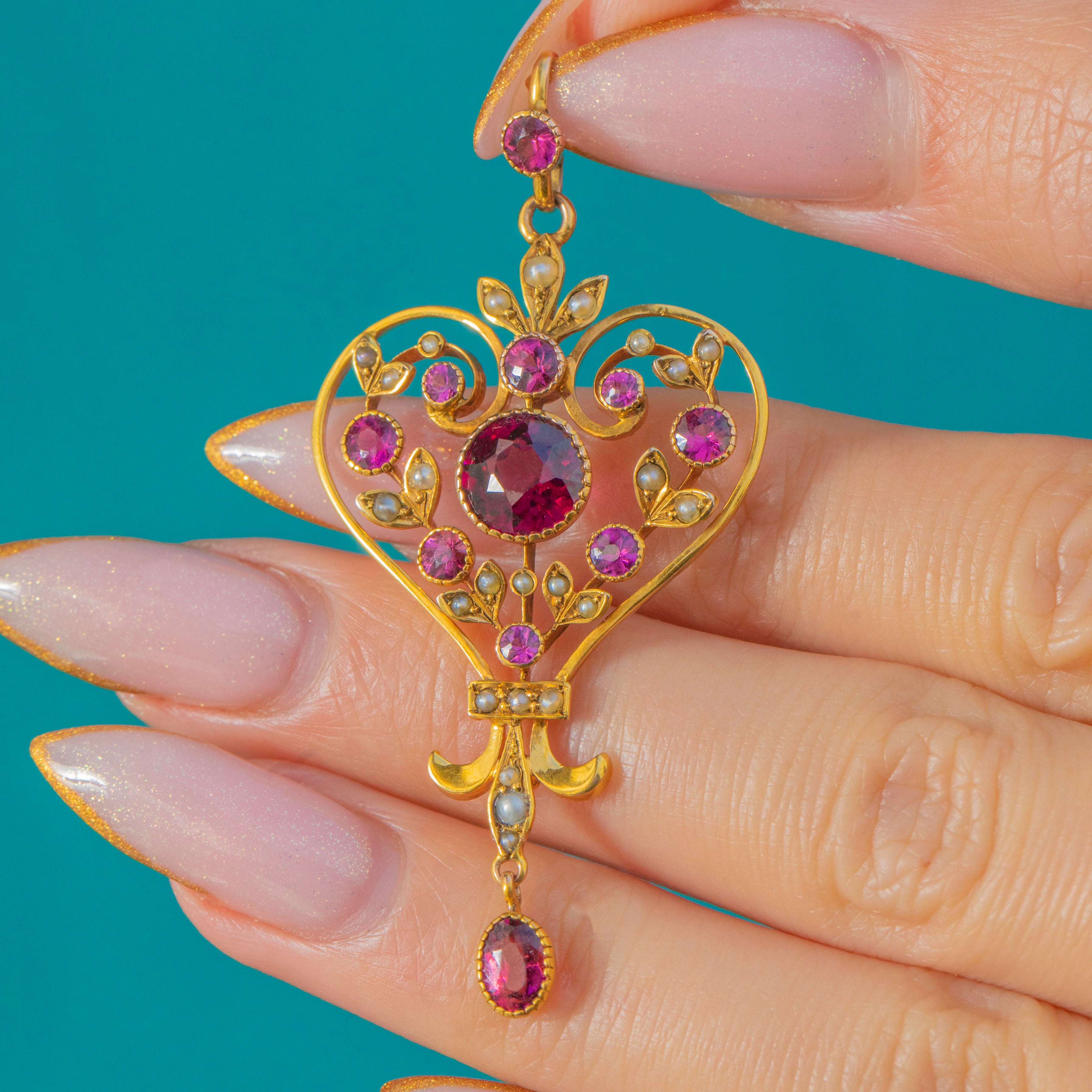 EXCELLENT: The Garnets are bright, well-matched and securely set with no chips or abrasions. Pearls show only light natural surface texture expected for their age. The goldwork is in beautiful condition with crisp detailing and no losses or repairs. A carefully preserved Edwardian pendant.
