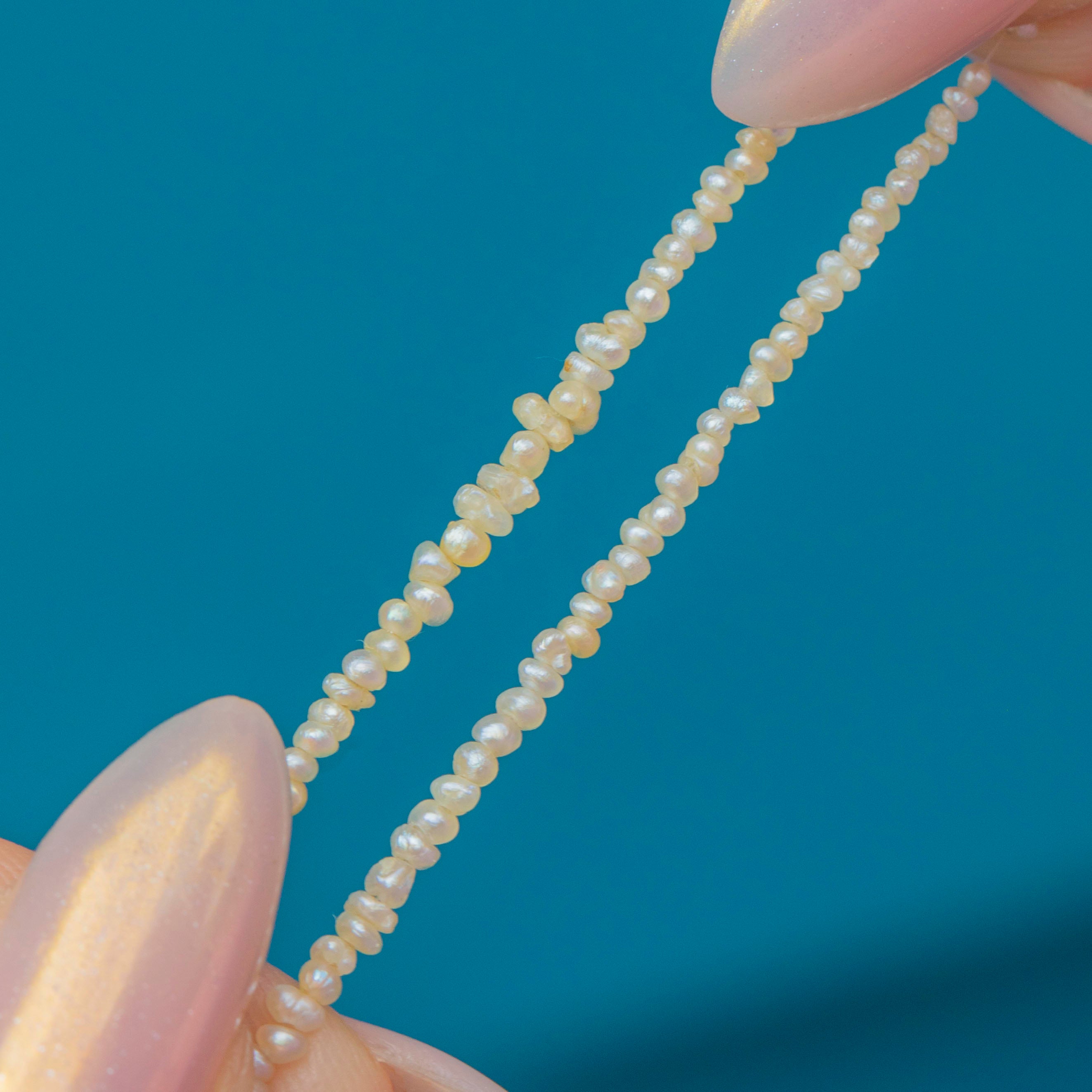 An elegant Edwardian-era necklace featuring two dainty strands of natural Pearls, each subtly graduated and layered to create a delicate, refined effect.