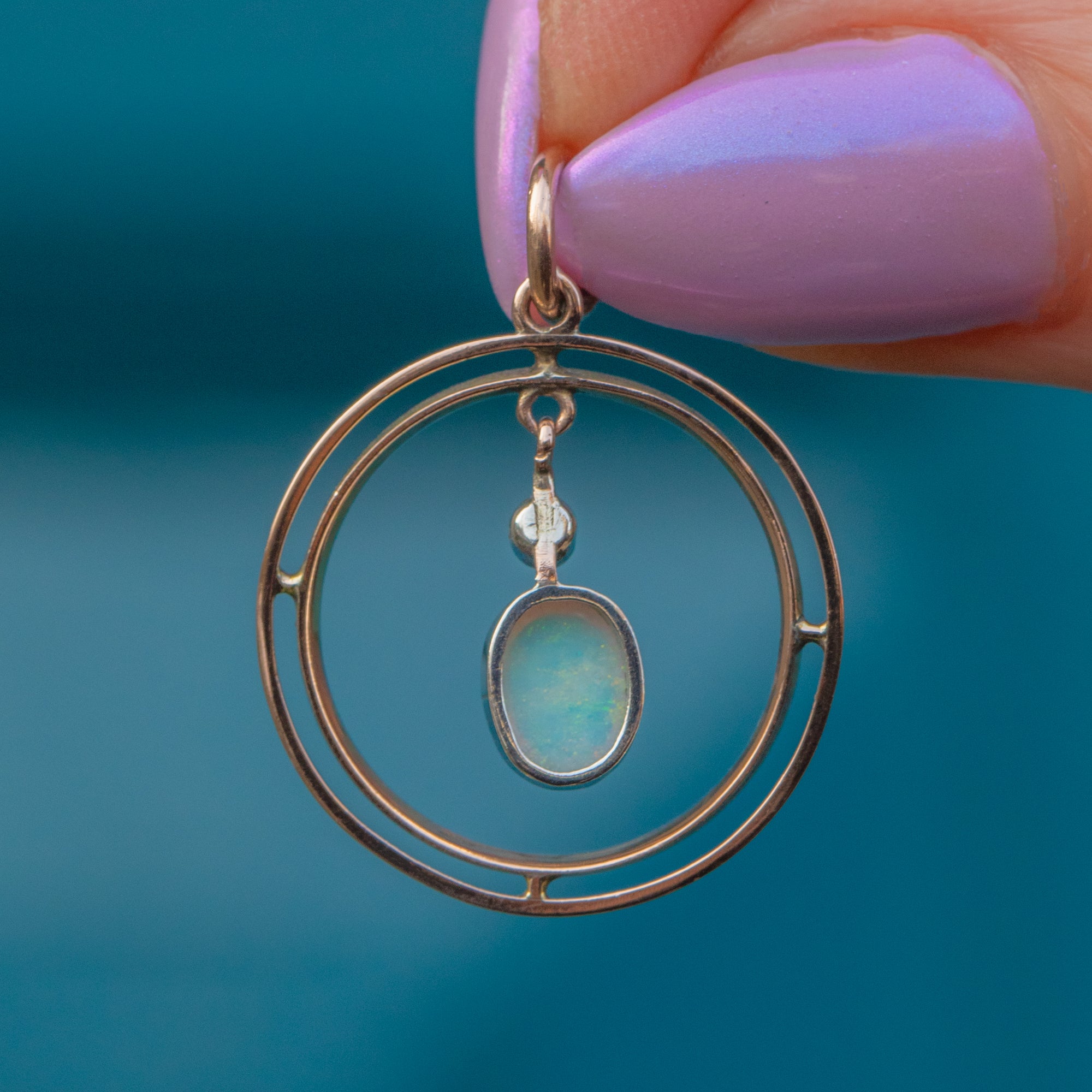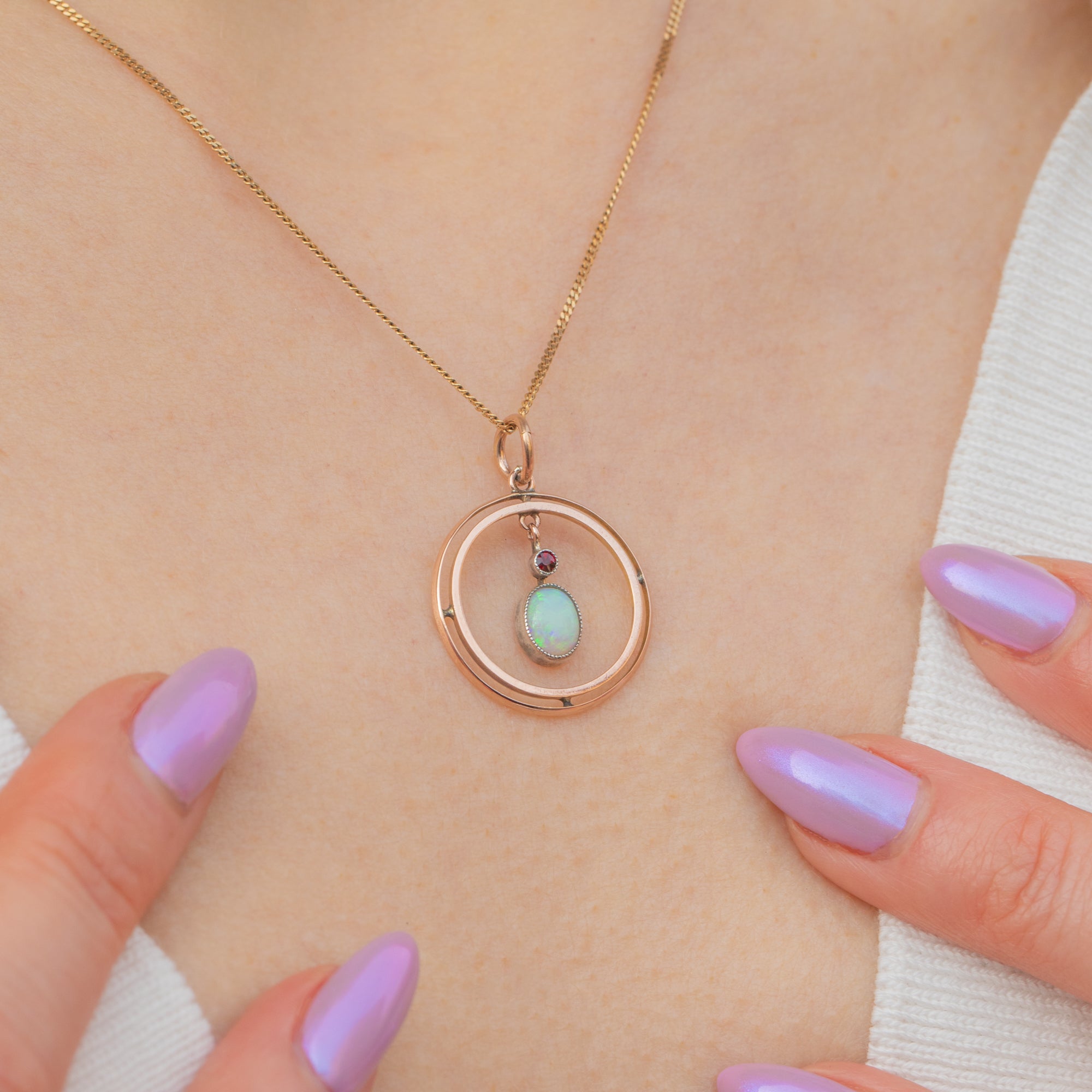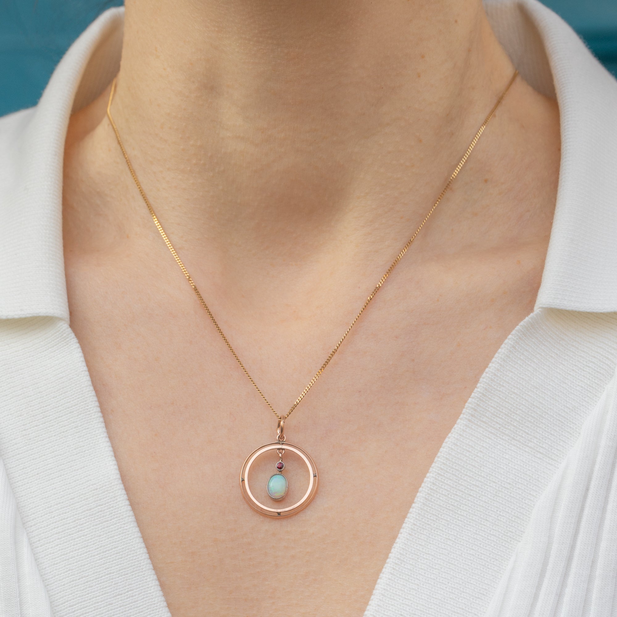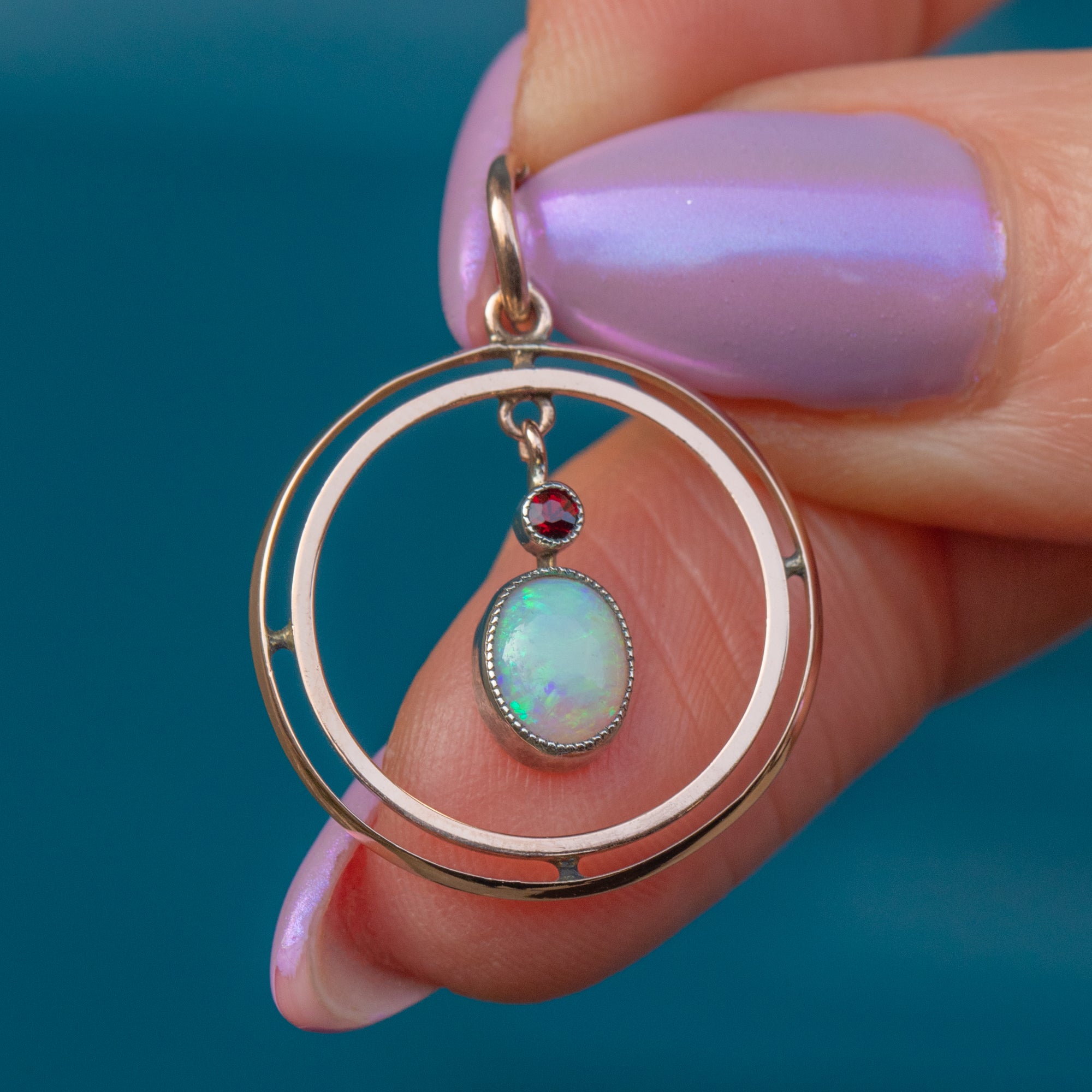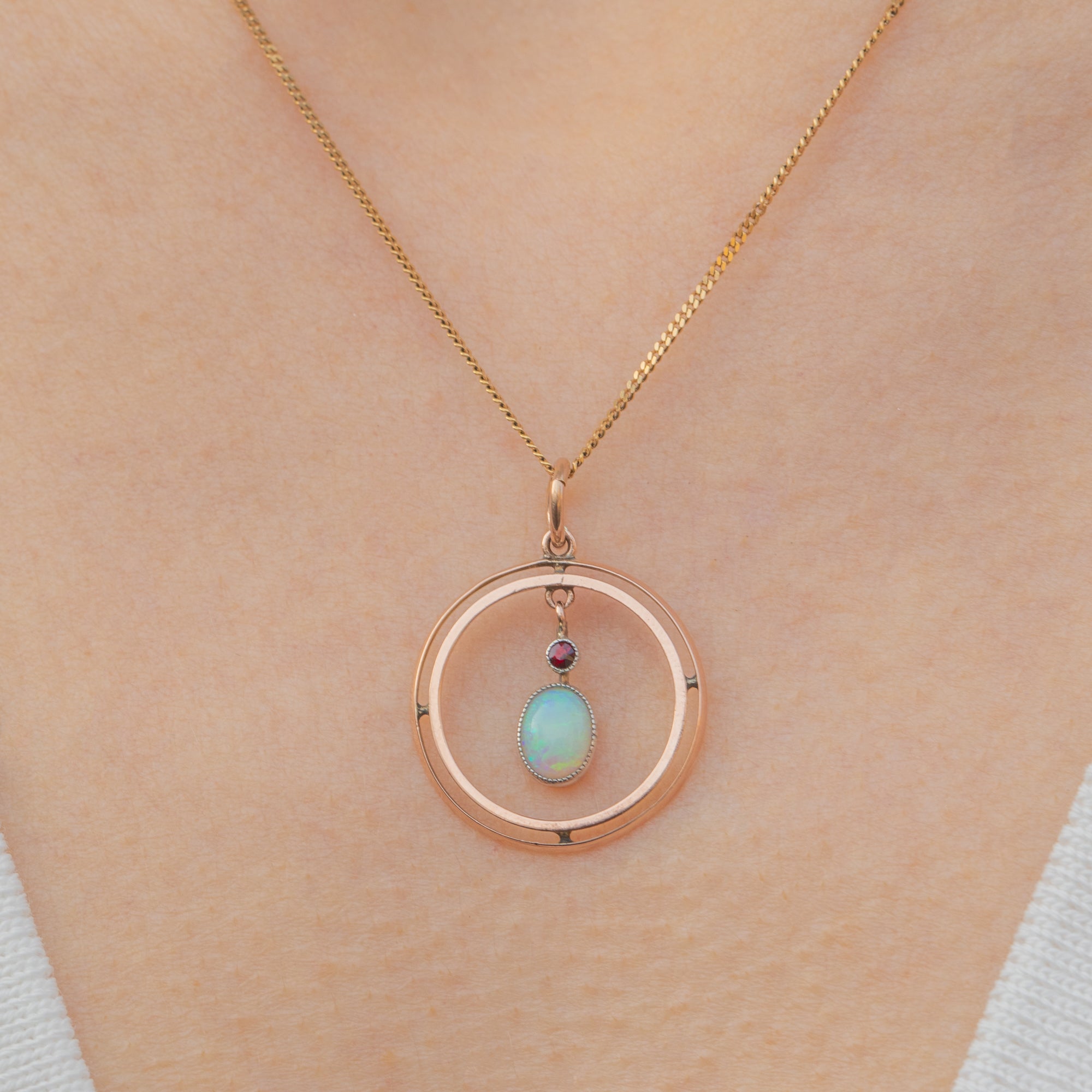 This exquisite Edwardian 9ct Gold Opal Garnet pendant is a true antique treasure! The pendant showcases a luminous Opal drop that shimmers with mesmerising flashes of colour, topped by a rich red Garnet accent that adds a striking contrast, displayed within a classically Edwardian roundel form.
