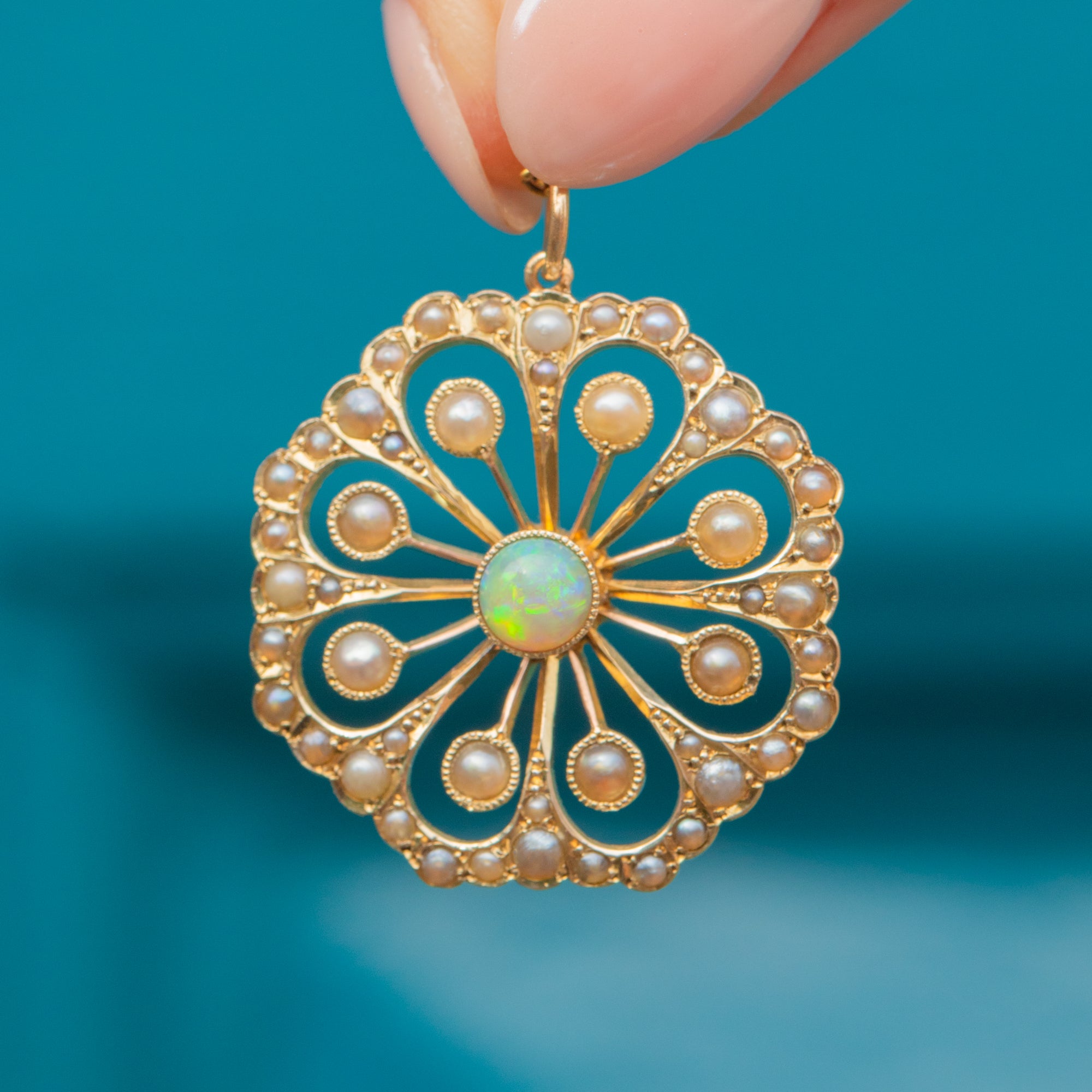 EXCELLENT. We are pleased to present this Edwardian 9ct Gold Opal Pearl flower cluster pendant in excellent condition! The Pearls and Opal are secure within their settings, free from any damage to note and complimenting one another beautifully. The 9ct Gold is well formed, possessing an irresistible glow. With a soldered jump-ring, this pendant can be worn in style and comfort!
