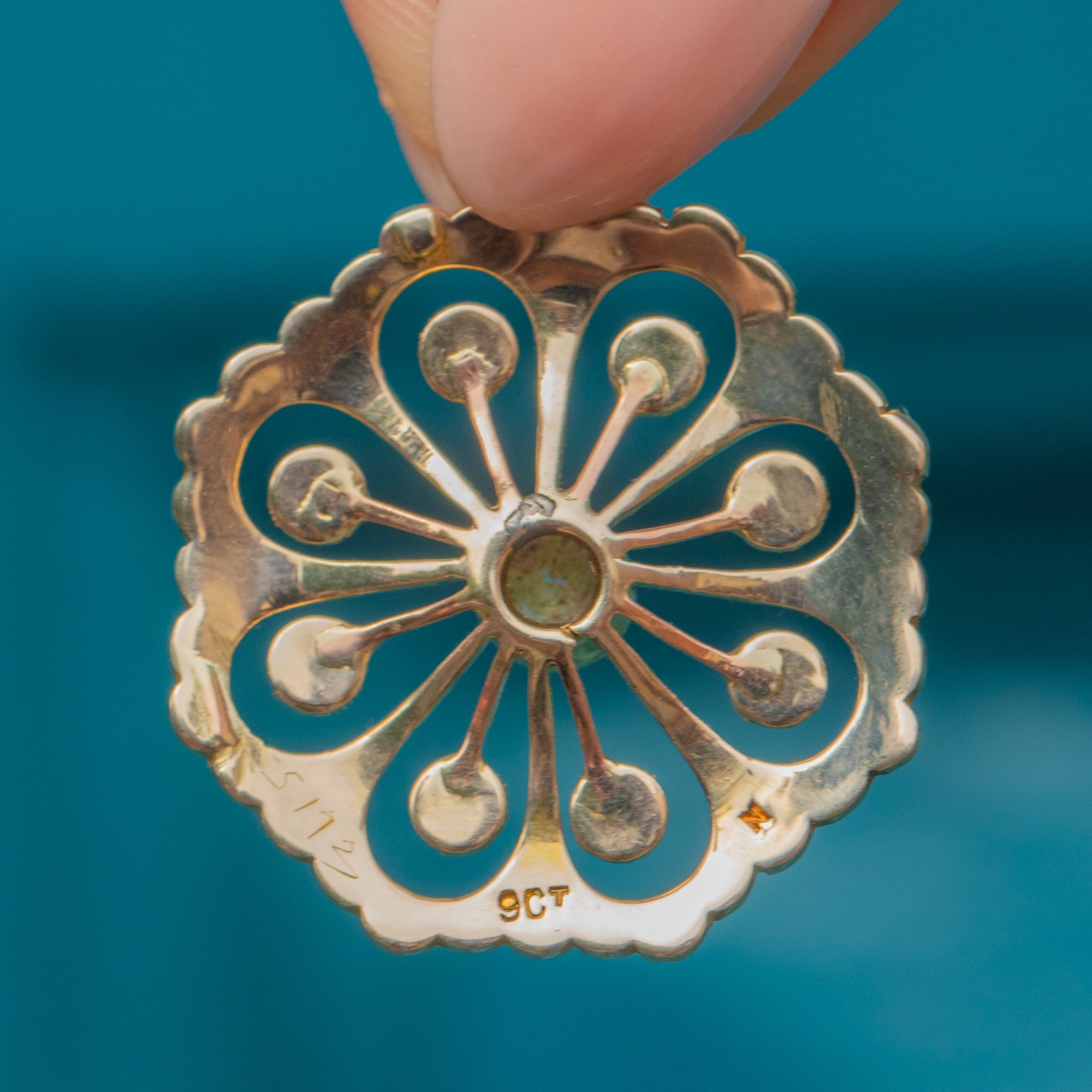 This Edwardian 9ct Gold Opal Pearl flower cluster pendant is bursting with life! Her floral form is inlaid with Silver-infused Pearls that look akin to a cluster of bubbles, giving this Edwardian pendant an ethereal and fun feel.