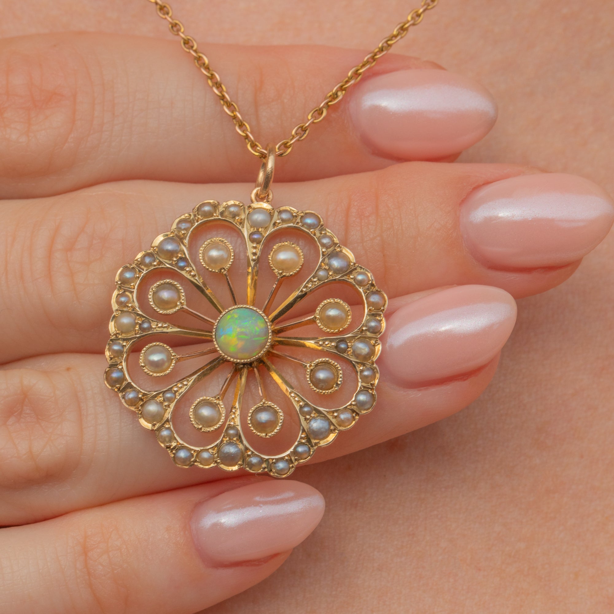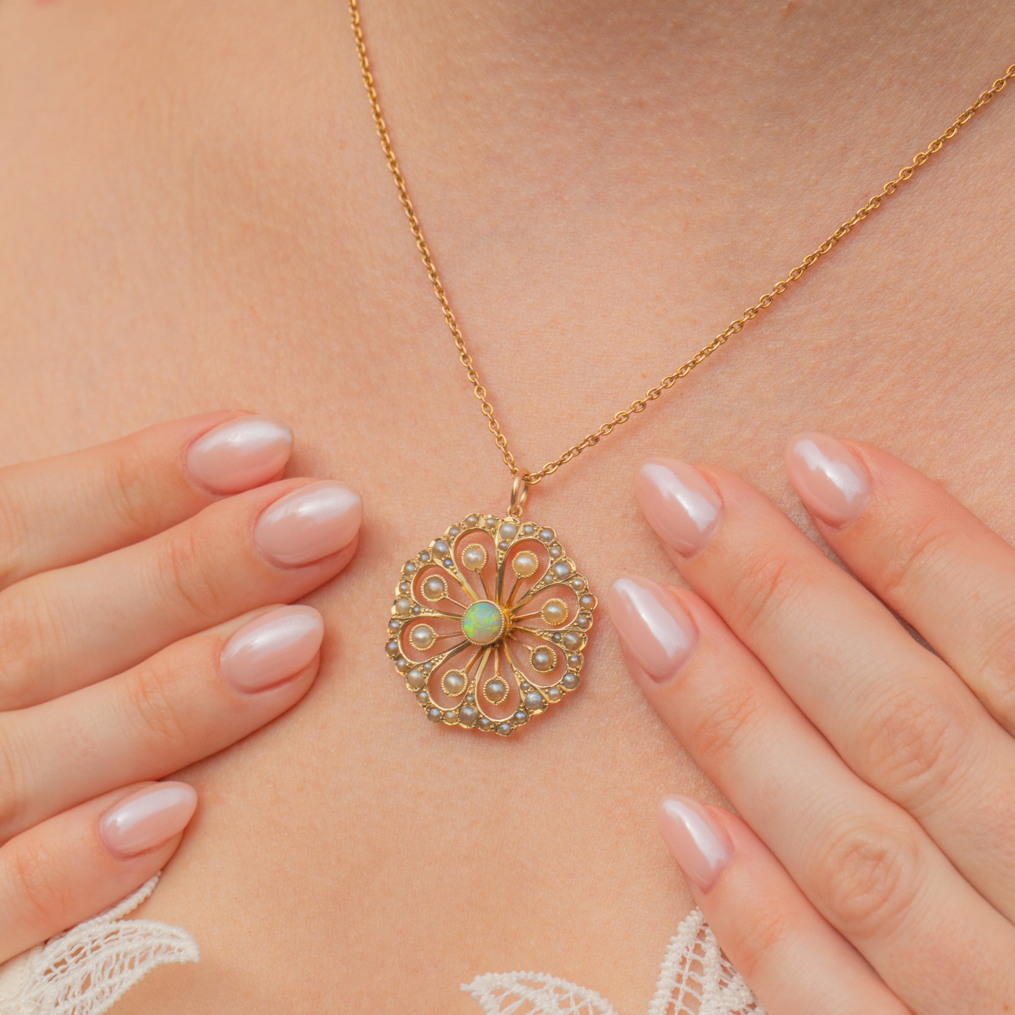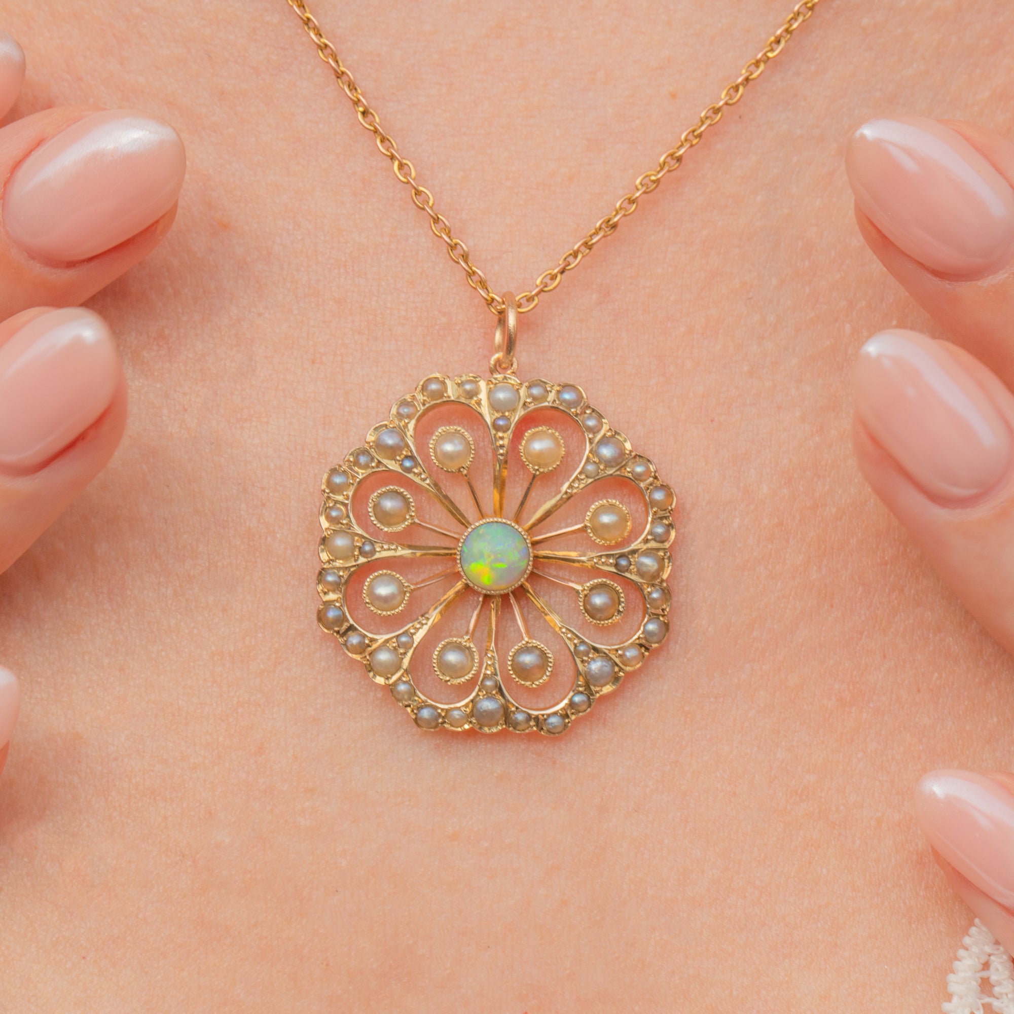 Bound together by buttery 9ct Gold, this flower pendant is nothing short of splendorous and centred by an Opal flaunting a confetti of iridescent colour, your eye will forever been drawn to her. Suspended from an antique, this Opal Pearl pendant will look sublime!