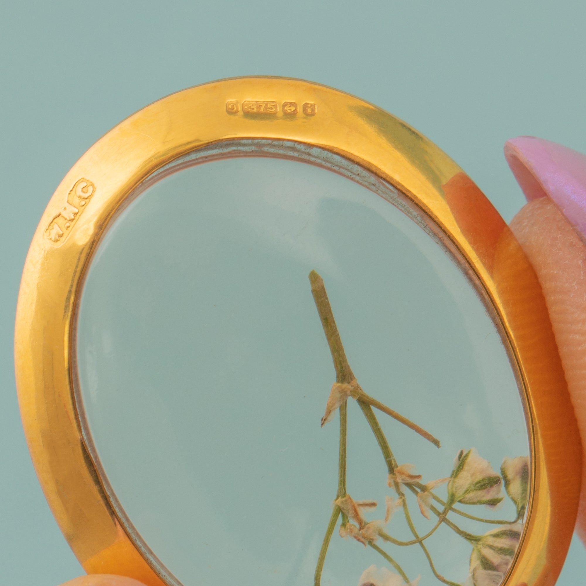 MATERIALS: 9ct Gold, Glass, Pressed Flower.