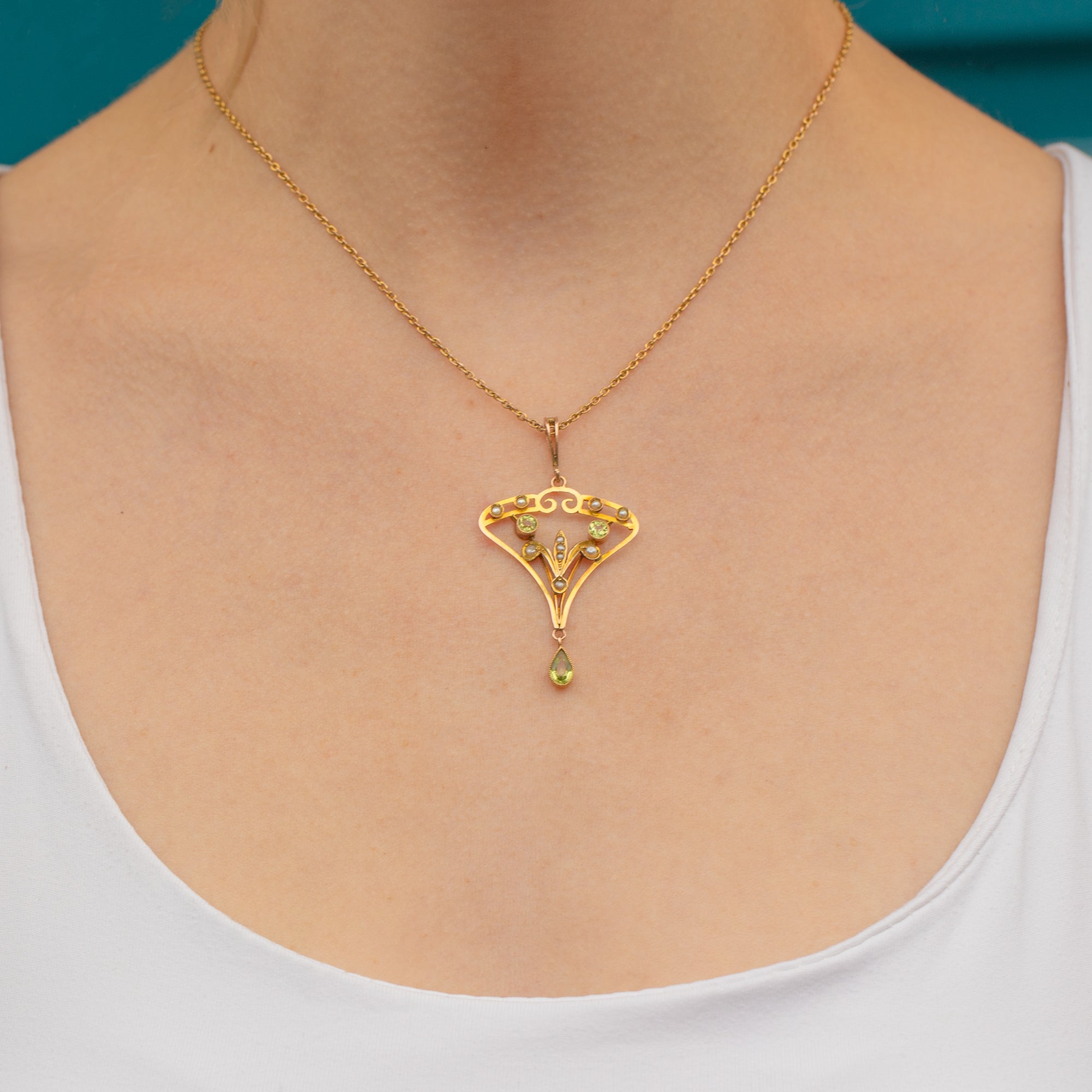 Edwardian 9ct Gold Peridot Pearl Lavalier Pendant, 0.50ct