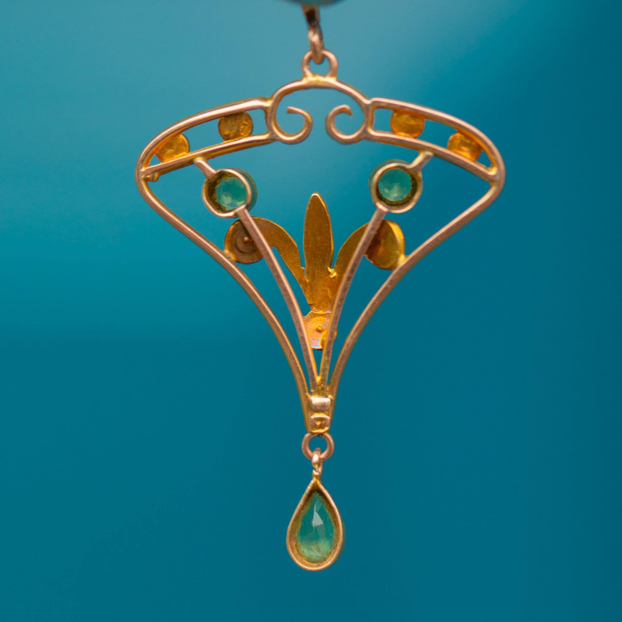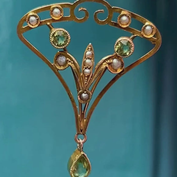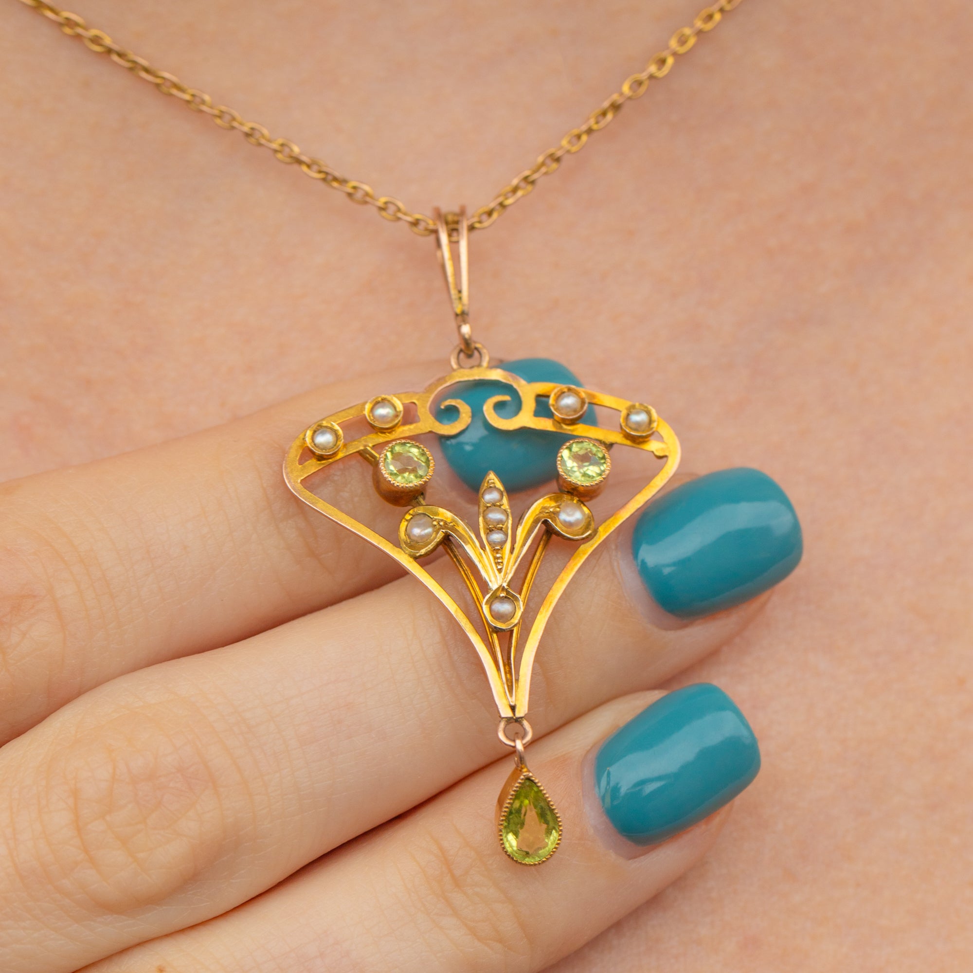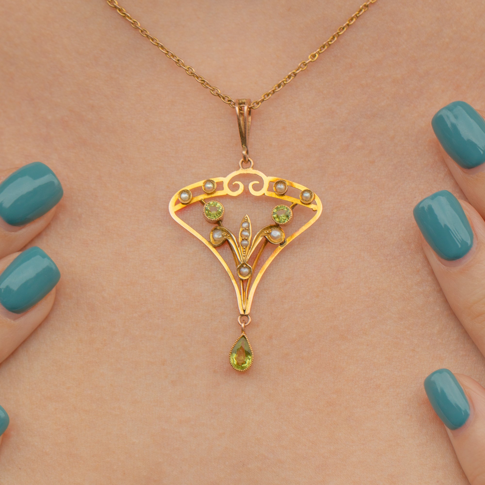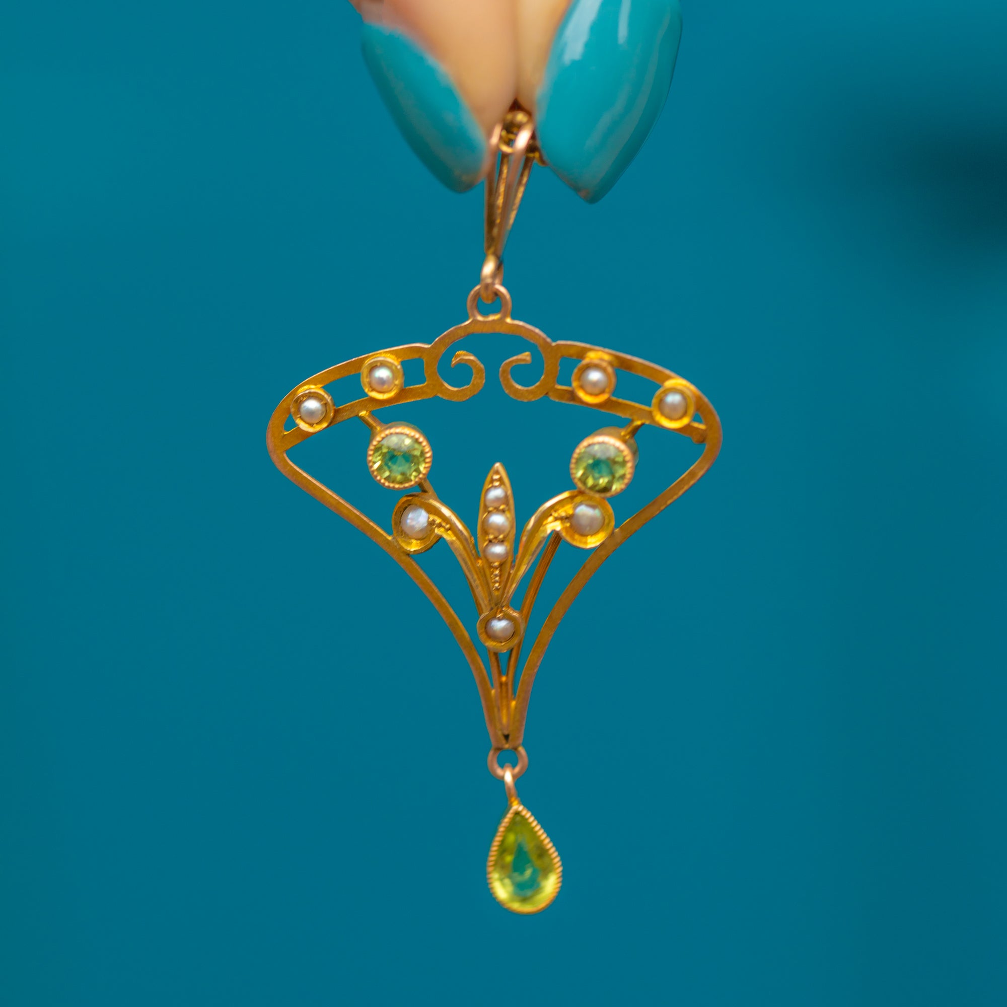 EXCELLENT. This Edwardian 9ct Gold Peridot Pearl Lavalier pendant is in excellent condition. The Peridots and Pearls are secure in their settings, without any scuffs or dings to note. The 9ct Gold has kept her richly saturated tone and is perfectly formed. All in all, an immaculate Edwardian pendant ready to be welcomed into your antique jewellery collection!