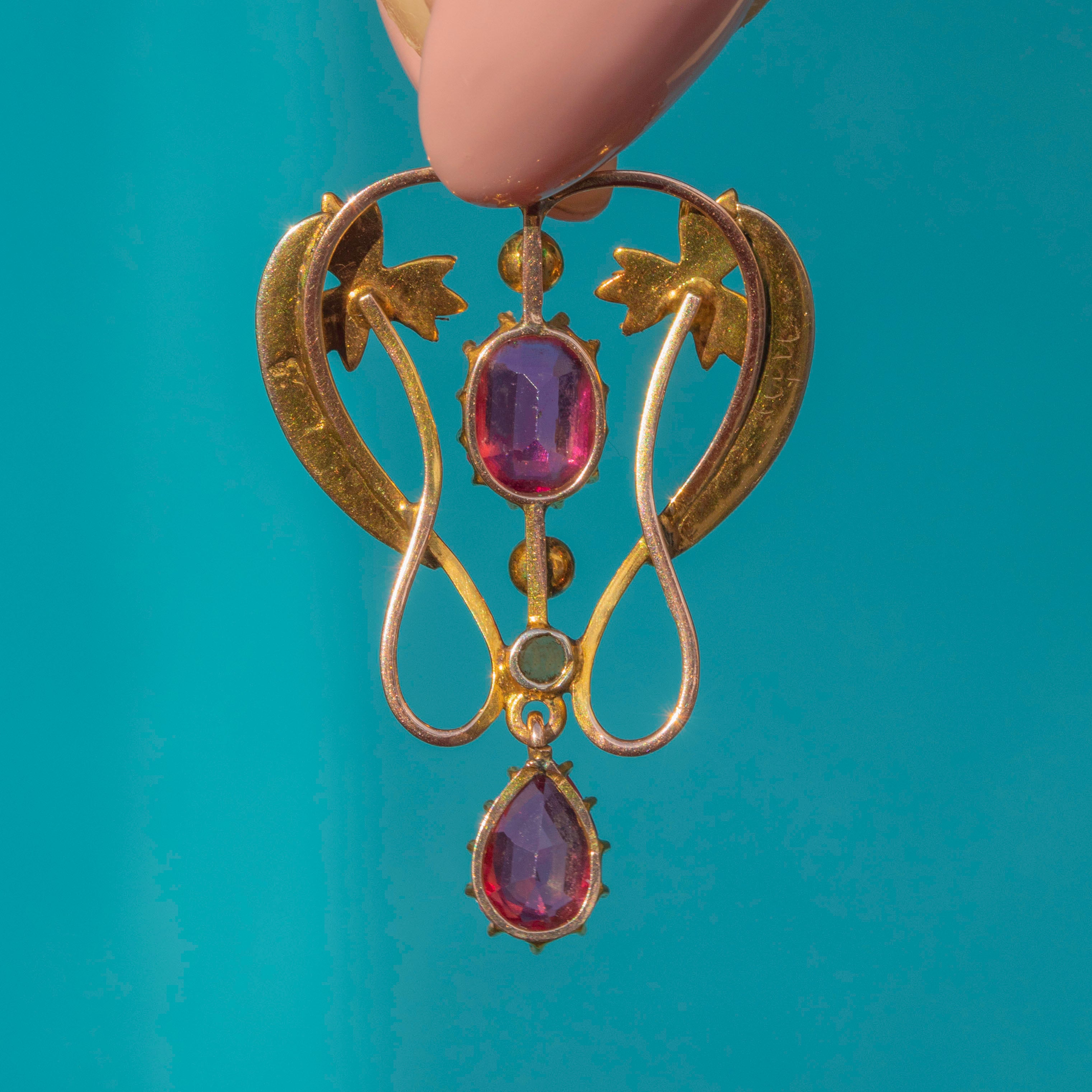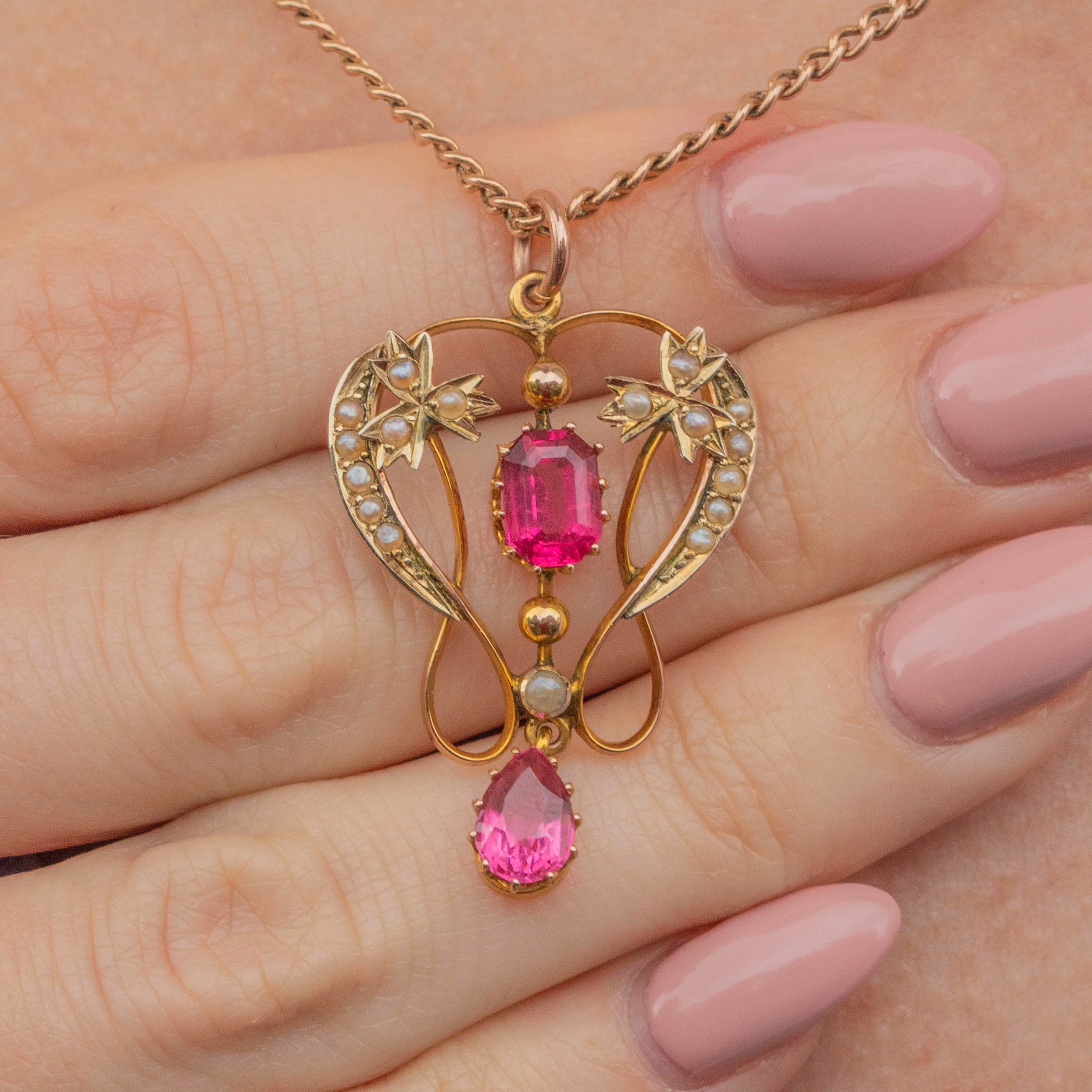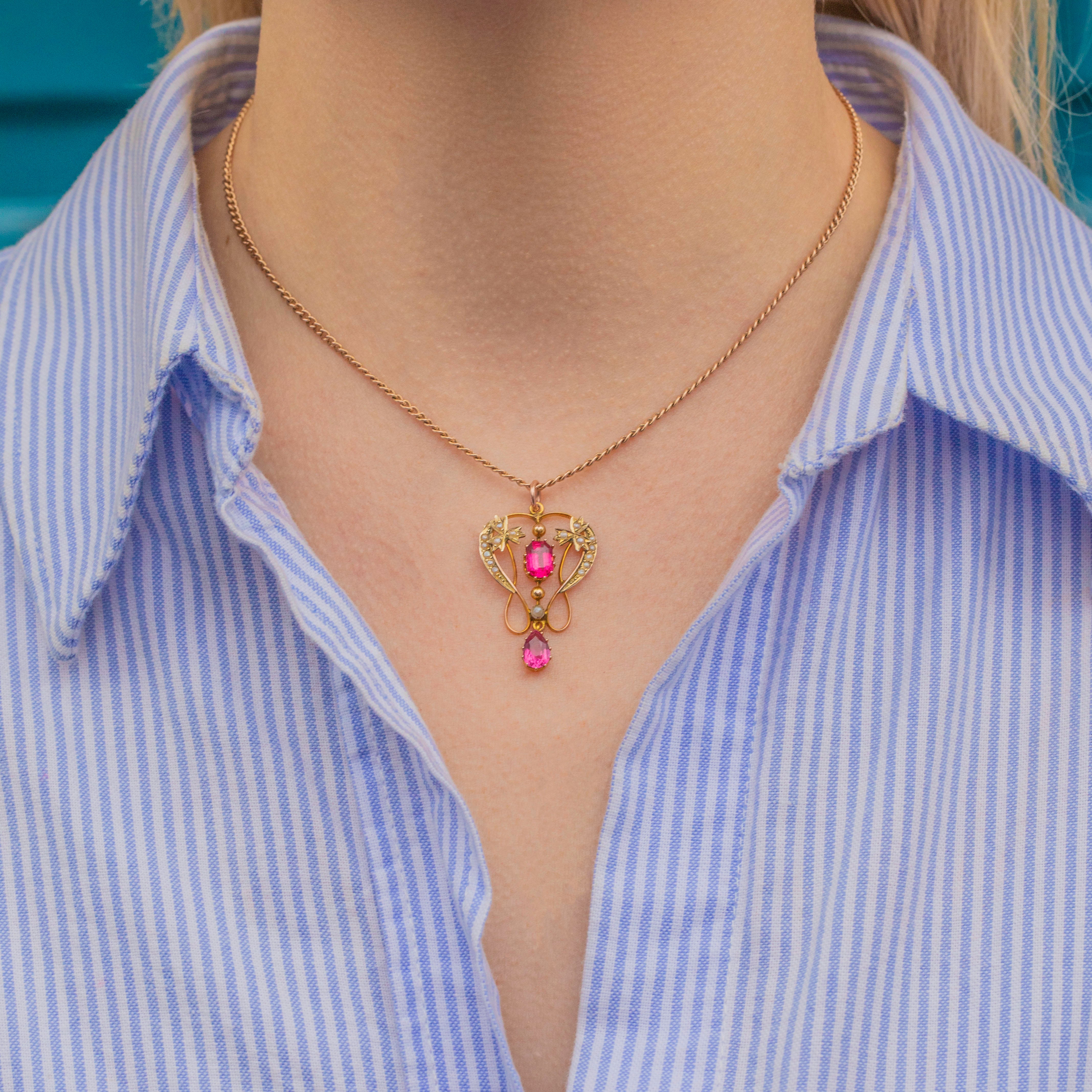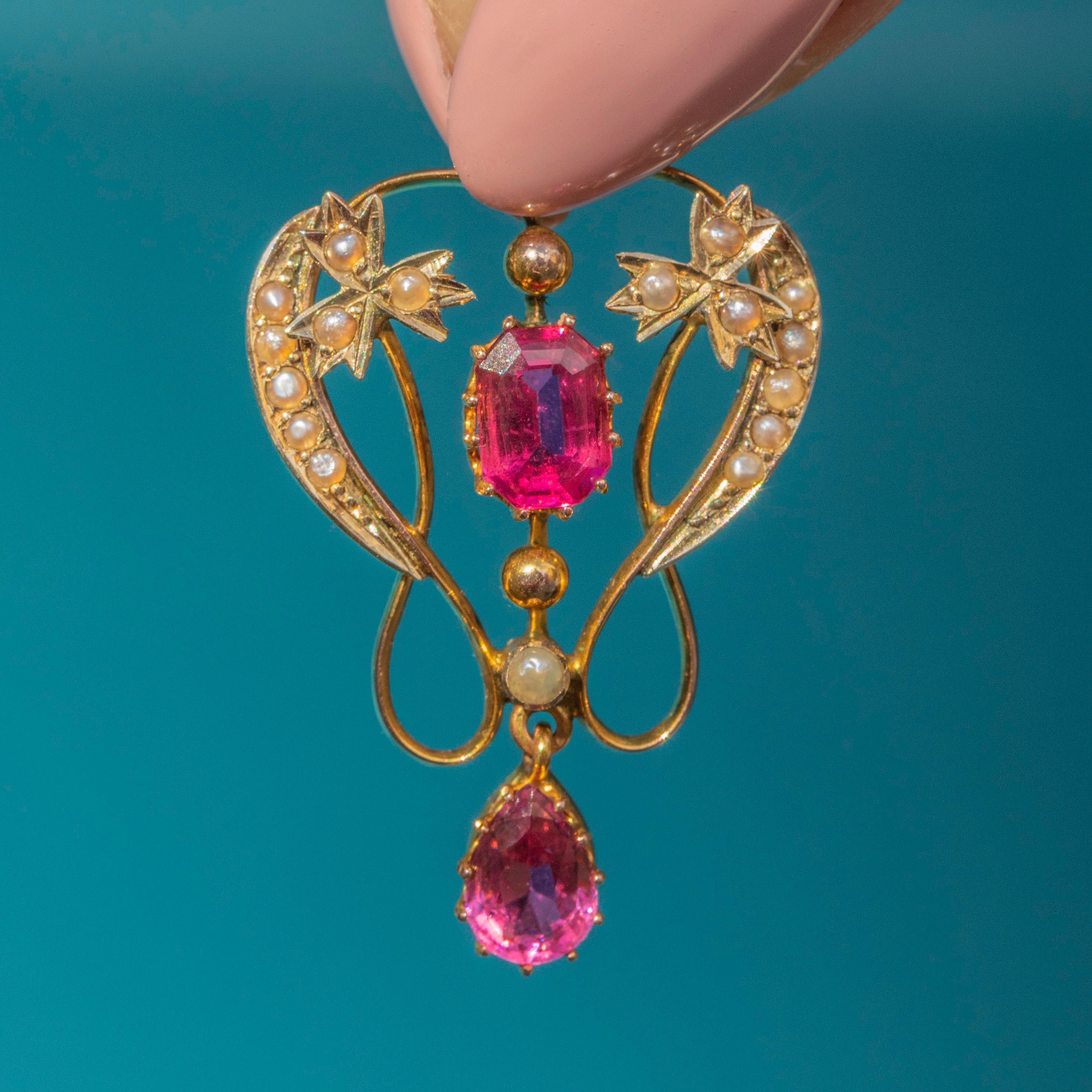 Edwardian 9ct Gold Pink Tourmaline Pearl Lavalier Pendant