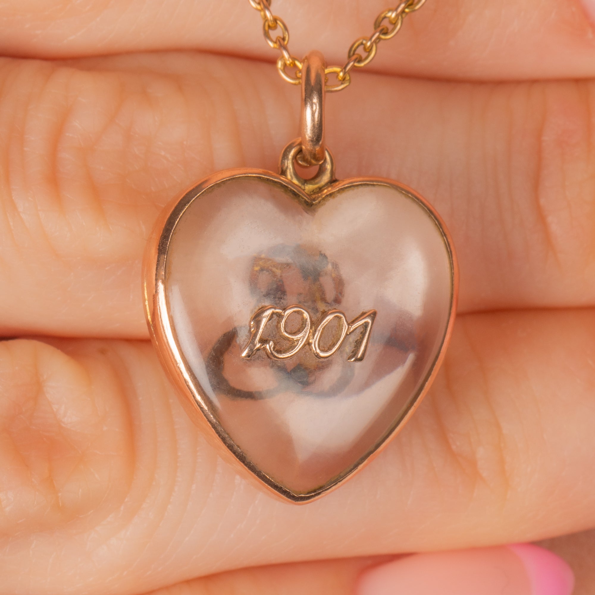 GOOD. This Edwardian heart is in good overall condition. Whilst the 9ct Gold body of the piece is smooth and the Gold detailing on either side of the locket is present. The date has been screwed into the Rock crystal, and because of this tension a crack has formed. Rest assured, the piece can be worn confidently and it's only when you look up close that you notice it. The locket closes securely, making this a lovely choice for your collection!