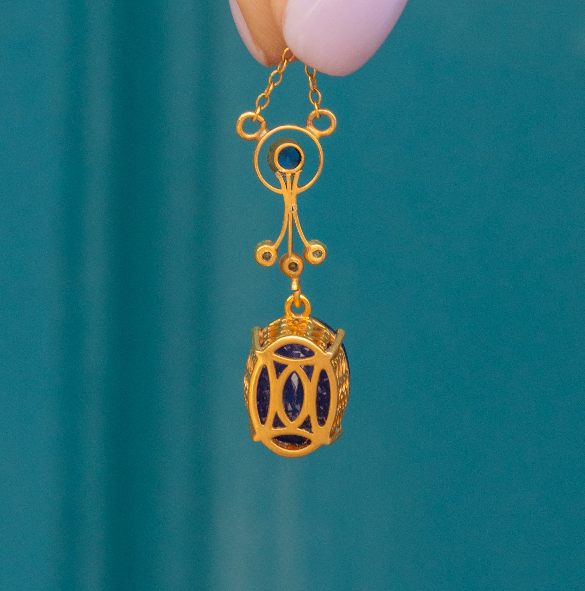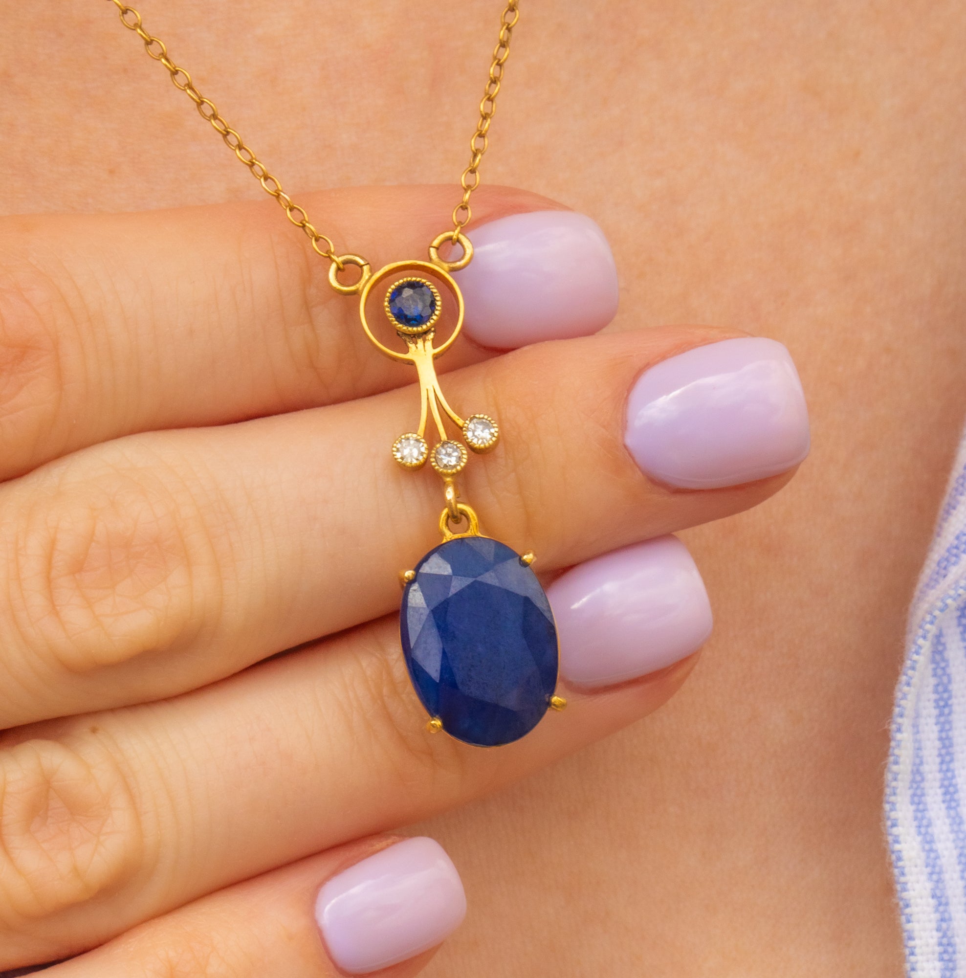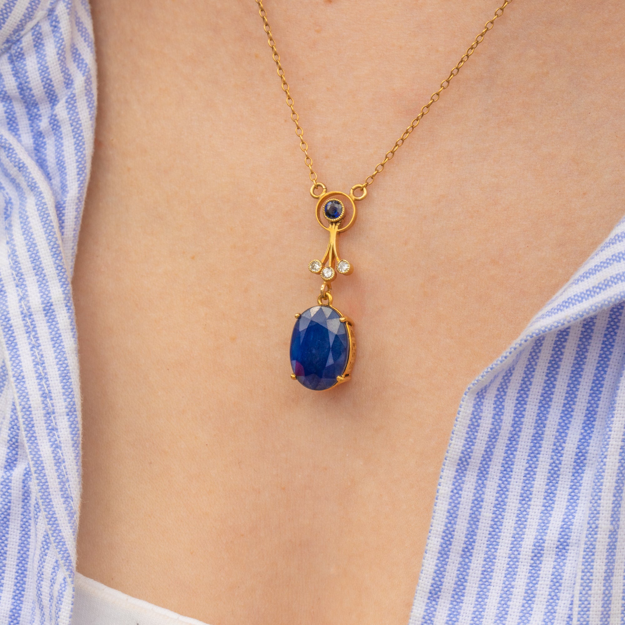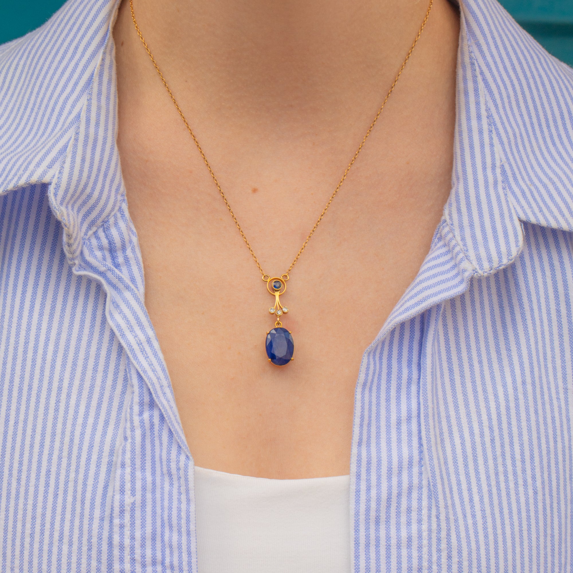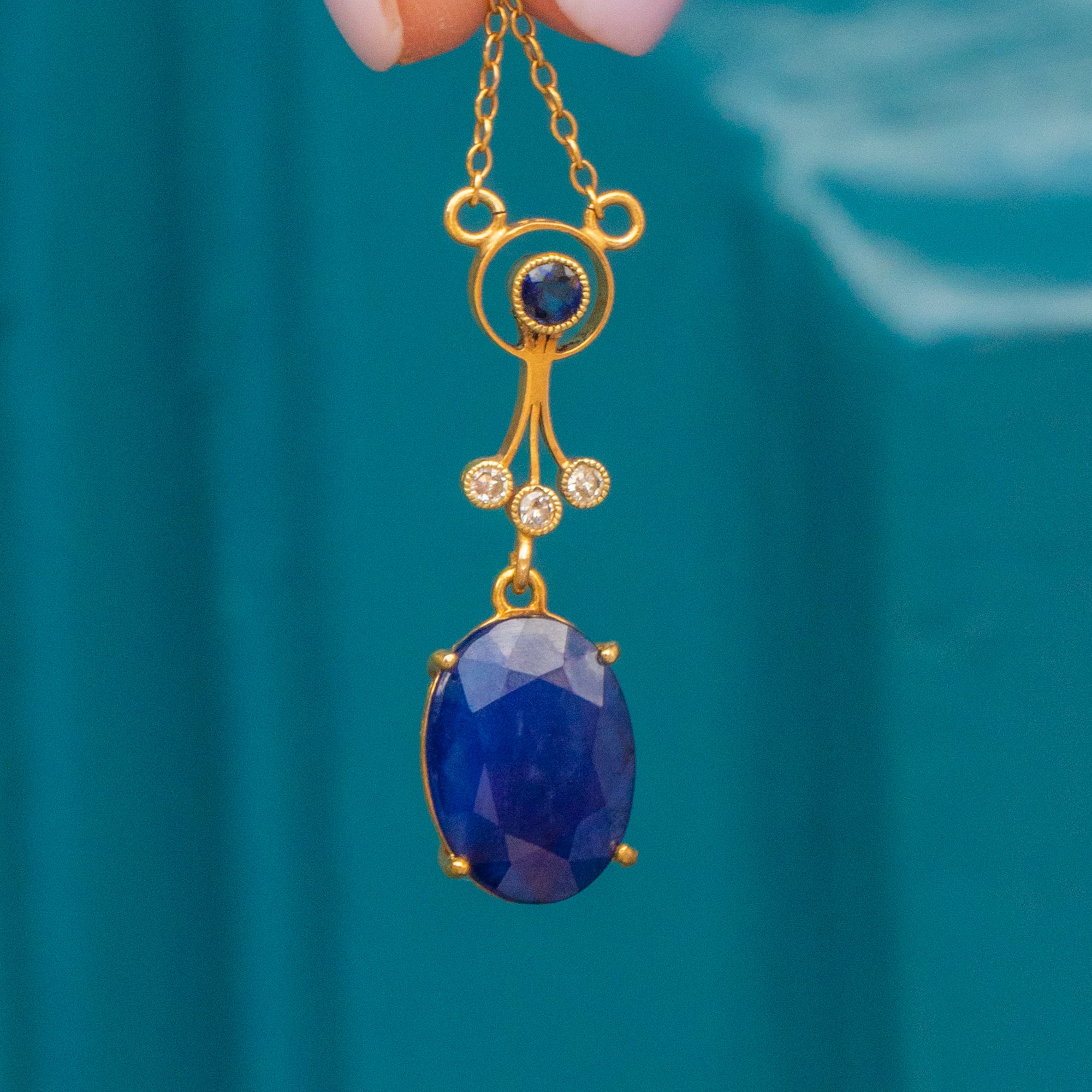 Edwardian 9ct Gold Sapphire Diamond Drop Necklace, 4.50ct Sapphire