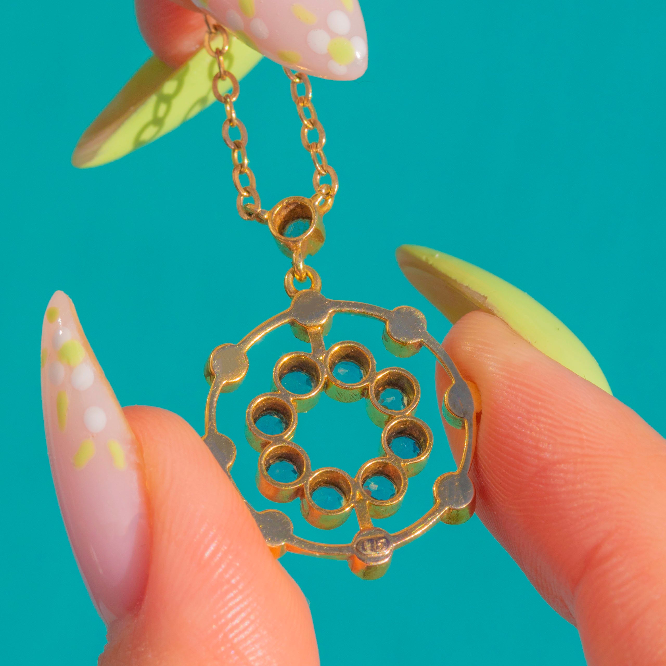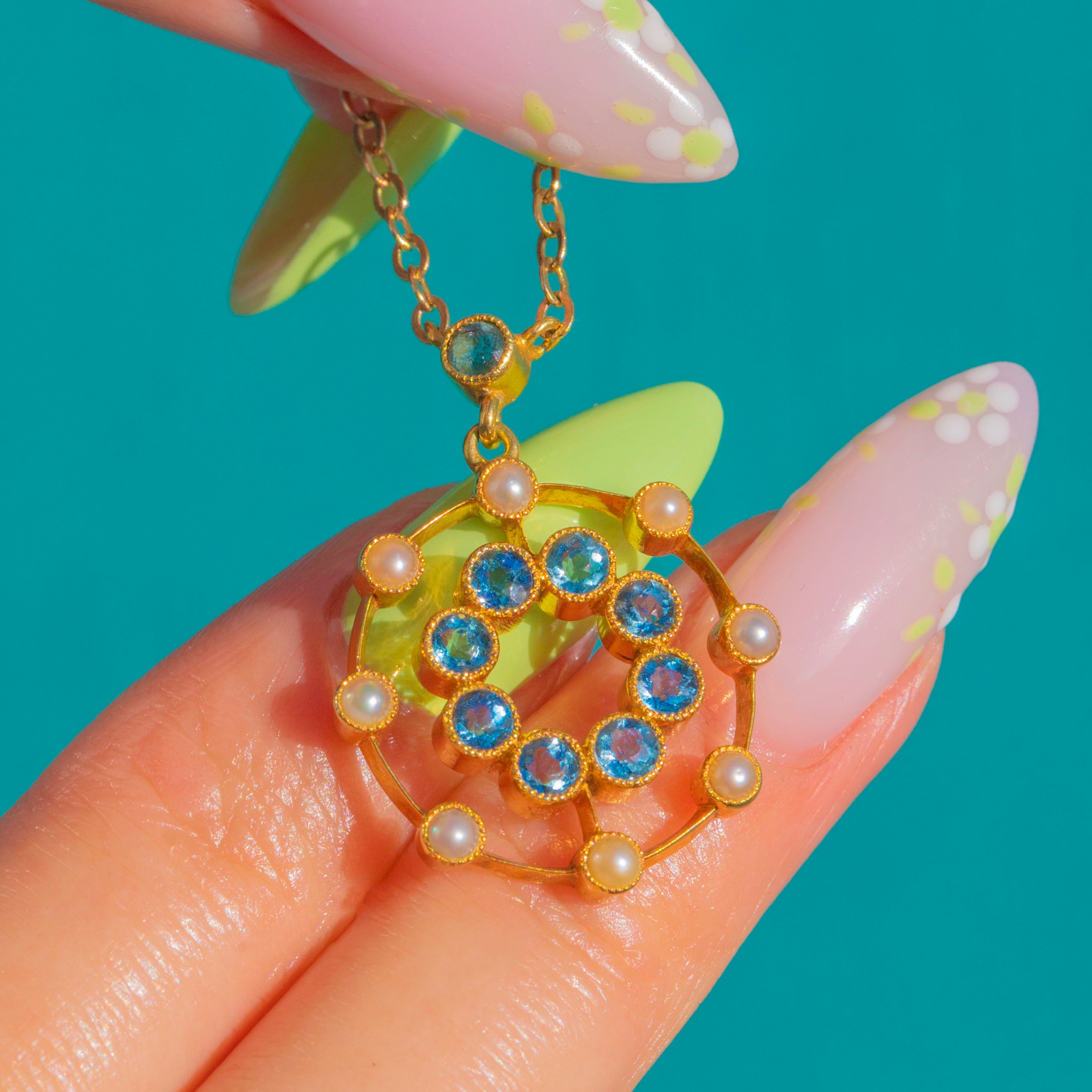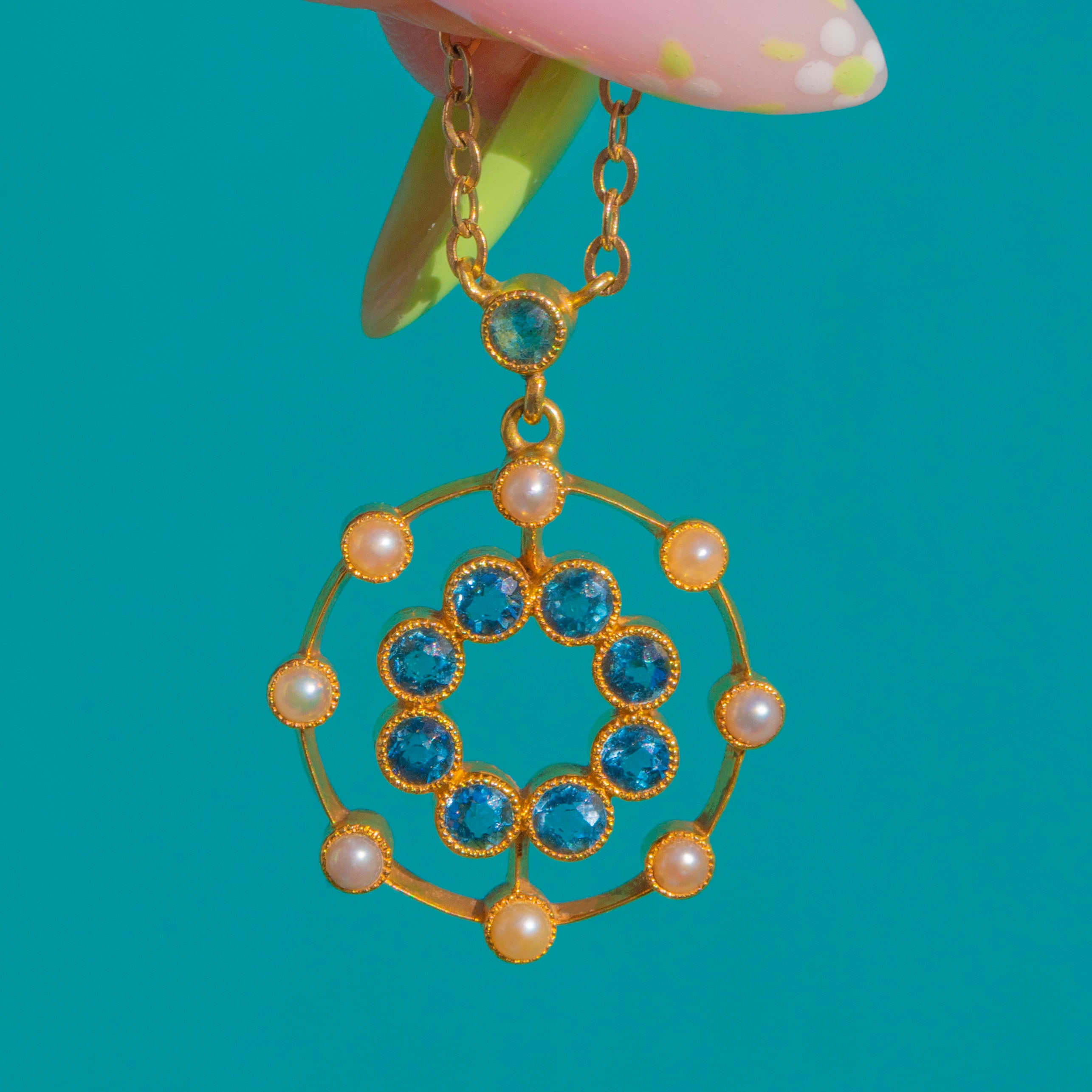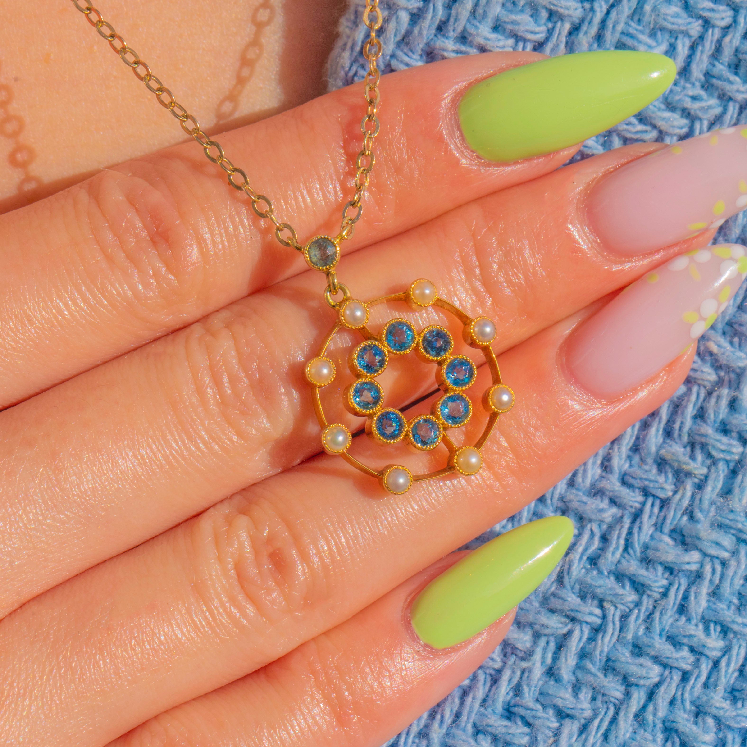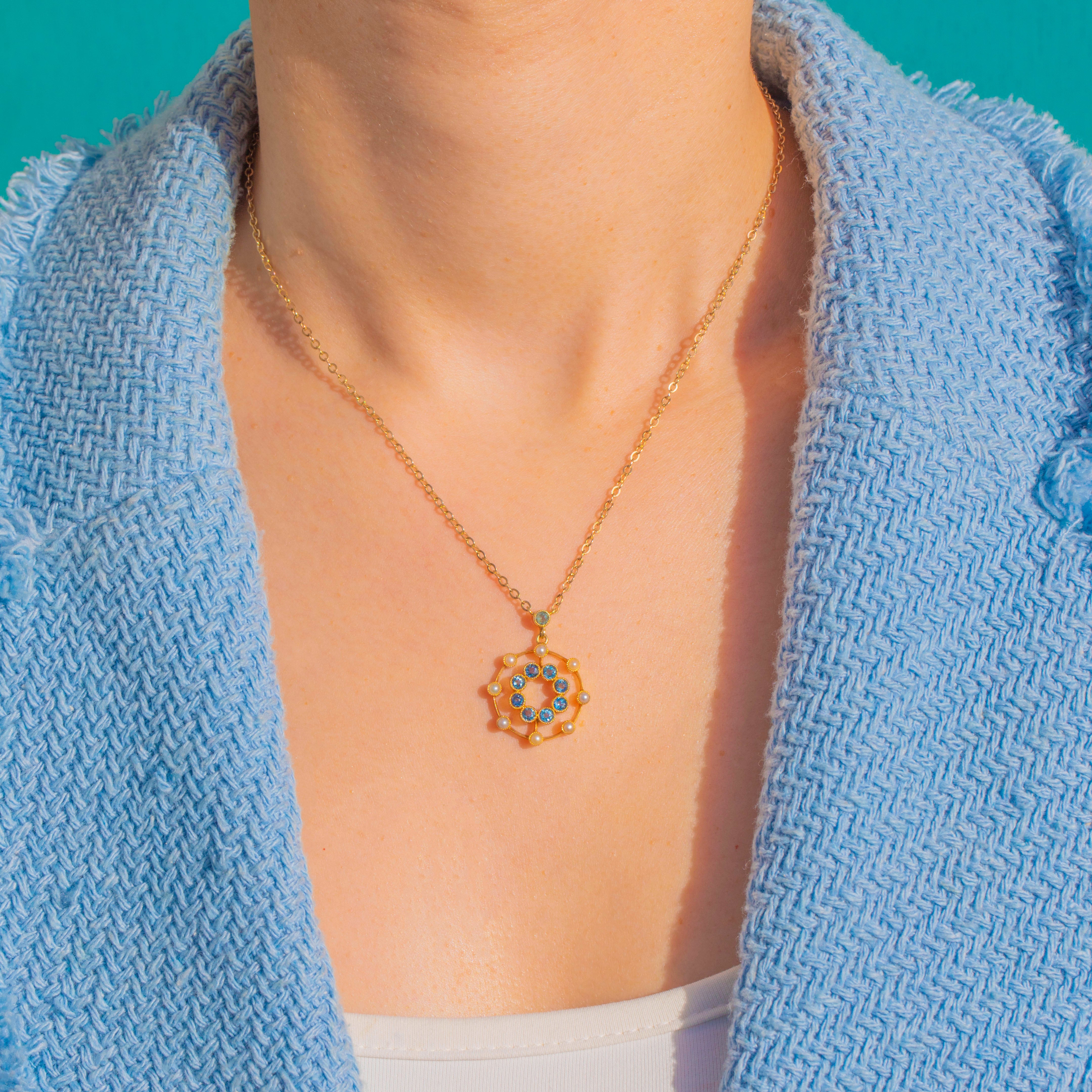 A romantic Edwardian rosette rendered in rich 15ct Gold, this pendant blooms with sky-blue Aquamarines framed by a halo of creamy Seed Pearls. The openwork concentric design feels airy and elegant, with milgrain-detailed collet settings lending that refined, lace-like finish we adore from the period.