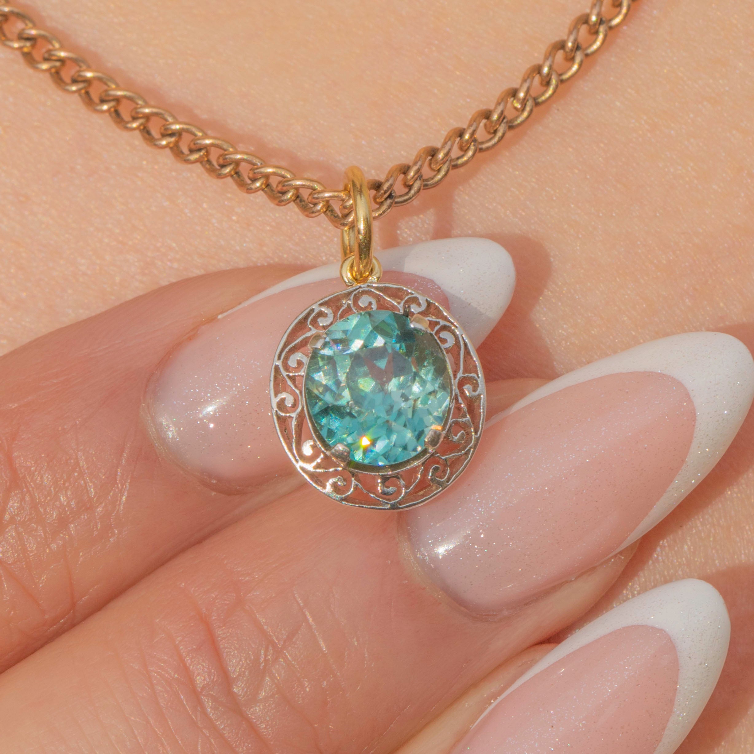 VERY GOOD: This Edwardian blue Zircon filigree charm is in wonderful condition. Wonderfully crafted, the Zircon sits securely within its settings. There are some small fleabites to the surface of the gemstone, though this is difficult to spot without a loupe. Gorgeous colour and life in the 1.30ct Zircon. With a well-soldered jump ring, you can wear this antique charm with confidence!