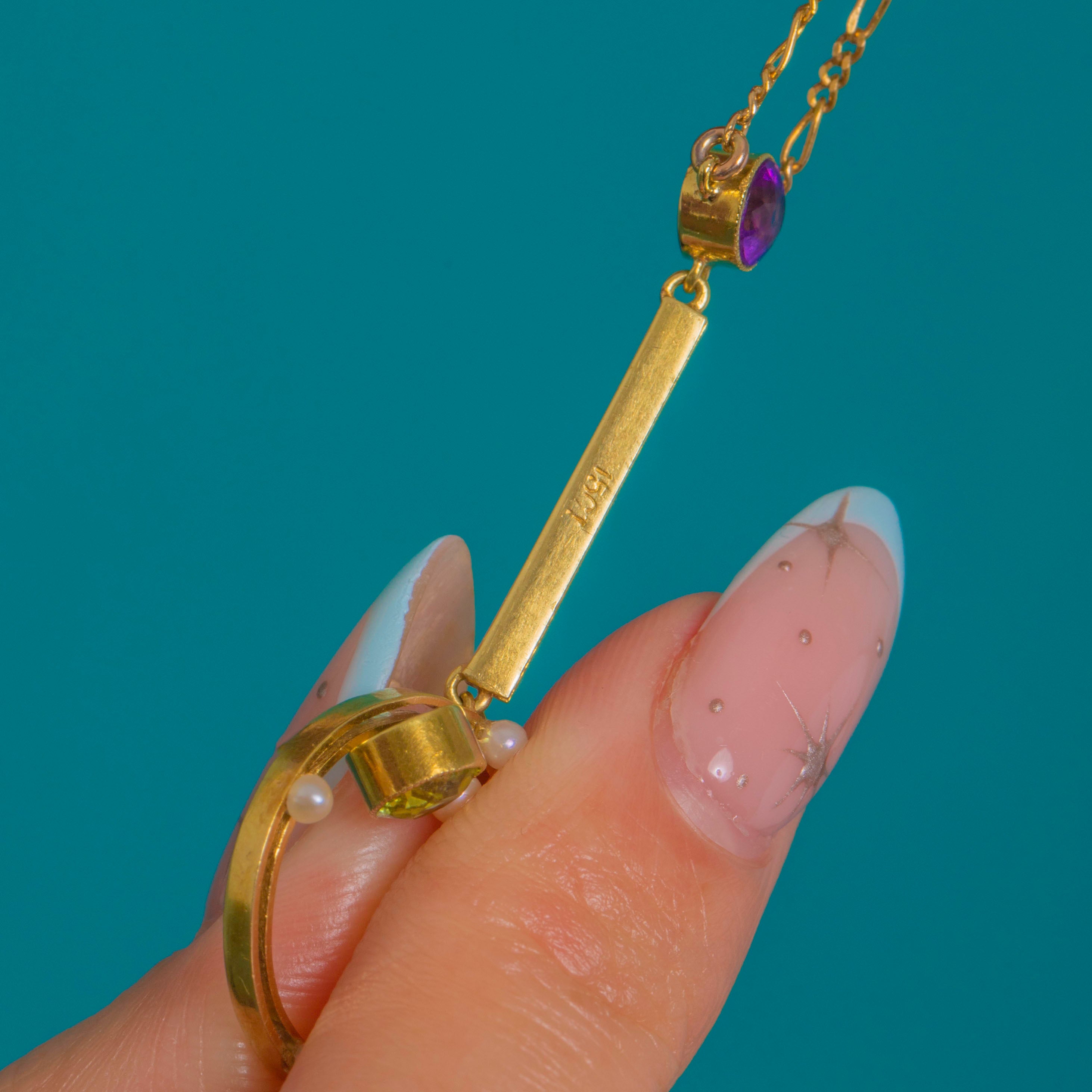 A graceful Edwardian necklace in softly glowing 15ct Gold, this articulated drop marries delicate geometry with a luminous Suffragette palette. A round Amethyst crowns a slender bar above a circular frame dotted with petite Seed Pearls, while a vivid Peridot is suspended at the centre, dancing with every movement. Open-backed, bezel settings invite the light to flow through the stones, enhancing their colour and sparkle.