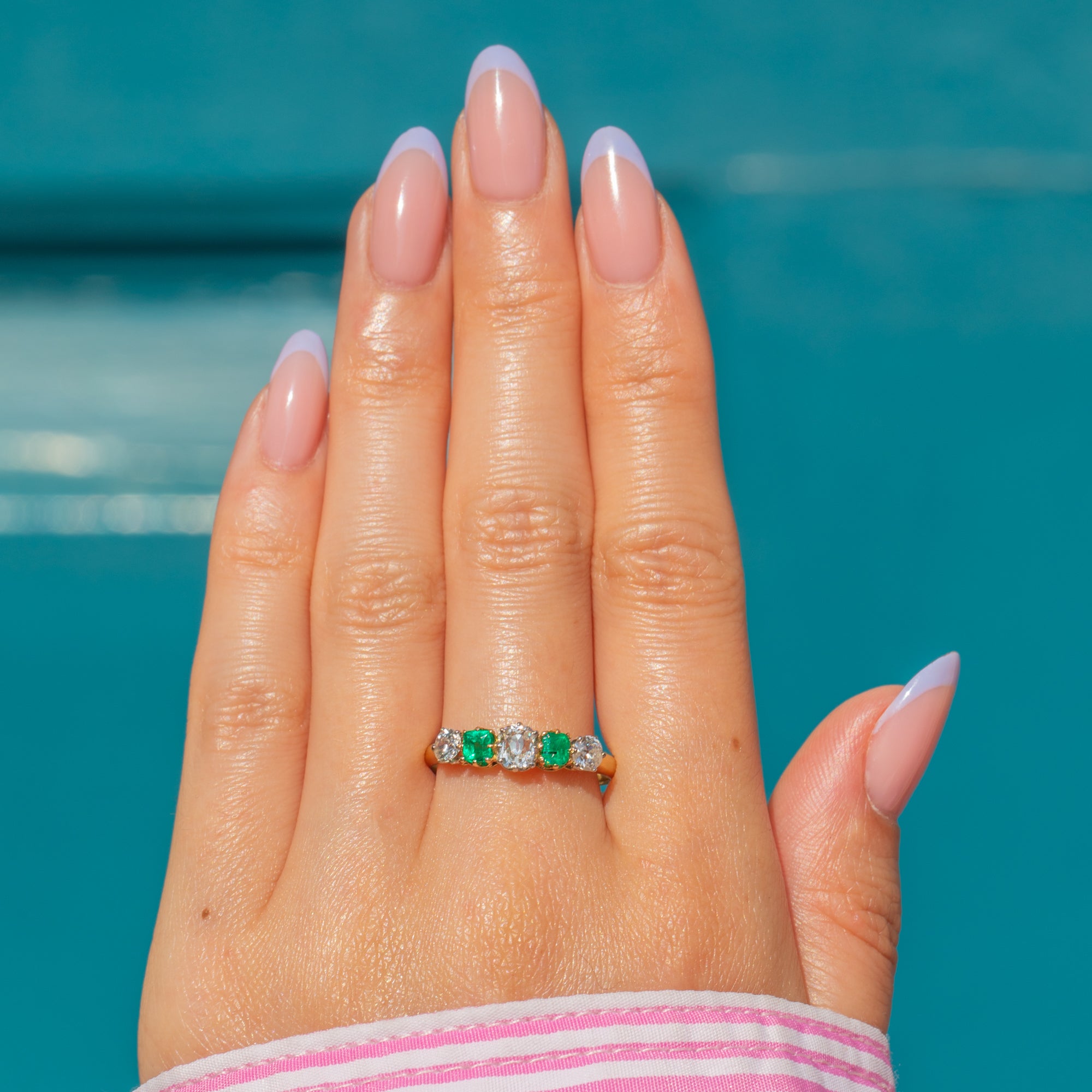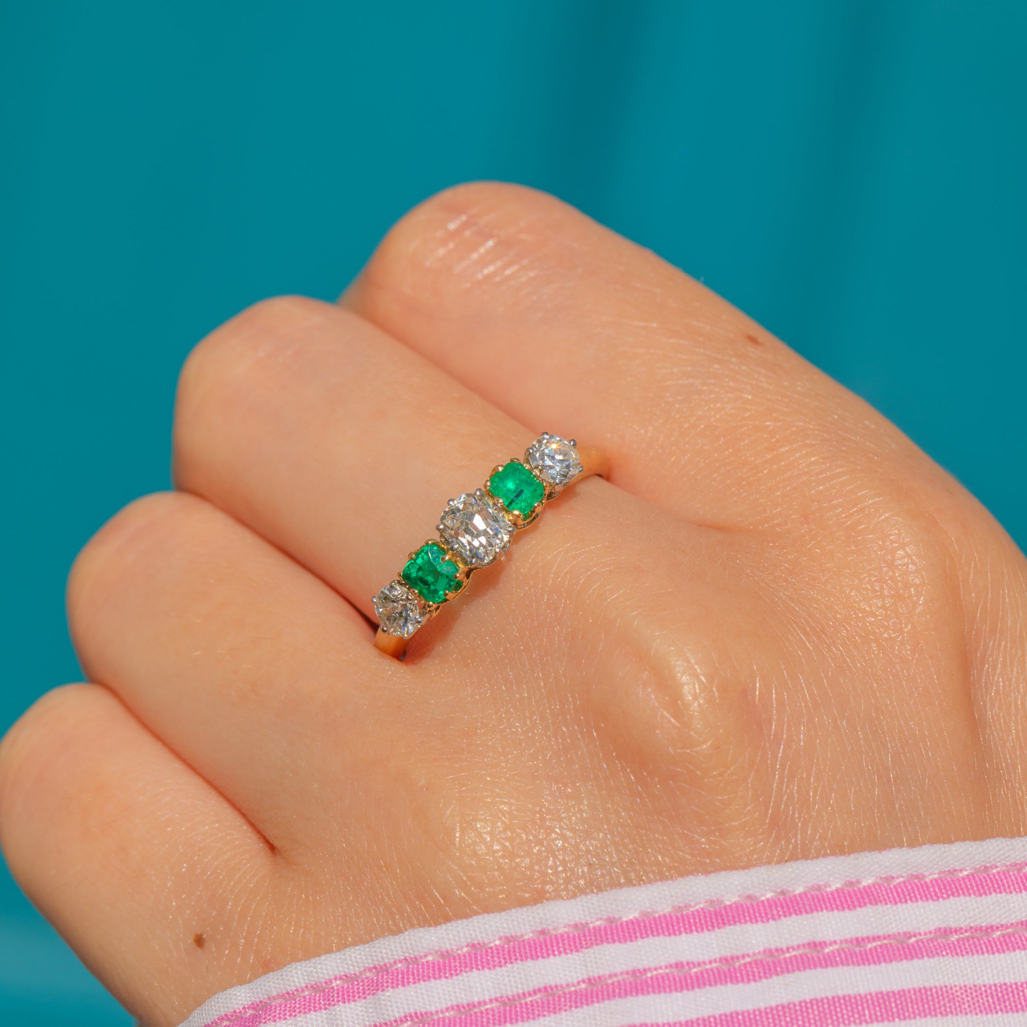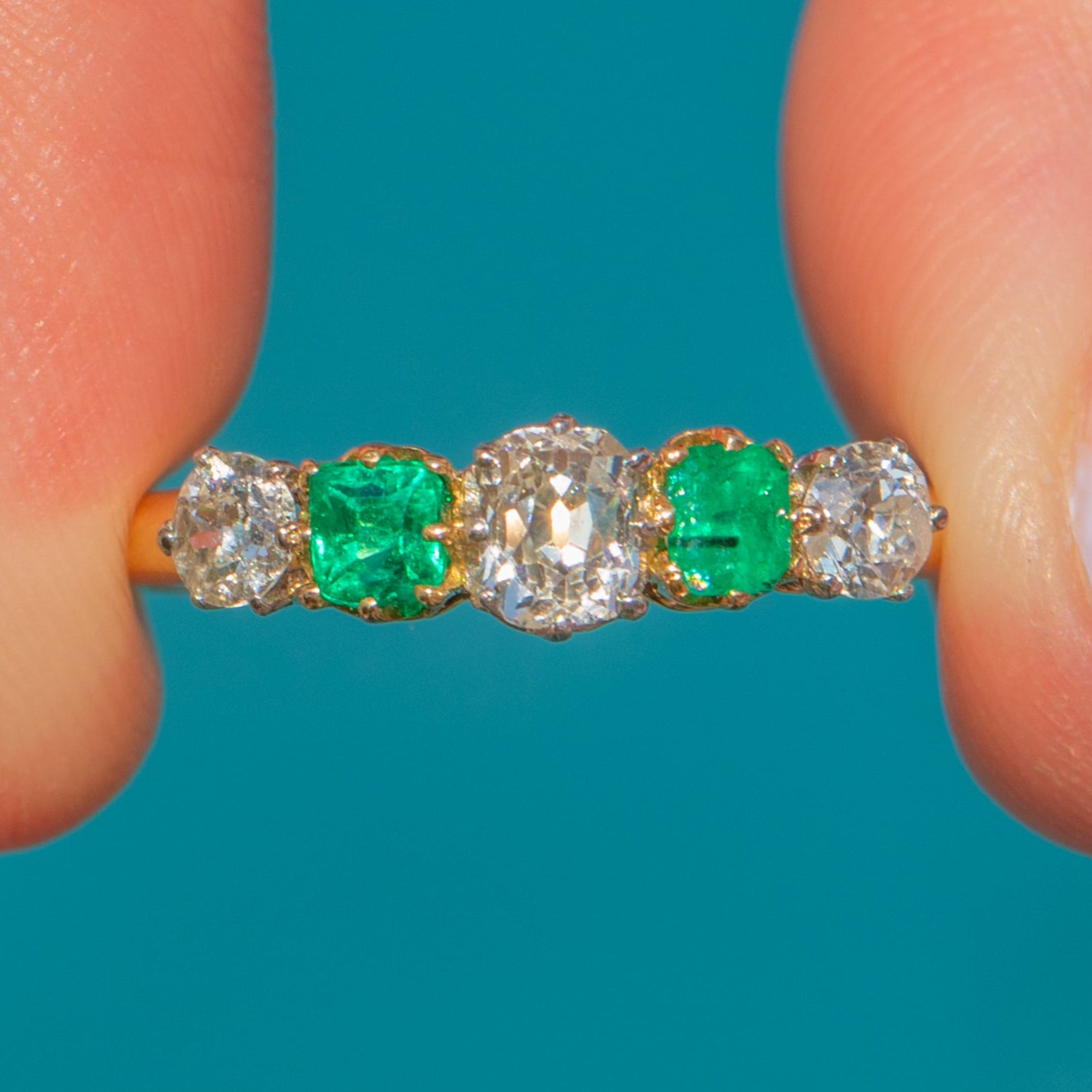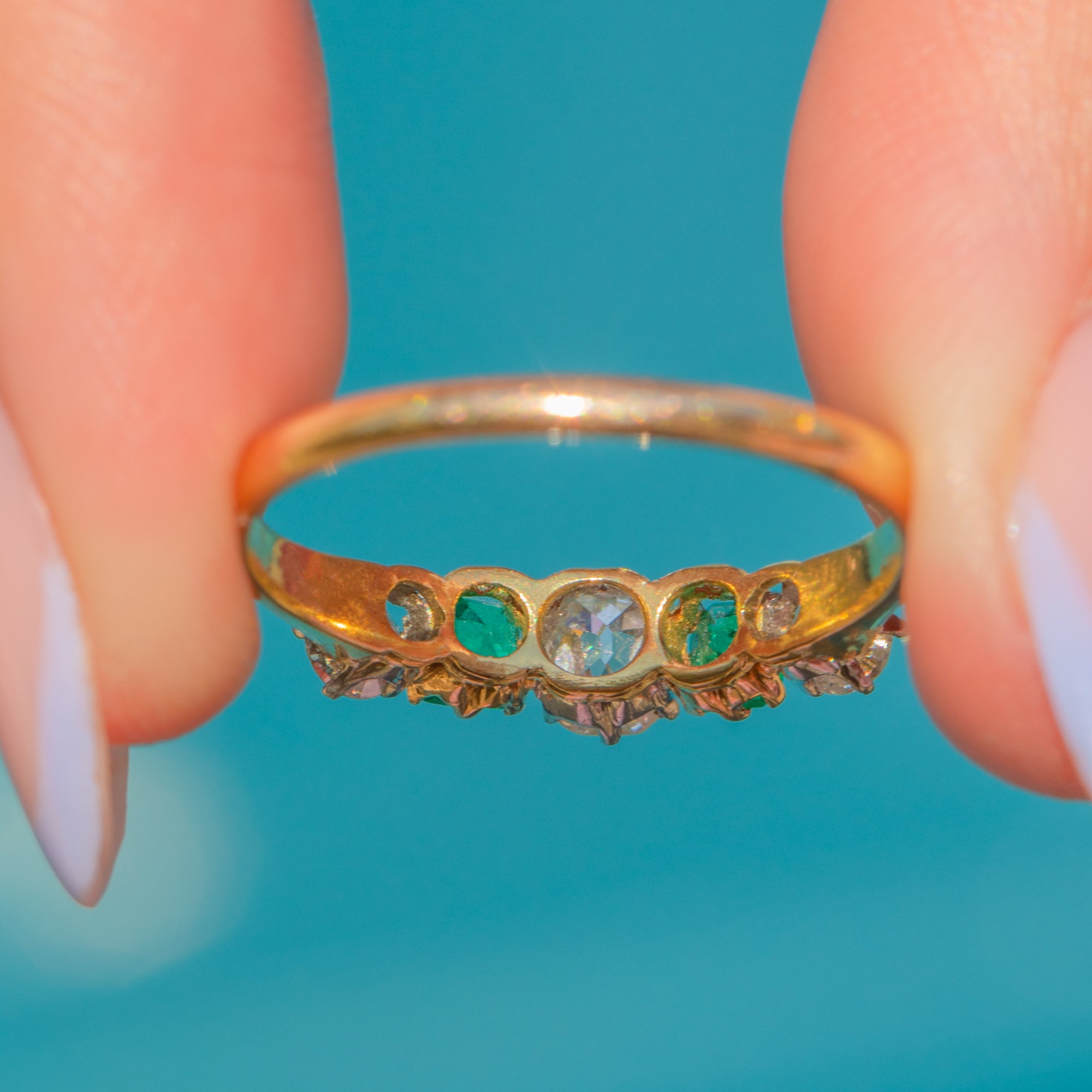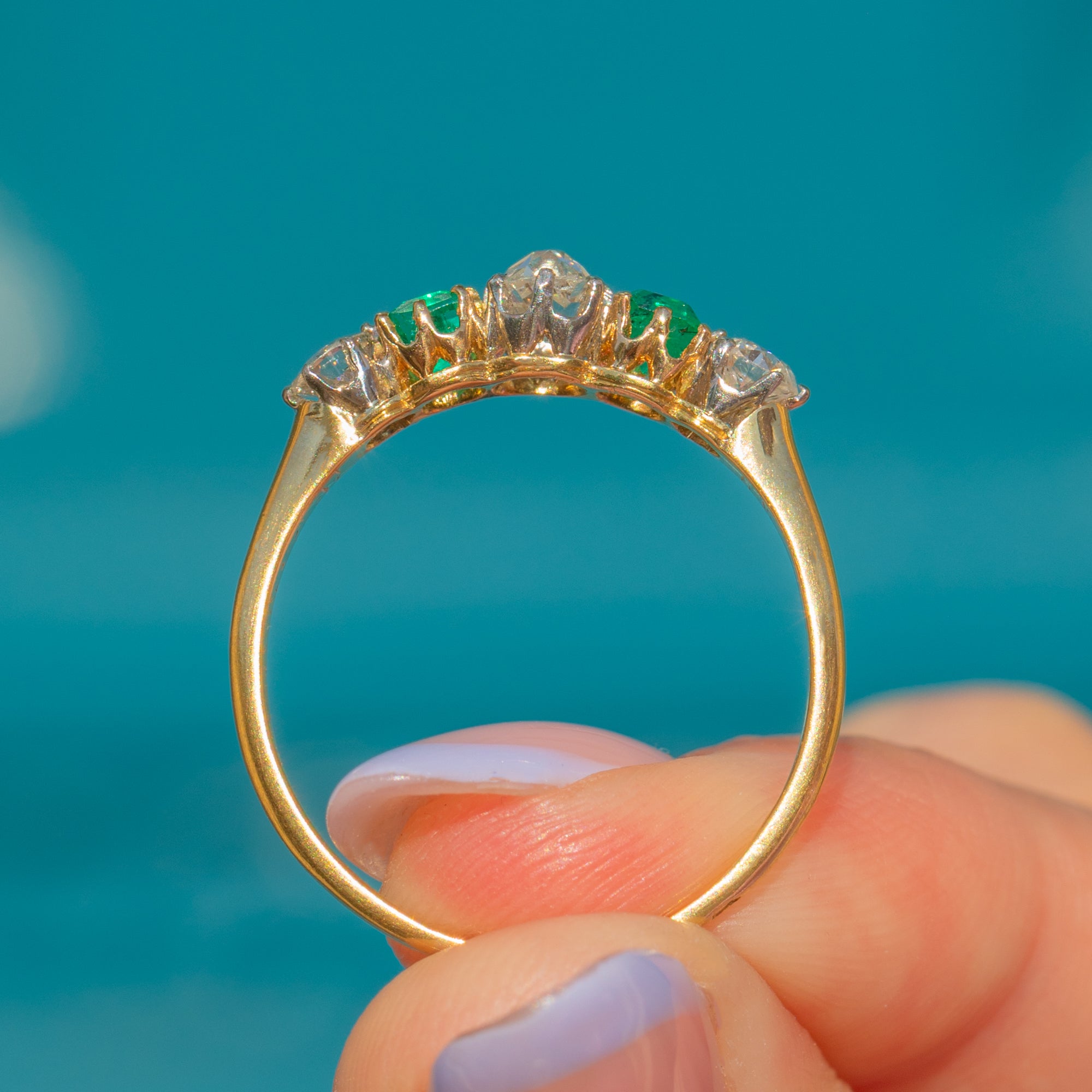 This antique French 18ct Gold Emerald Diamond five stone ring is a feast for the eyes! An impressive example of Edwardian craftsmanship, this ring has been set with two vibrant Emeralds and 0.65cts of dazzling Old-Mine and Old-European cut Diamonds to create a striking five stone display.