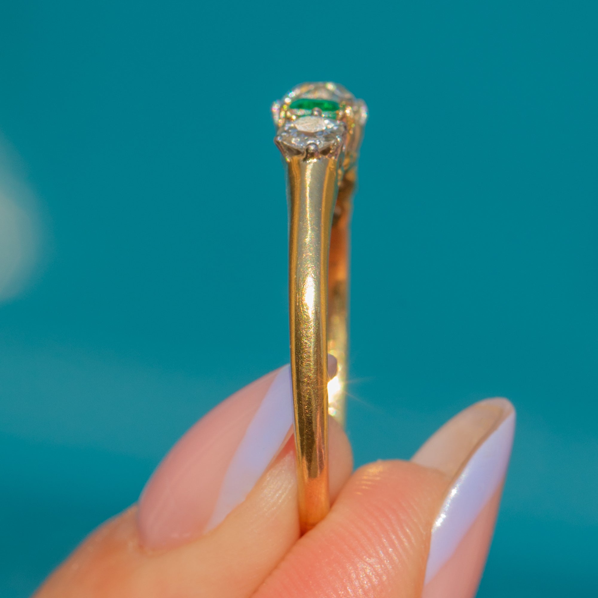 VERY GOOD: This Edwardian French 18ct Gold Emerald Diamond five stone ring is in very good condition. Each of her gemstones are radiant and securely set in their Platinum claws. One of the Emeralds has a small inclusion - a feature prevalent in this gemstone that we like to see as a little nod to mother nature! There is evidence of a previous resize which has been completed in 15ct Gold, though this cannot be seen when wearing. A gorgeous piece, this antique ring is a must-have!