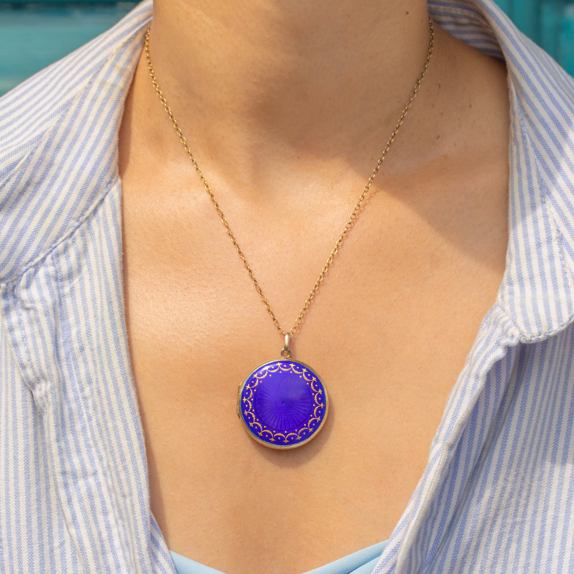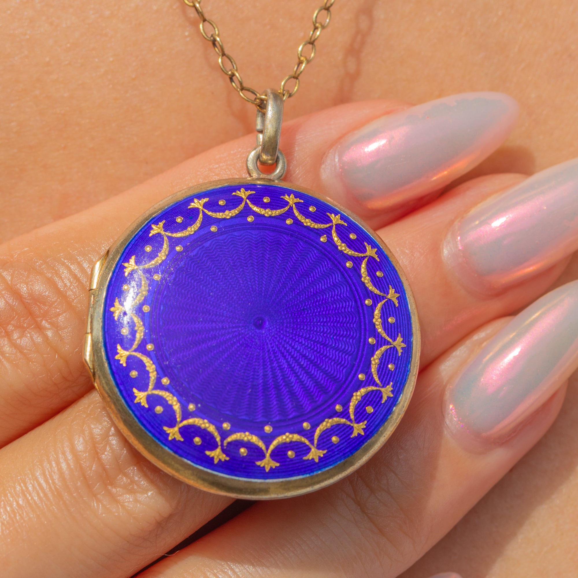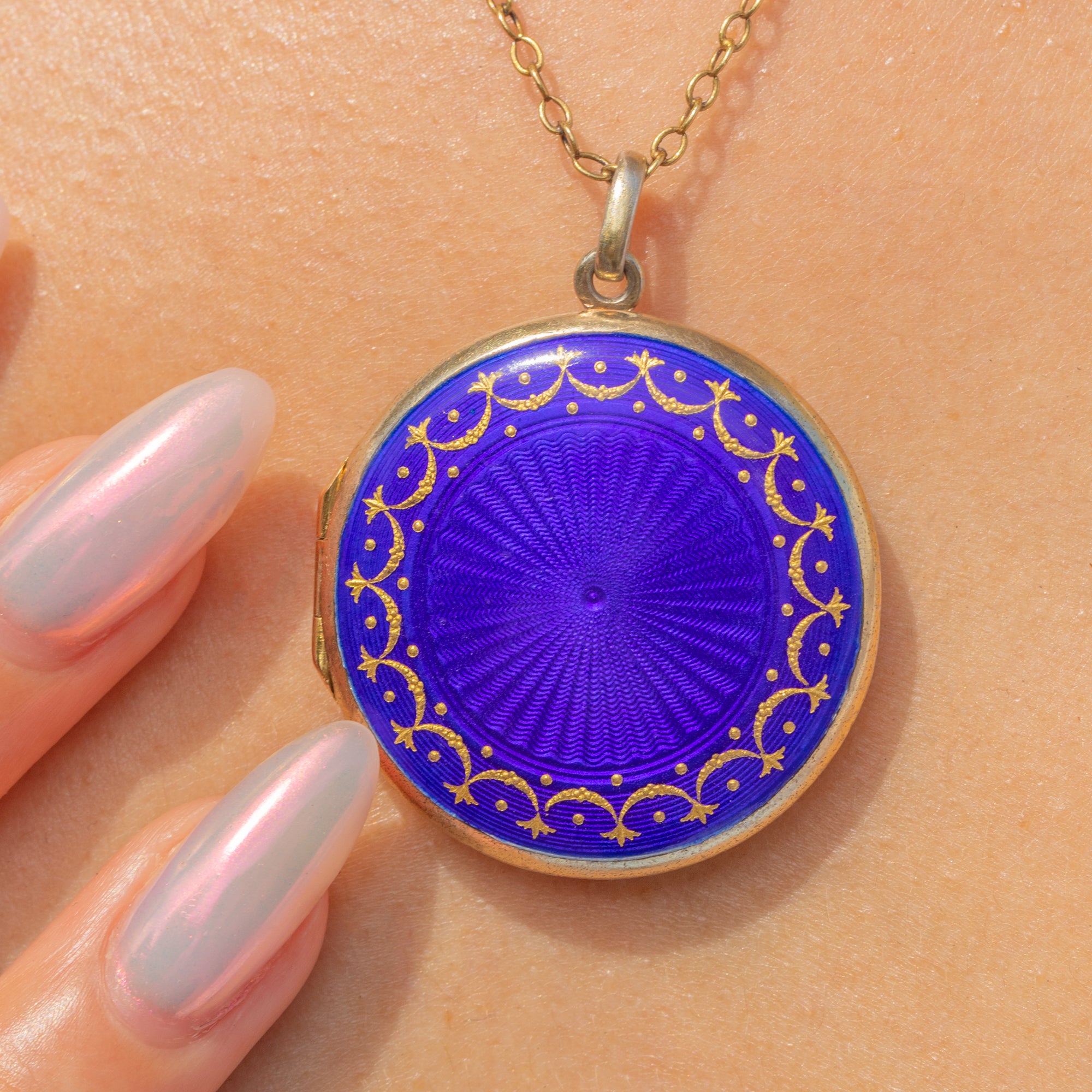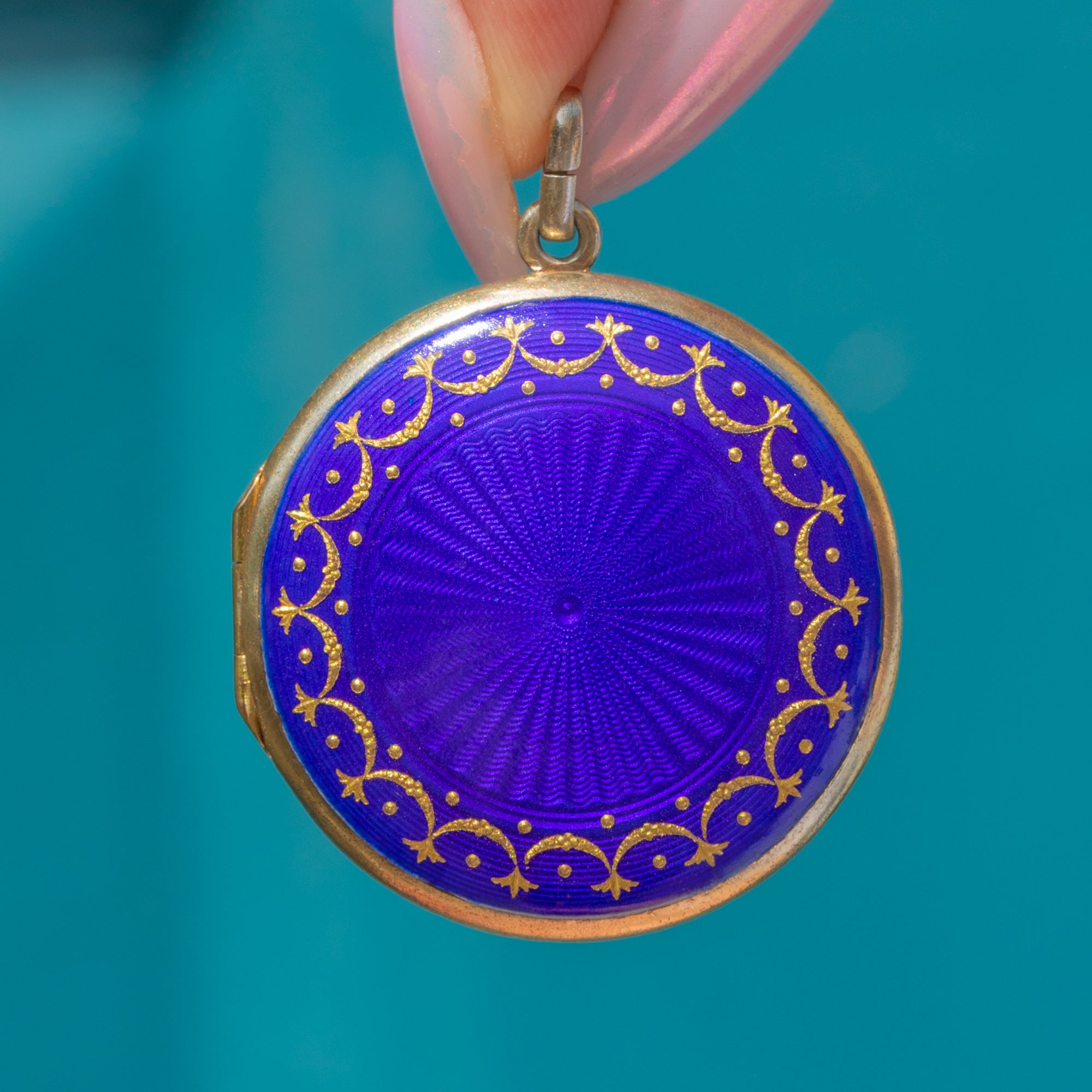 Edwardian Royal Blue Guilloche Enamel Locket with Gold Trim