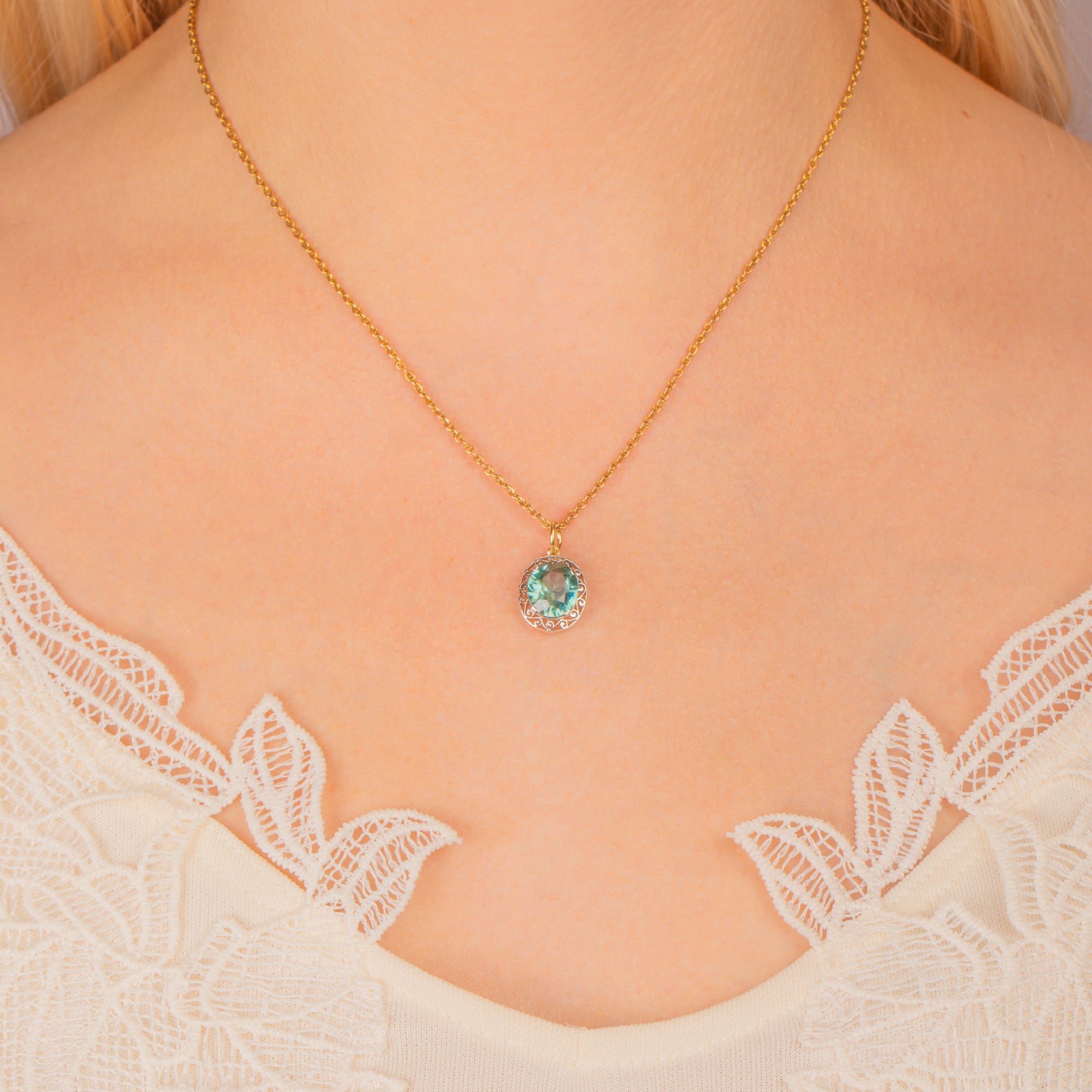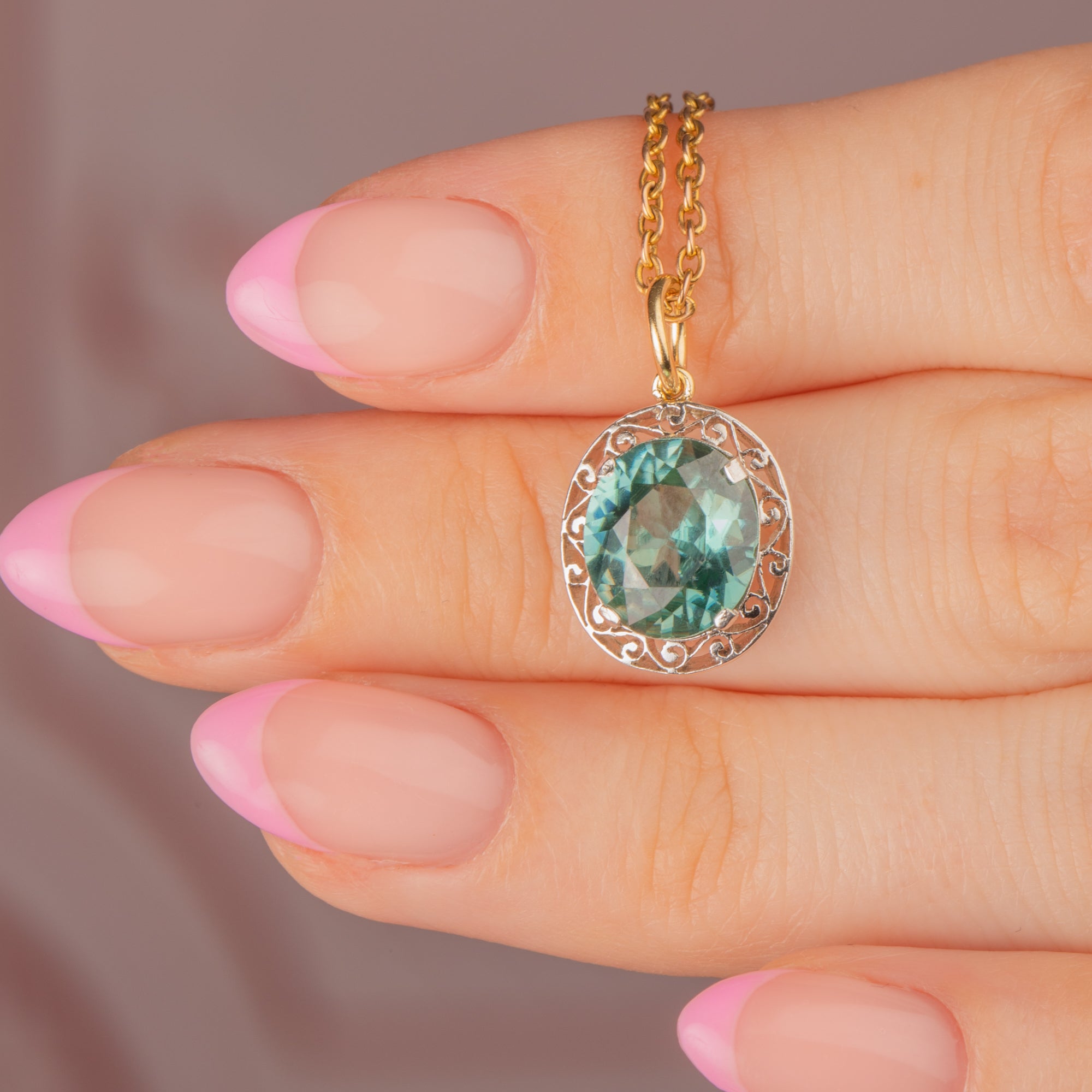 The blue Zircon is the most ravishing cyan blue colour, and with her entire circumference surrounded by Silver ornate scrollwork, this Edwardian pendant is a must-have. Imagine her with a skinny Gold chain and a buttoned-down white shirt!