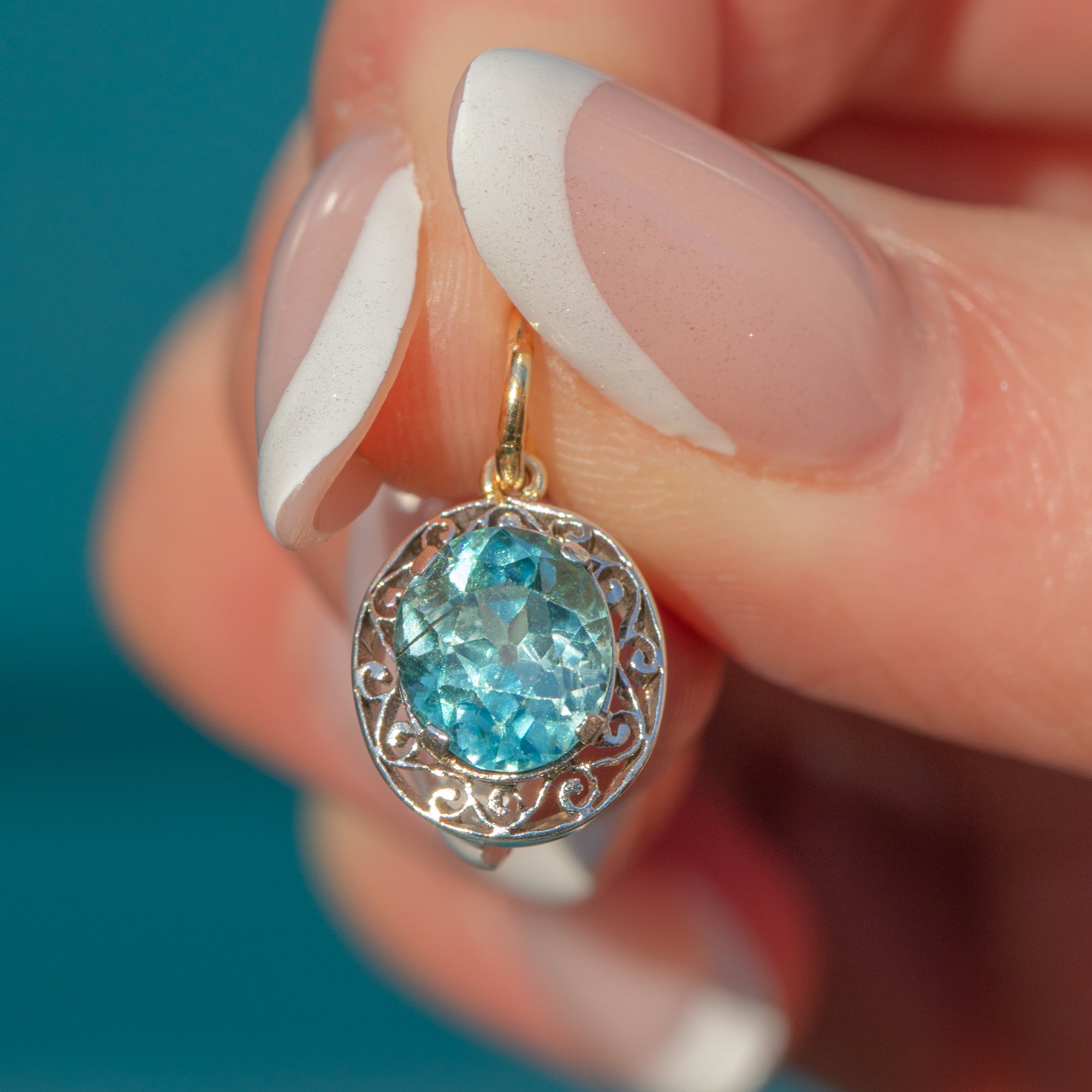 VERY GOOD: This Edwardian Silver & 9ct Gold Blue Zircon charm is in very good condition. The Zircon has a magnificent light blue hue with only minor surface wear, noticeable under close inspection. The Silver is lustrous and the filigree work has been immaculately preserved. Complete with a generously sized jump ring, you can suspend this pretty antique Zircon pendant from a chain with ease!