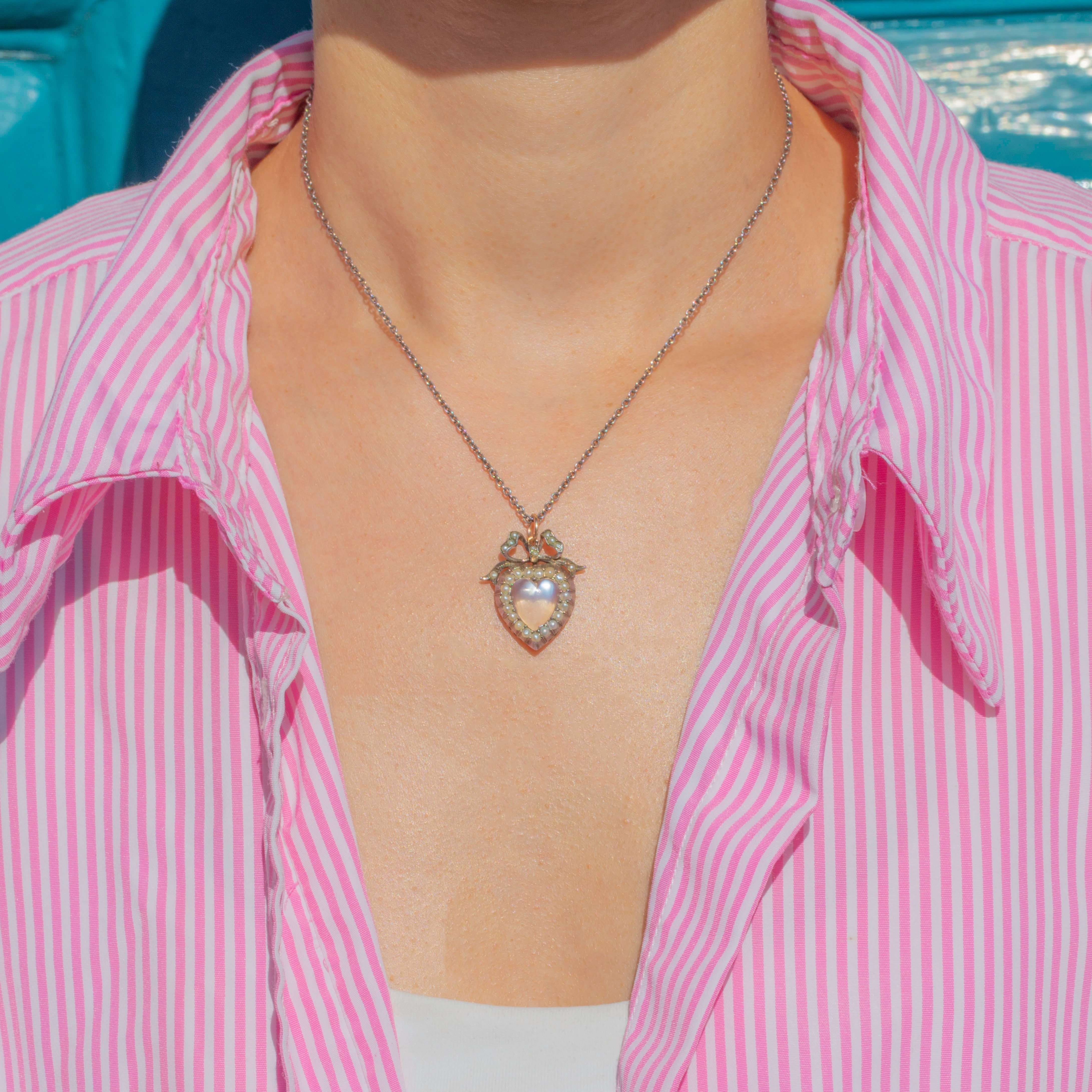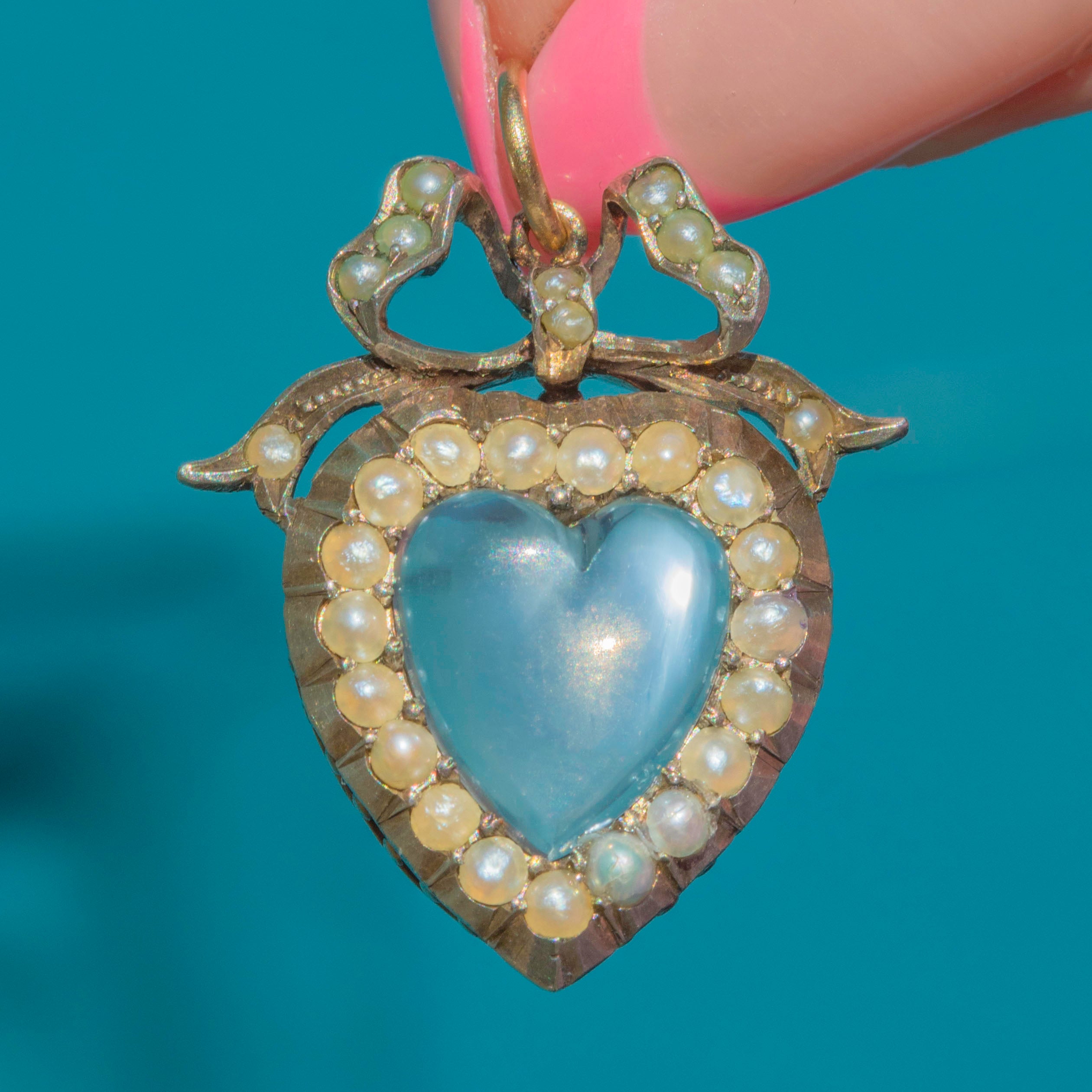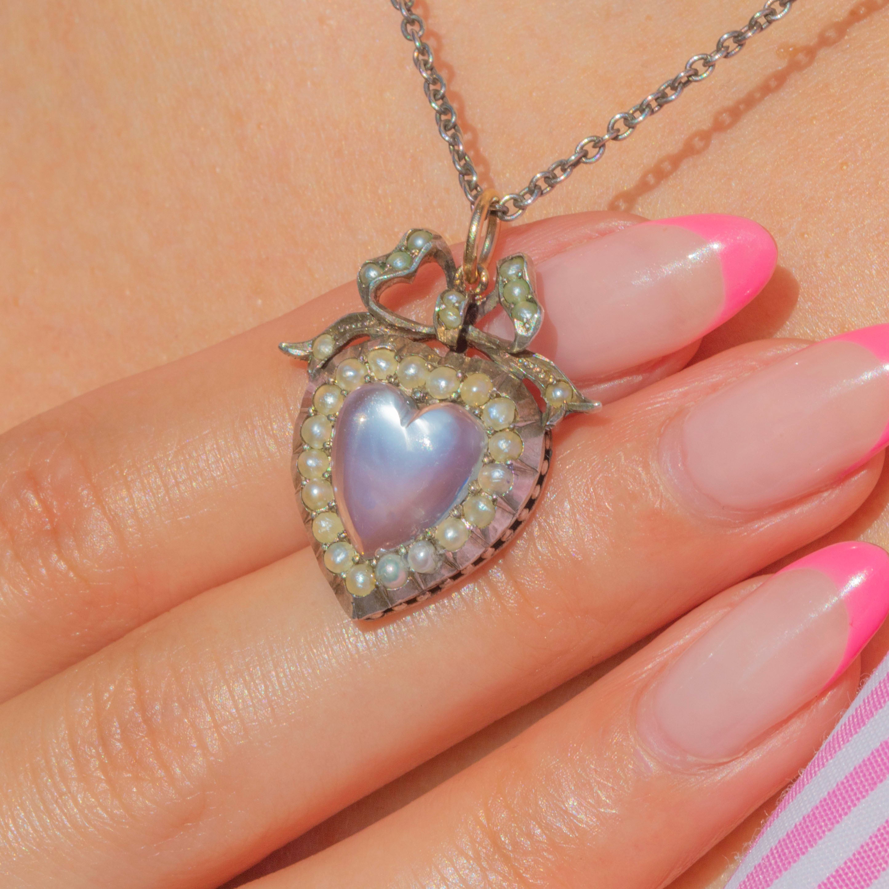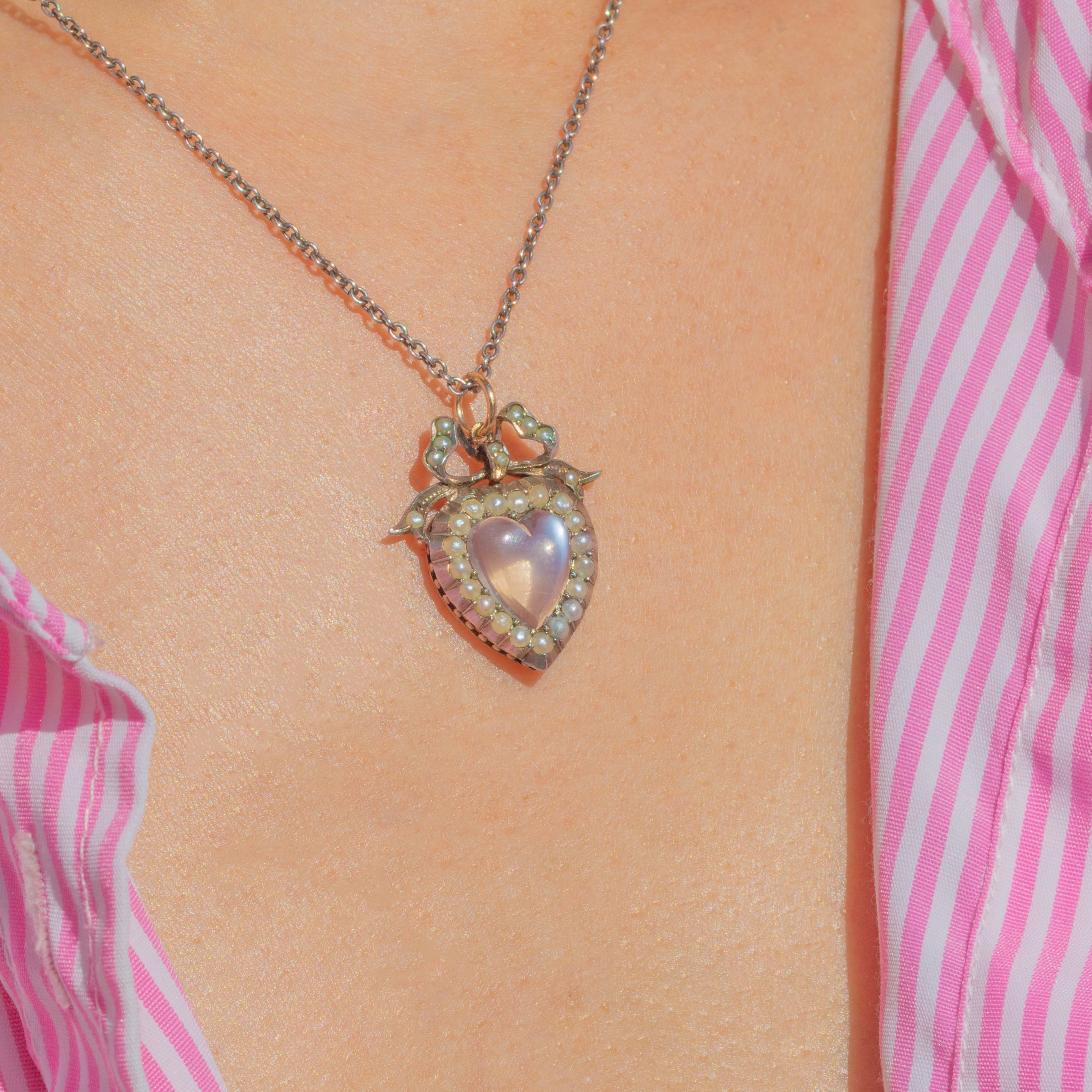 Edwardian Silver Moonstone Pearl Heart Pendant with Bow Top