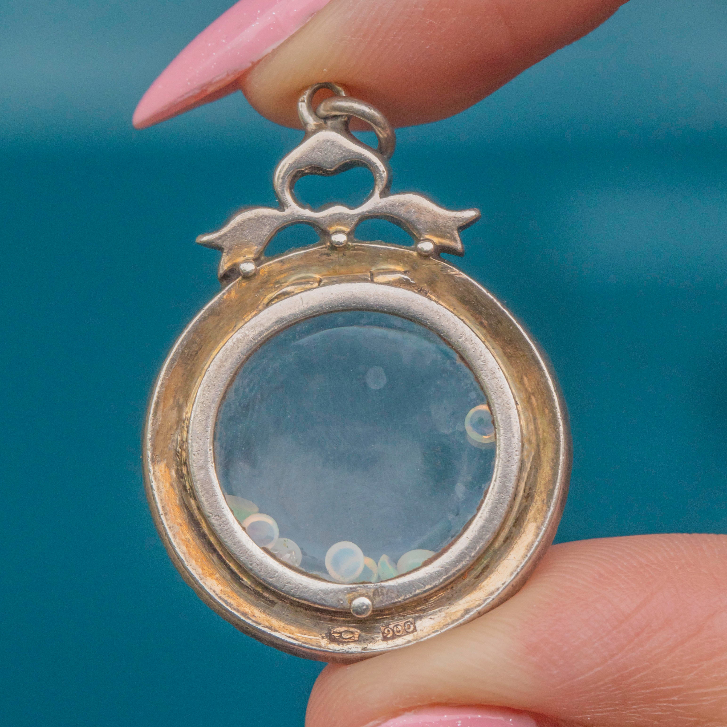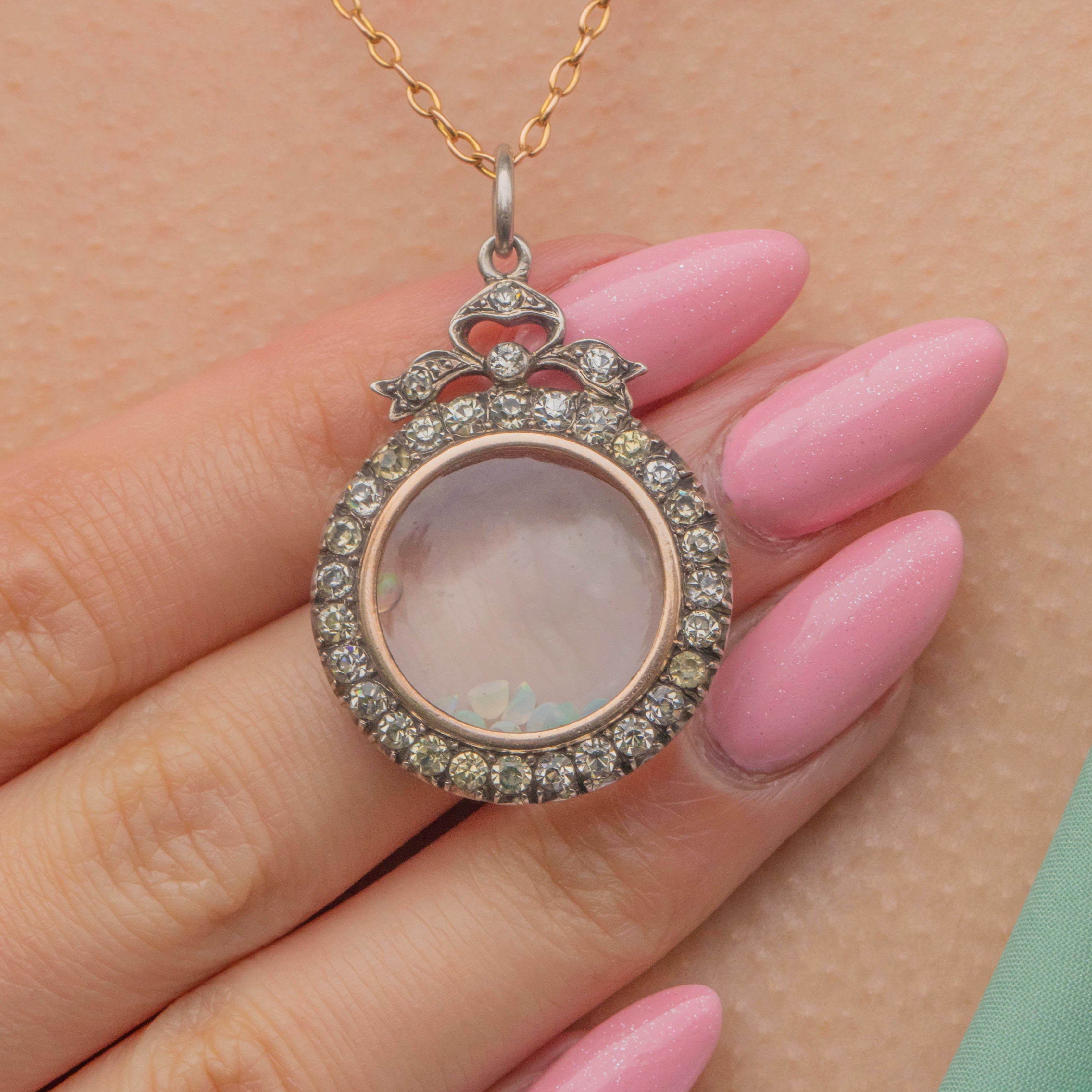 A sprinkling of loose Opals and Diamonds is held within the glass panes, adding a sense of movement to the piece. The locket compartment can easily be opened and its contents added to or replaced, making this Edwardian shaker the perfect customiseable accessory!