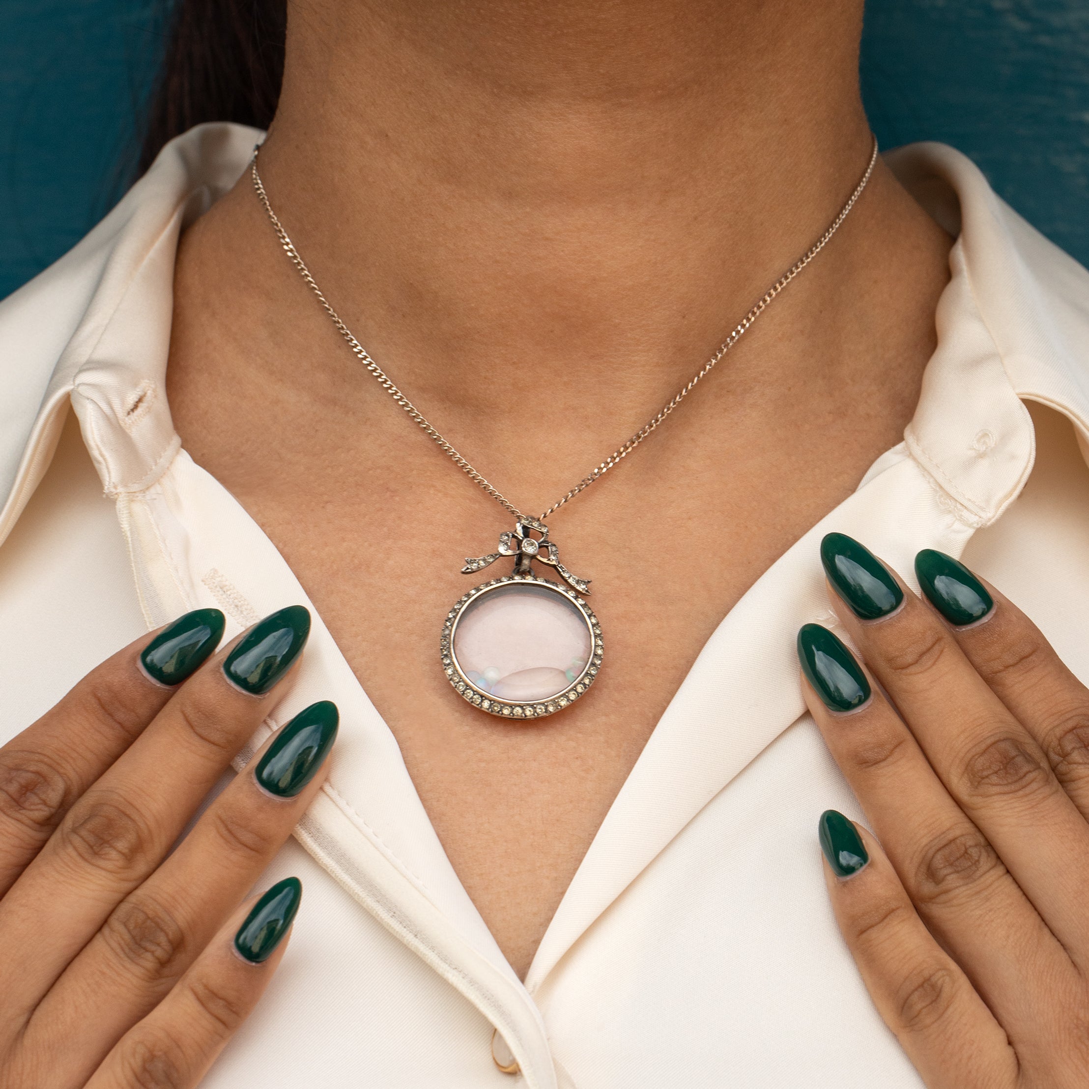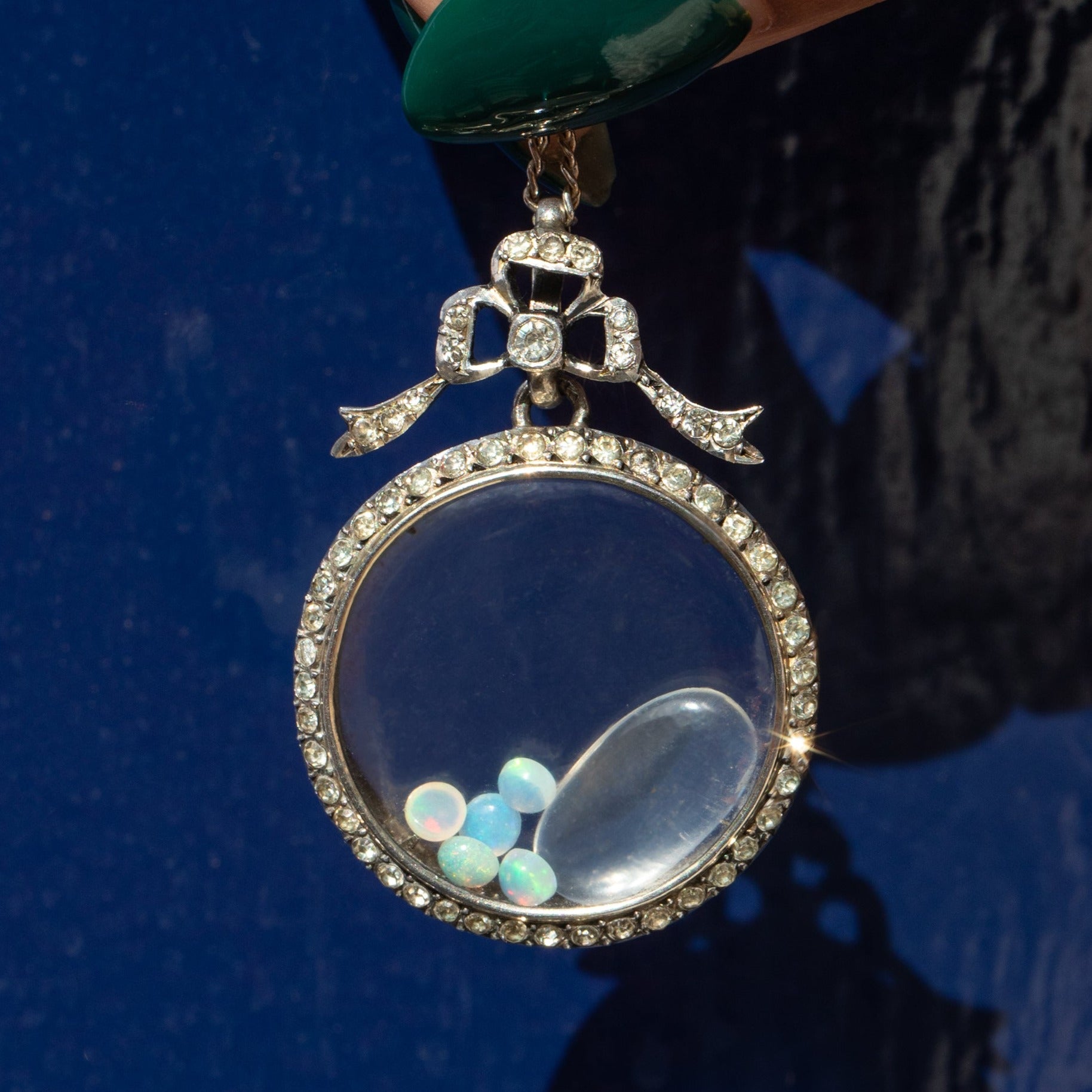 VERY GOOD. This Edwardian Silver Paste shaker locket is in very good condition. Her bale is securely hooked on, so you can wear her with the utmost confidence.  Although some of her Diamond Paste stones exhibit minor nibbles and have dulled a little over time, all are present and many remain bright and sparkly - rivaling the real deal! The Sterling Silver has minor surface wear and a tiny ding at the back, however, this is not noticeable when worn. Her loose gemstones have a fluid movement inside and make a satisfying rattle, you can even add your own if desired. Flaunt this beautiful antique shaker locket to add grandeur to any attire.
