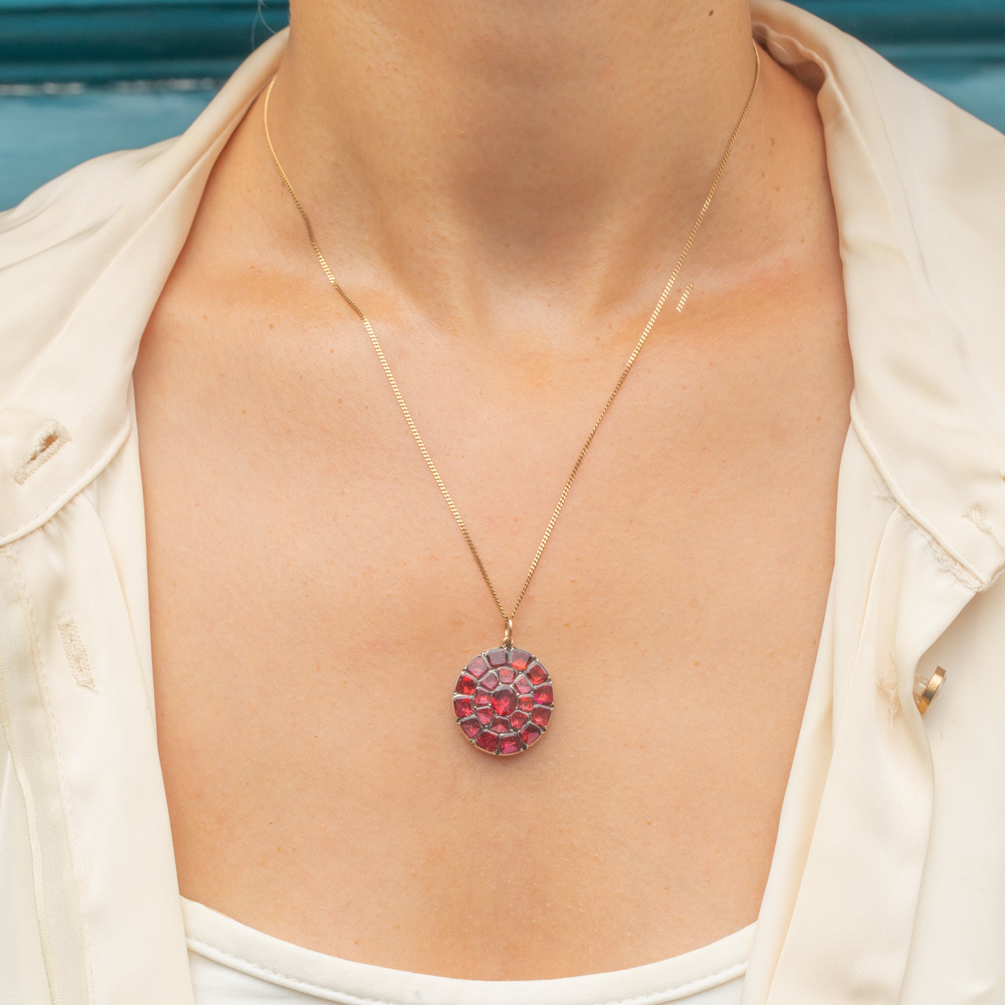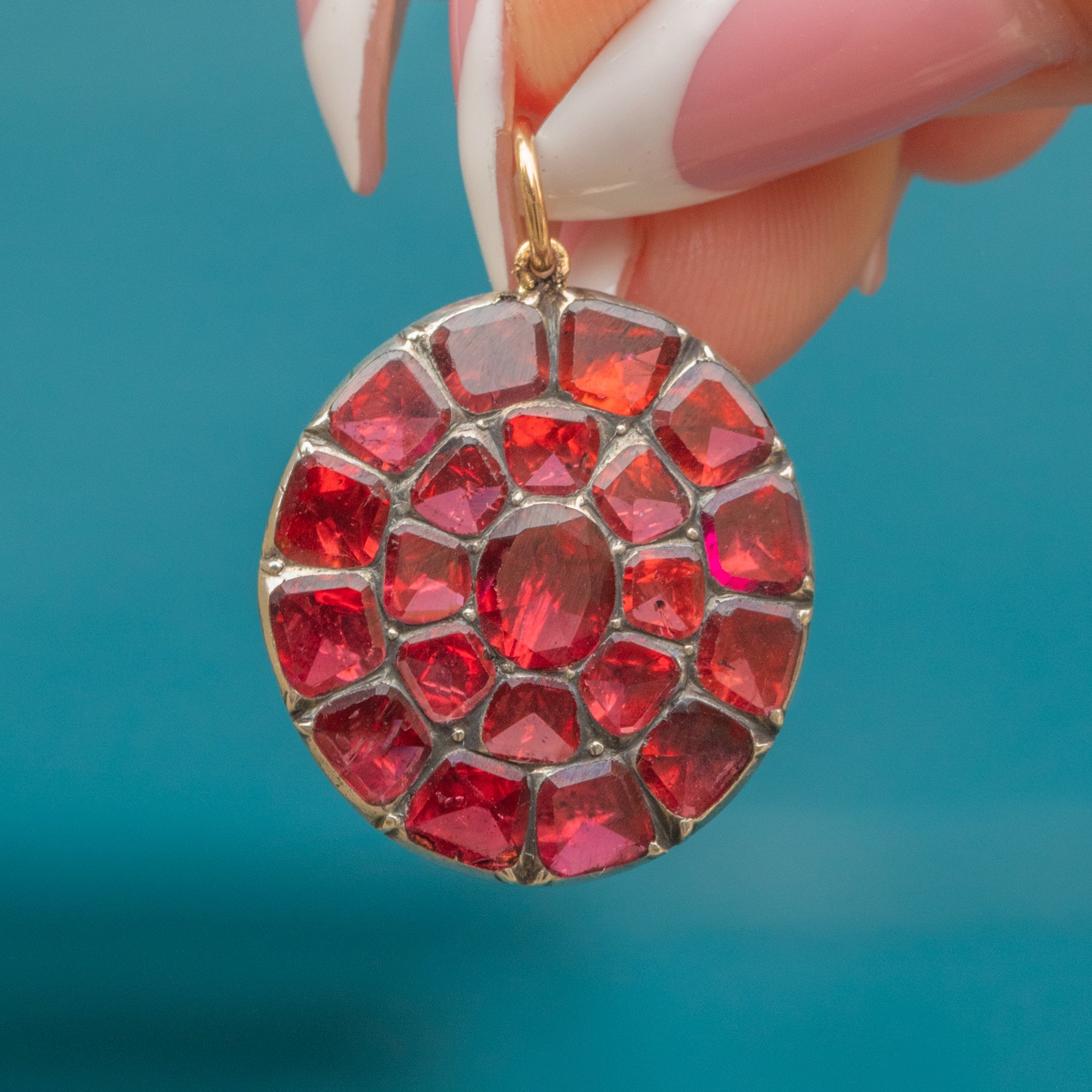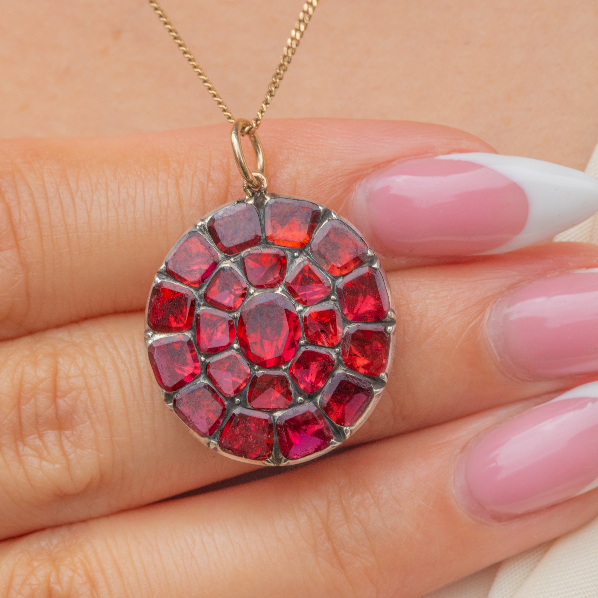 A beautiful English Georgian cluster pendant set with glowing, foiled flat-cut Garnets in graduating sizes.