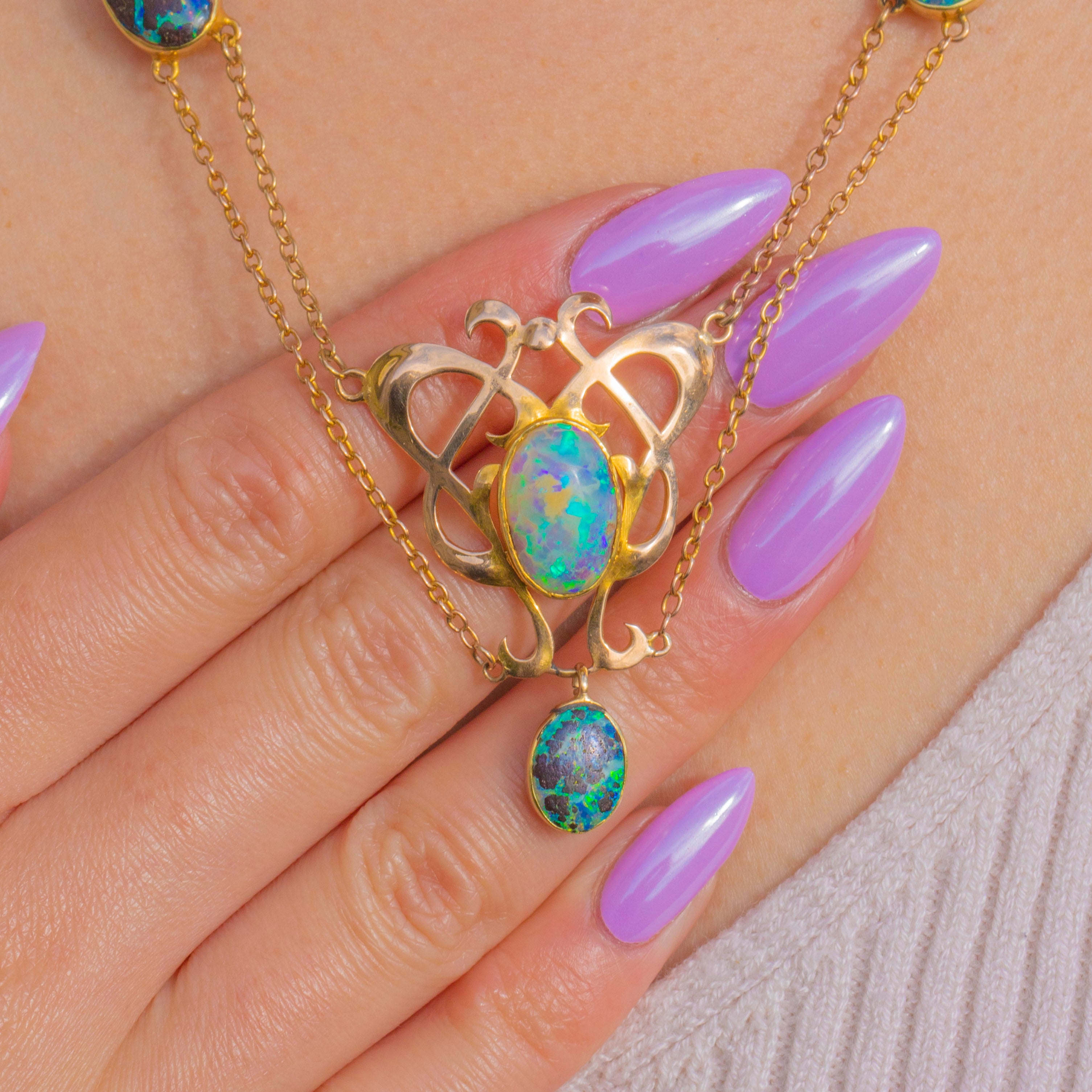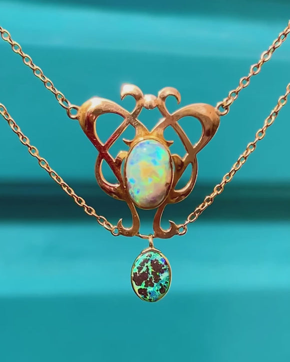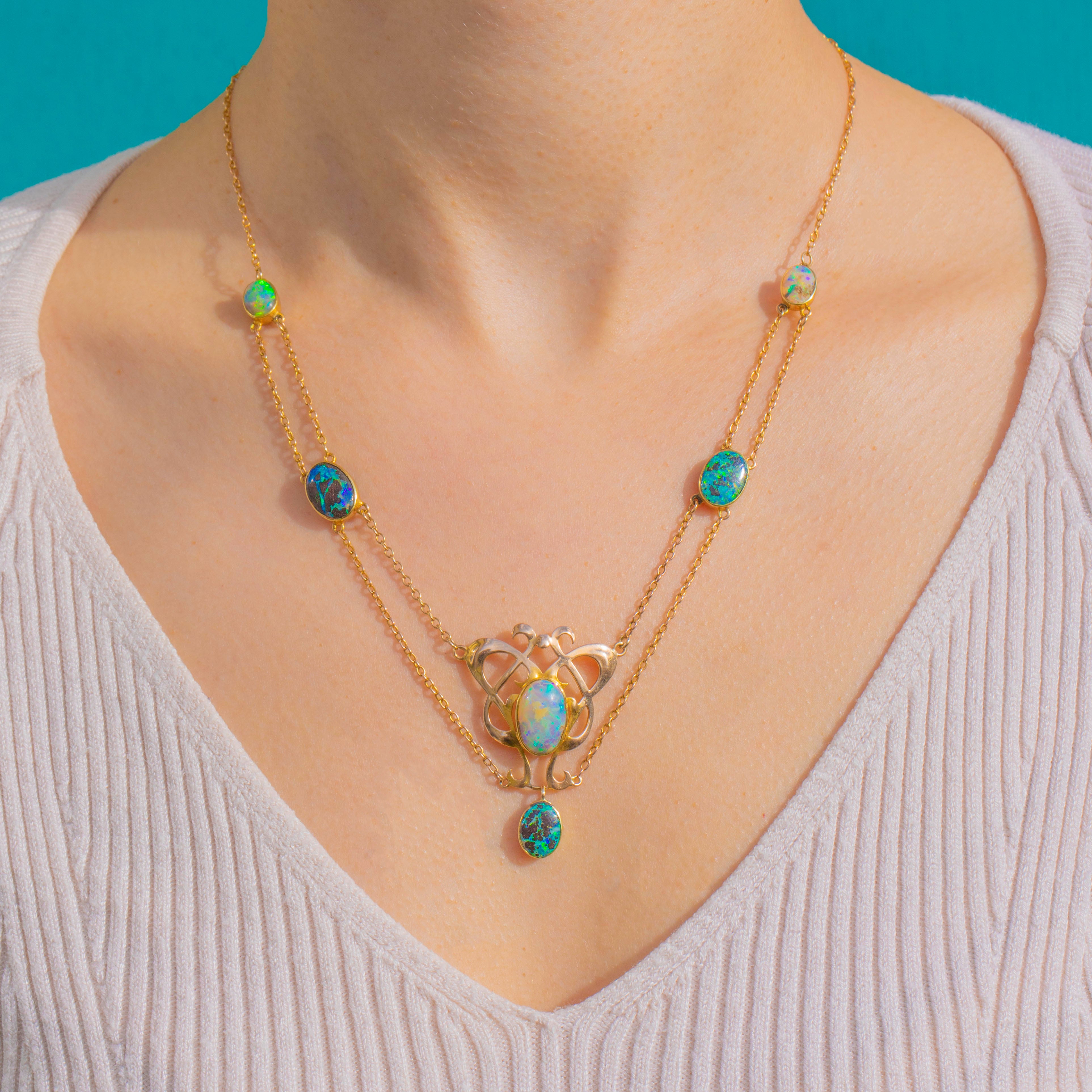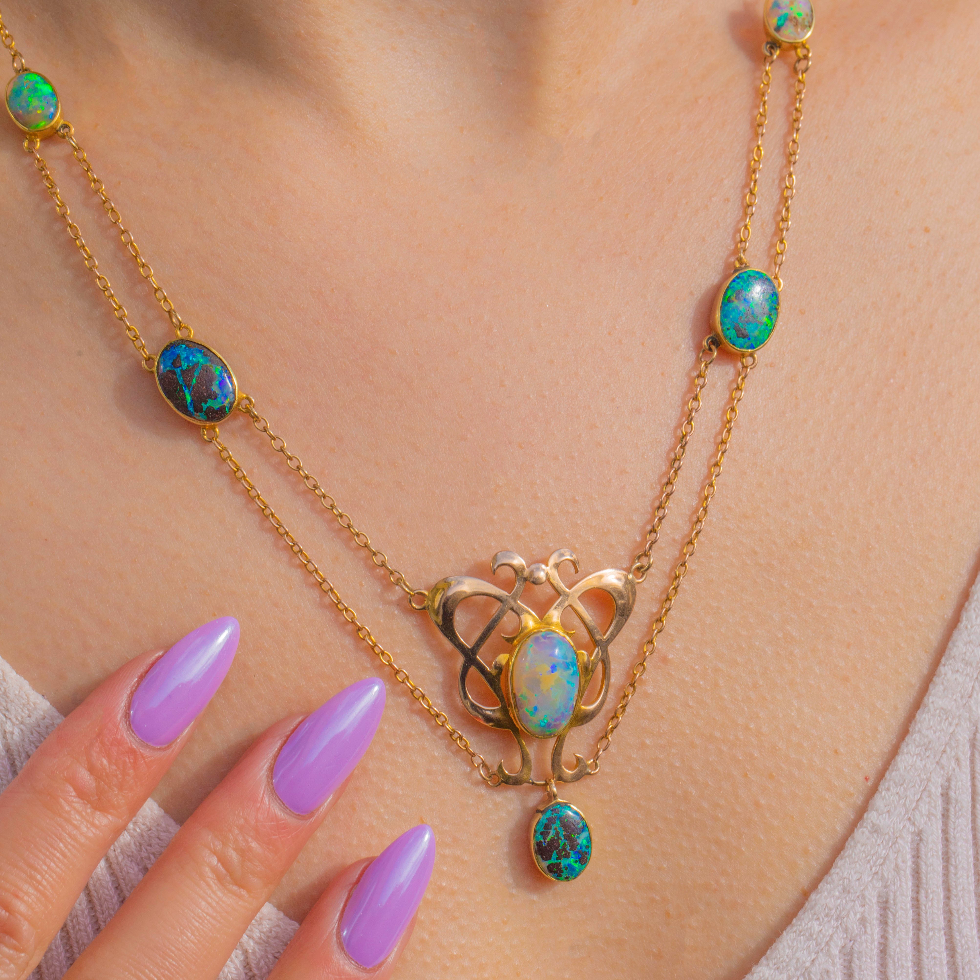 Sculptural and romantic, this Arts & Crafts necklace is crafted in rich 15ct Gold with a beautifully pierced openwork centrepiece and an articulated drop for graceful movement. Sinuous foliate curves frame a suite of bezel-set Boulder Opal cabochons, their domed surfaces alive with electric blues and greens that dance across milky opalescence and darker matrix.