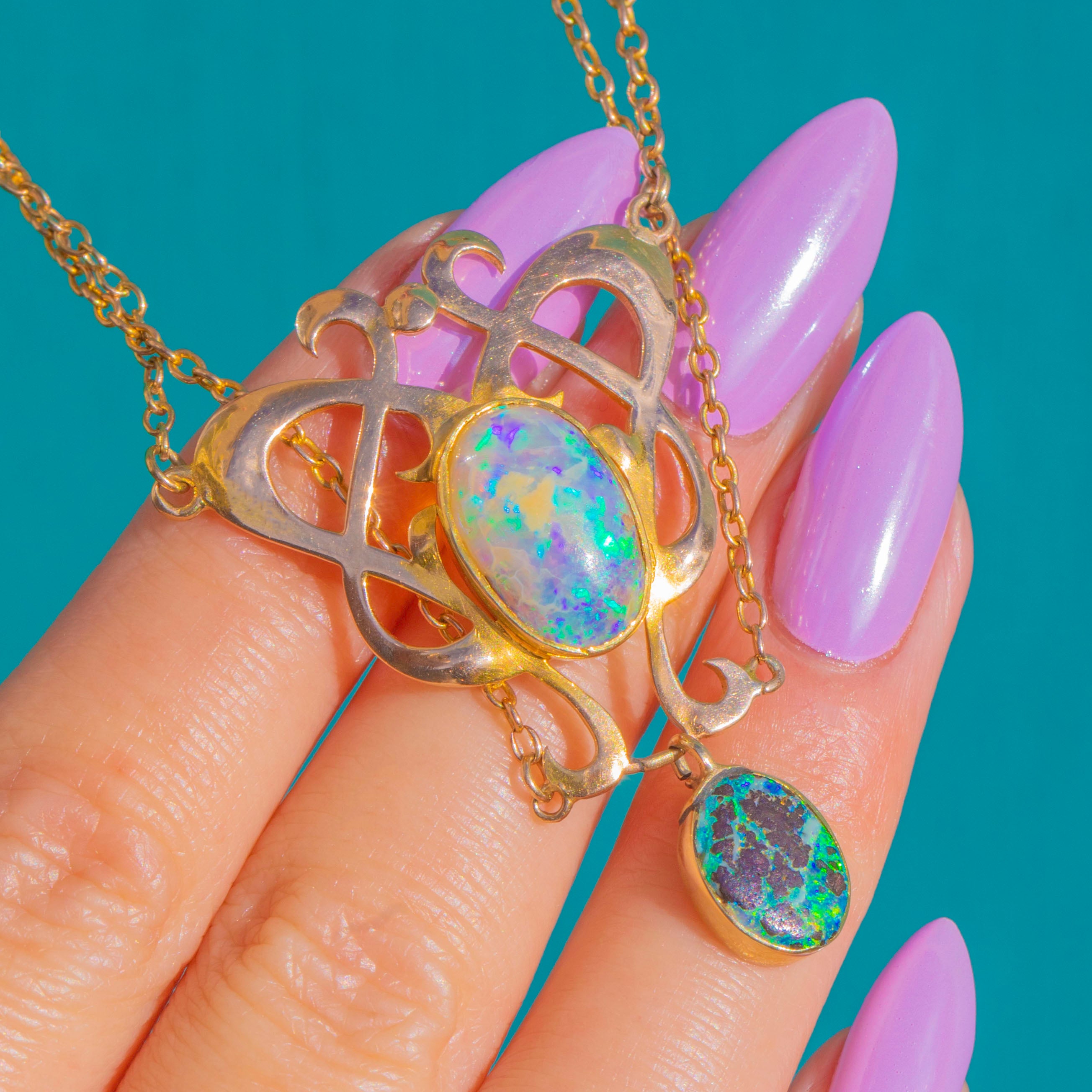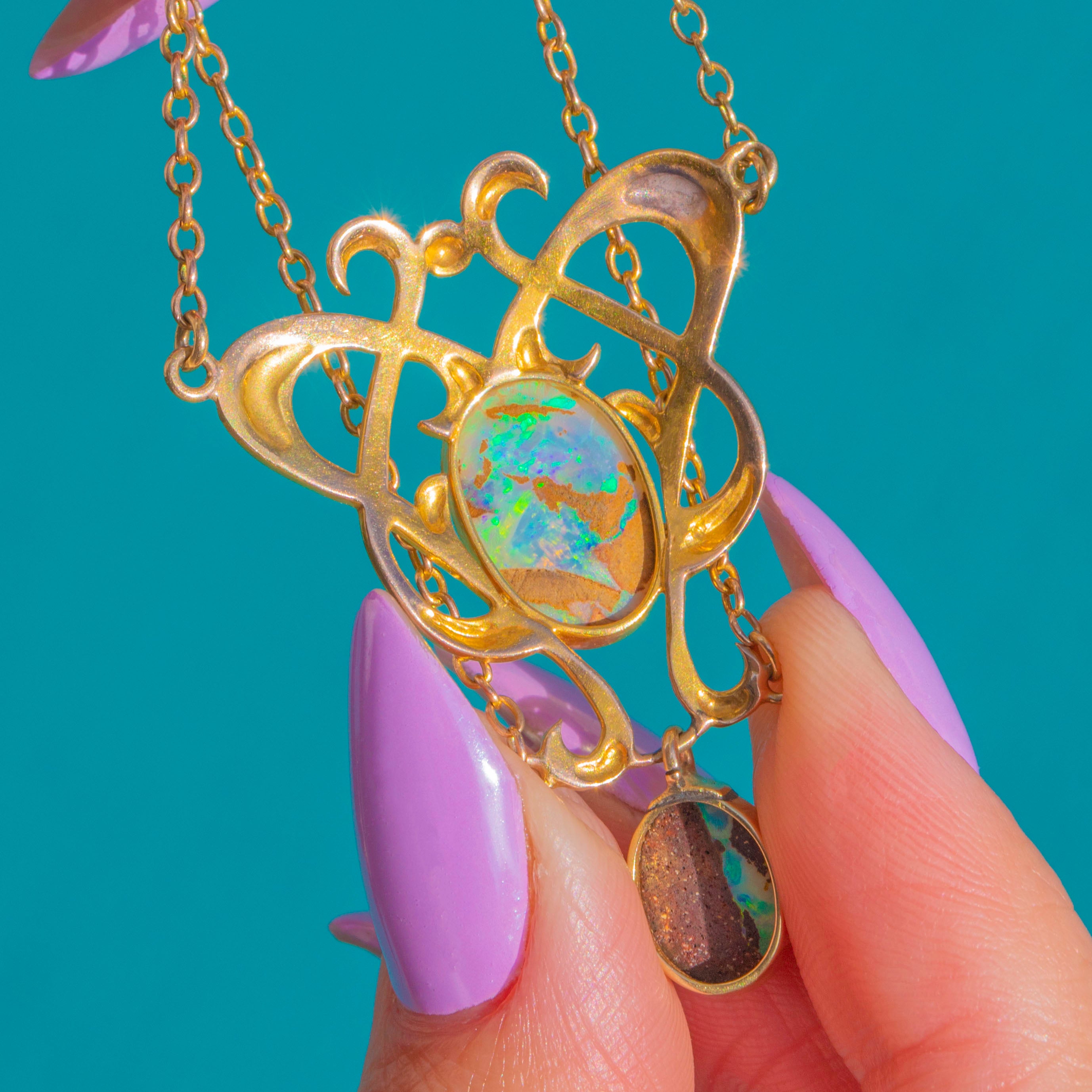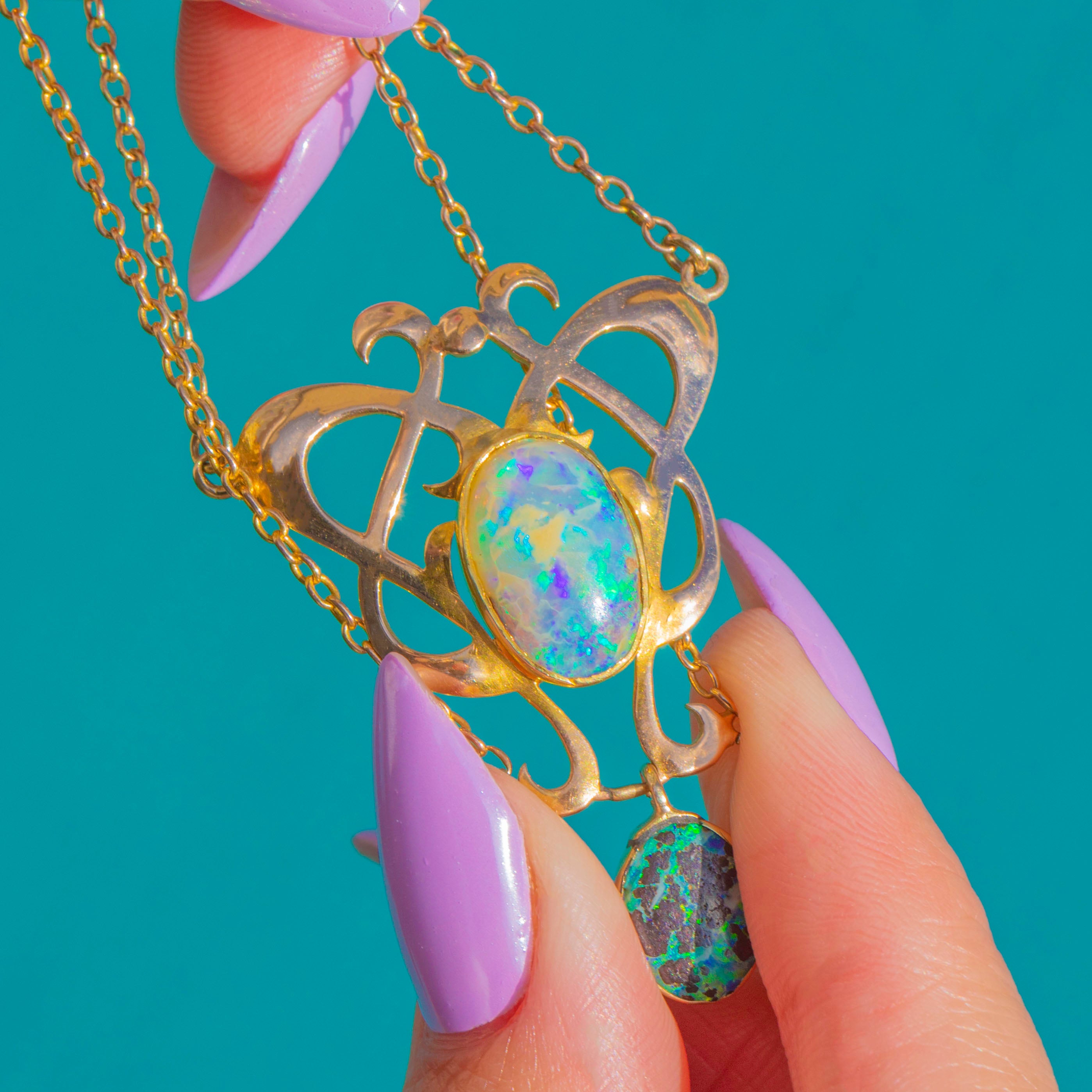 Sculptural and romantic, this Arts & Crafts necklace is crafted in rich 15ct Gold with a beautifully pierced openwork centrepiece and an articulated drop for graceful movement. Sinuous foliate curves frame a suite of bezel-set Boulder Opal cabochons, their domed surfaces alive with electric blues and greens that dance across milky opalescence and darker matrix.