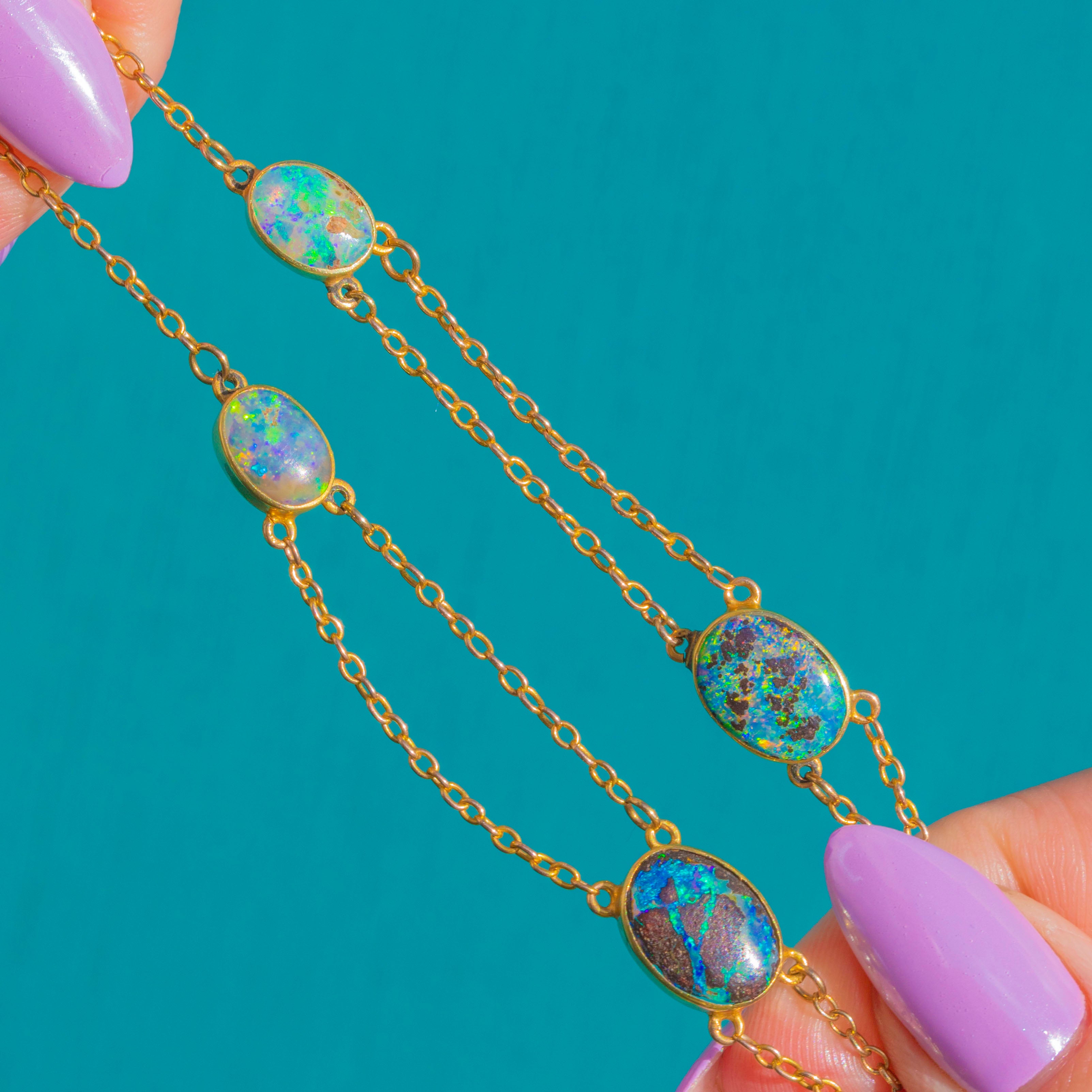 EXCELLENT: The Boulder Opals are bright and secure with no chips or notable abrasions, and the bezels are crisp and protective. The 15ct Gold openwork and chain show minimal surface wear and light age-related marks only. No evident repairs or alterations; this piece has been very well cared for.