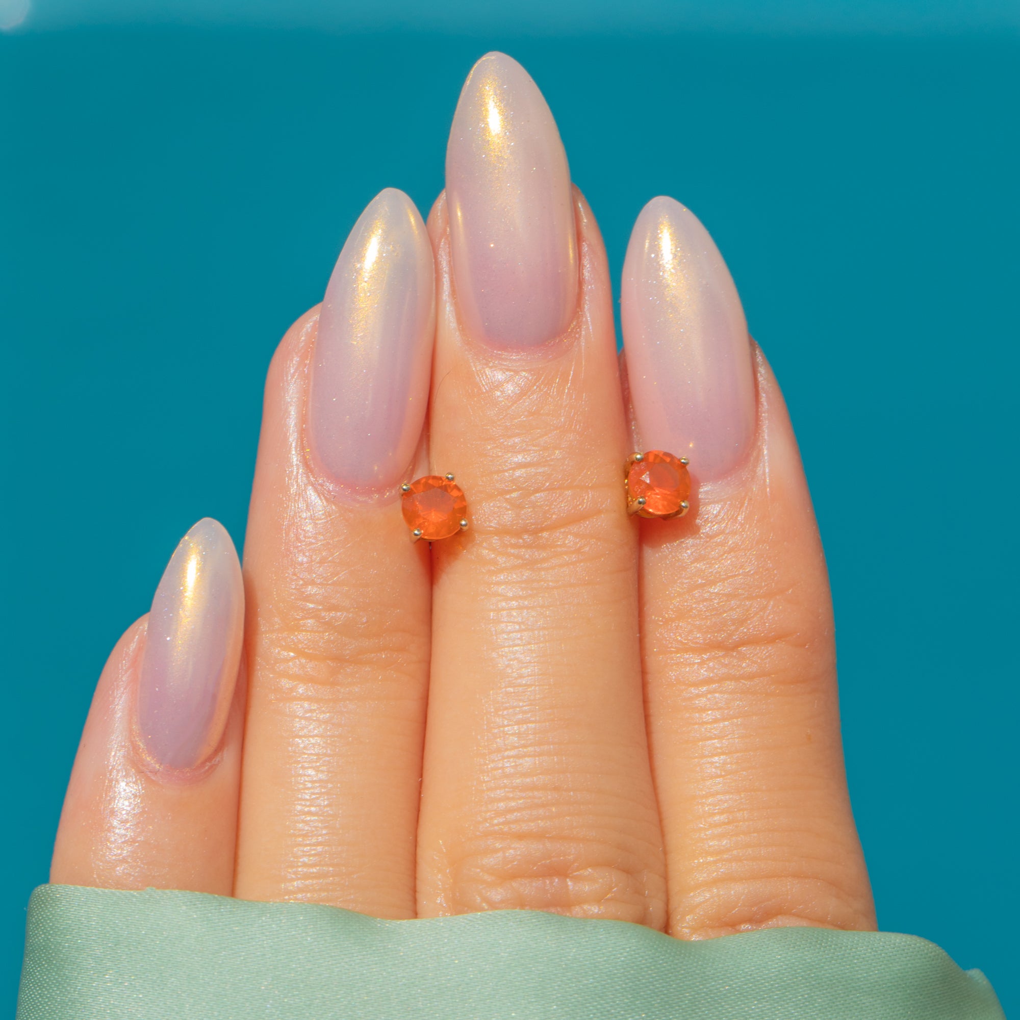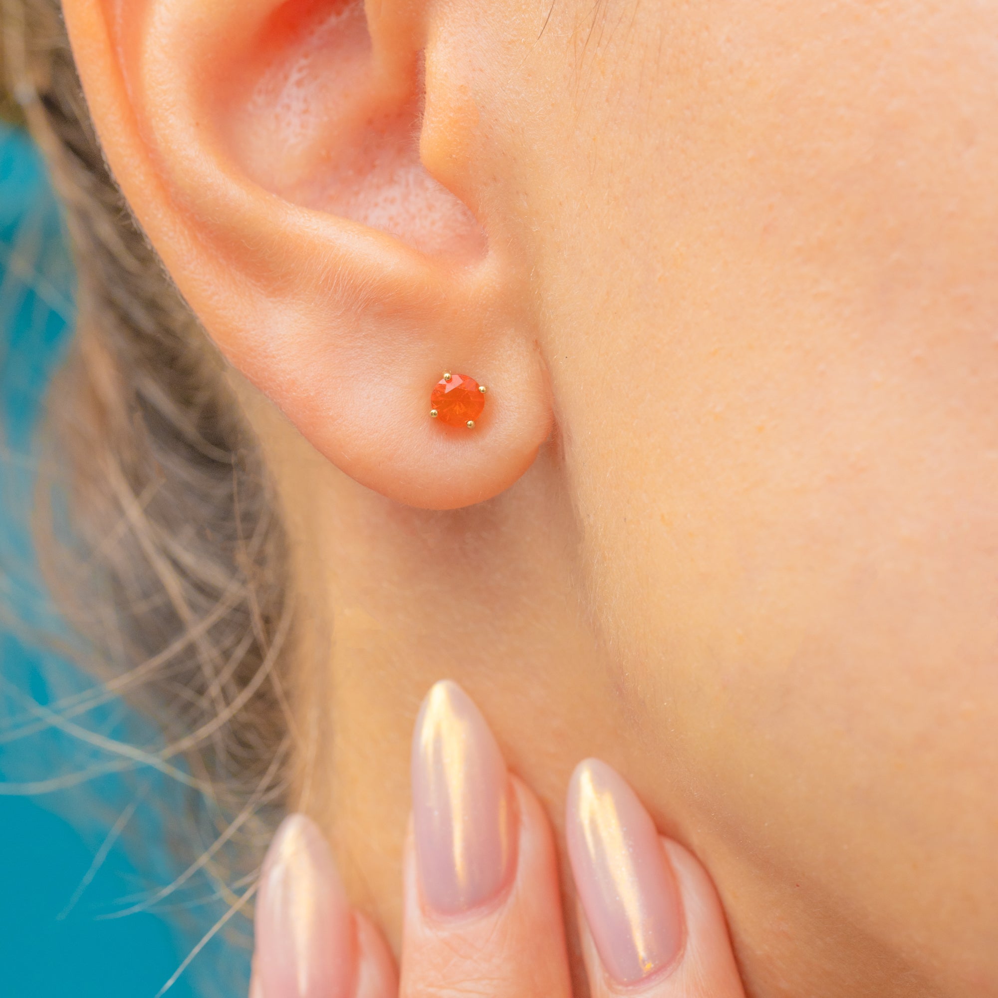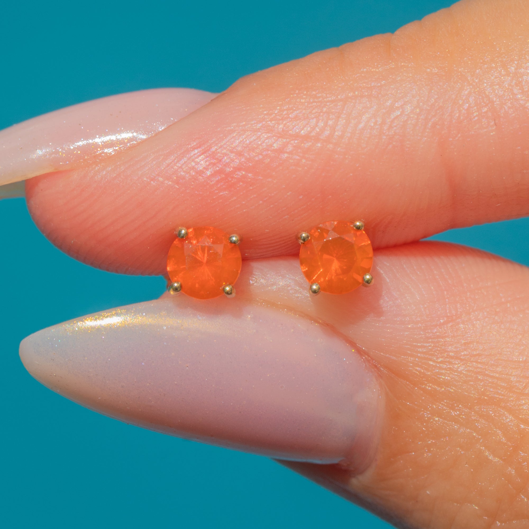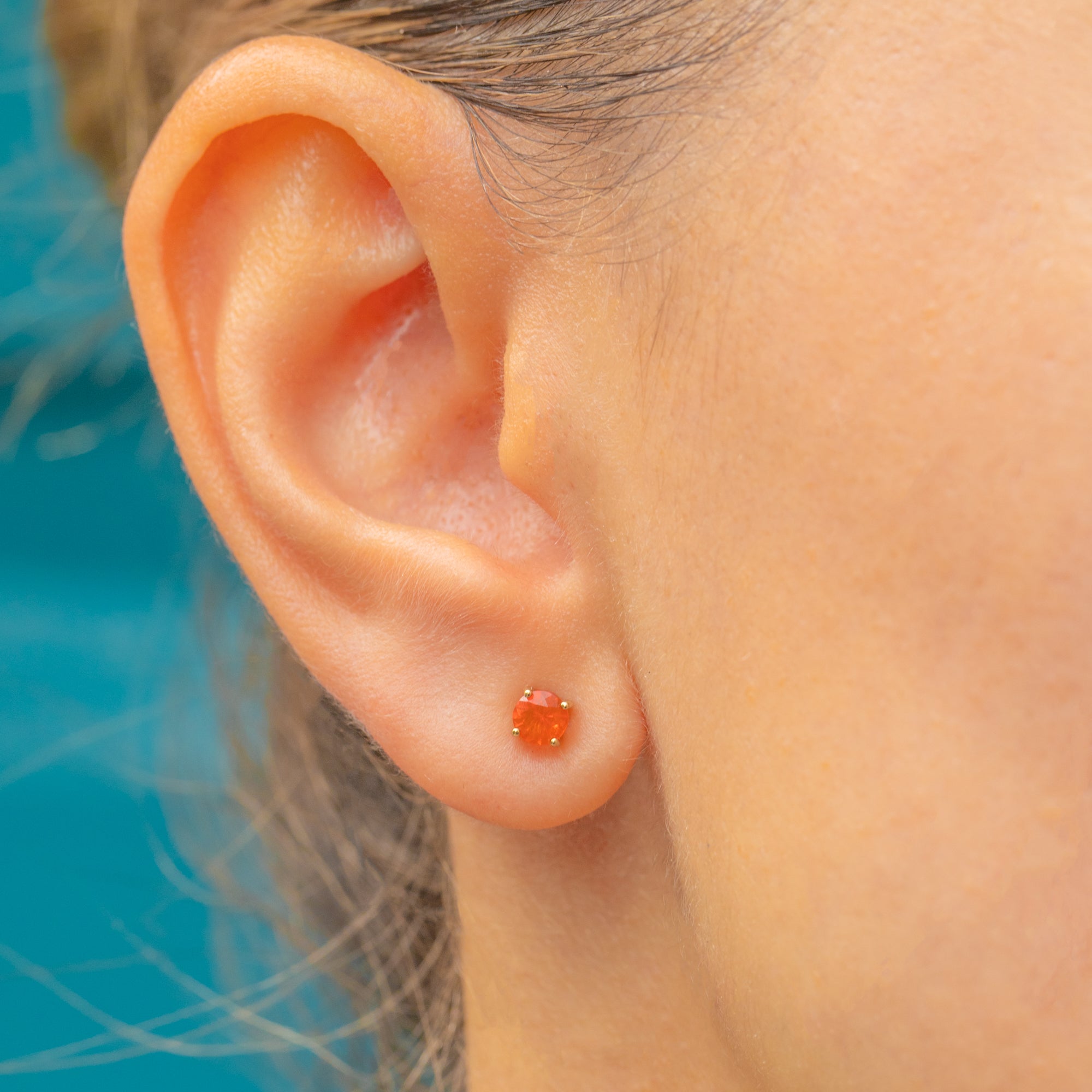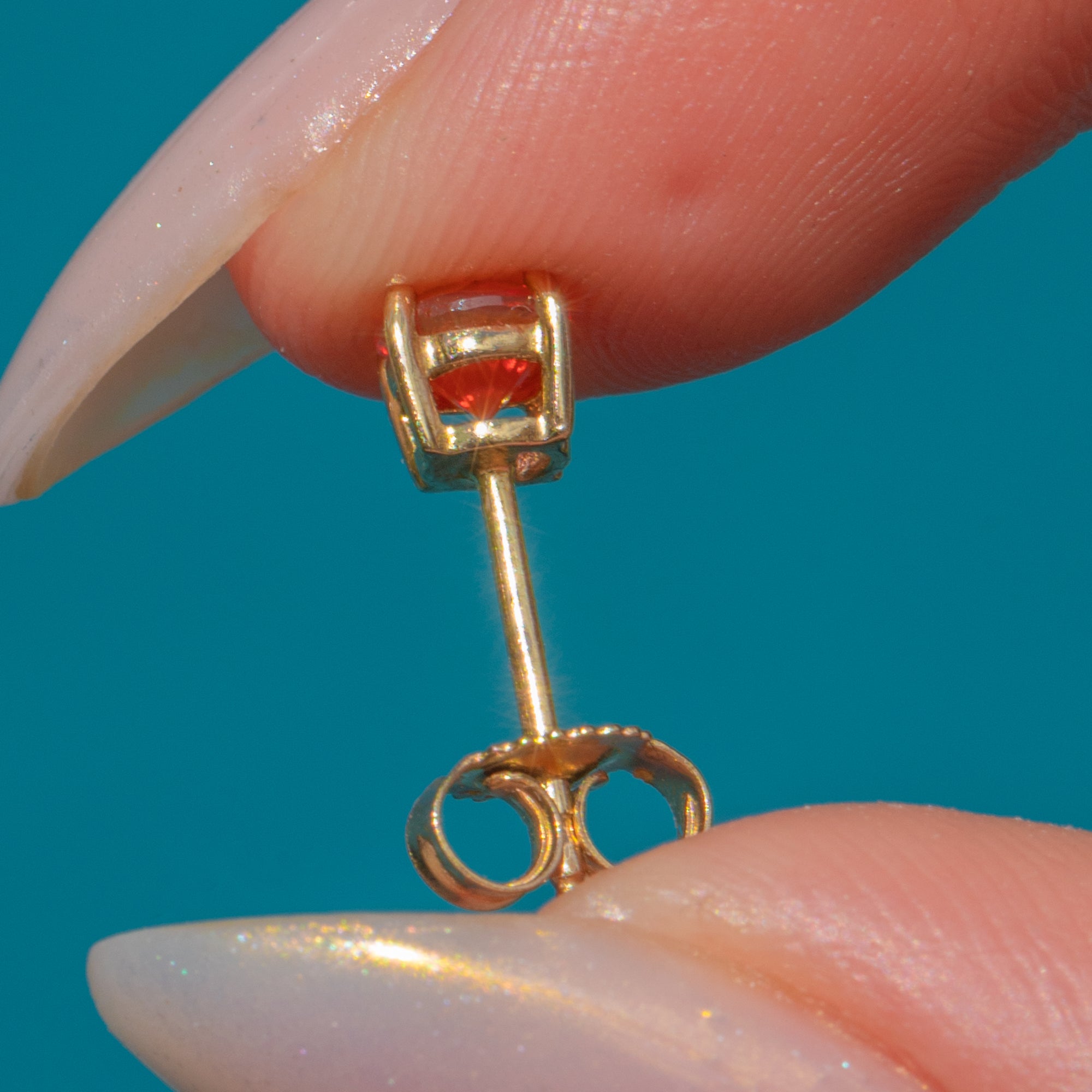 A glowing pair of Fire Opal stud earrings set in 9ct Gold. Each round Fire Opal measures 4mm across, with a combined weight of approx. 0.50ct, radiating warm orange tones that catch the light beautifully.