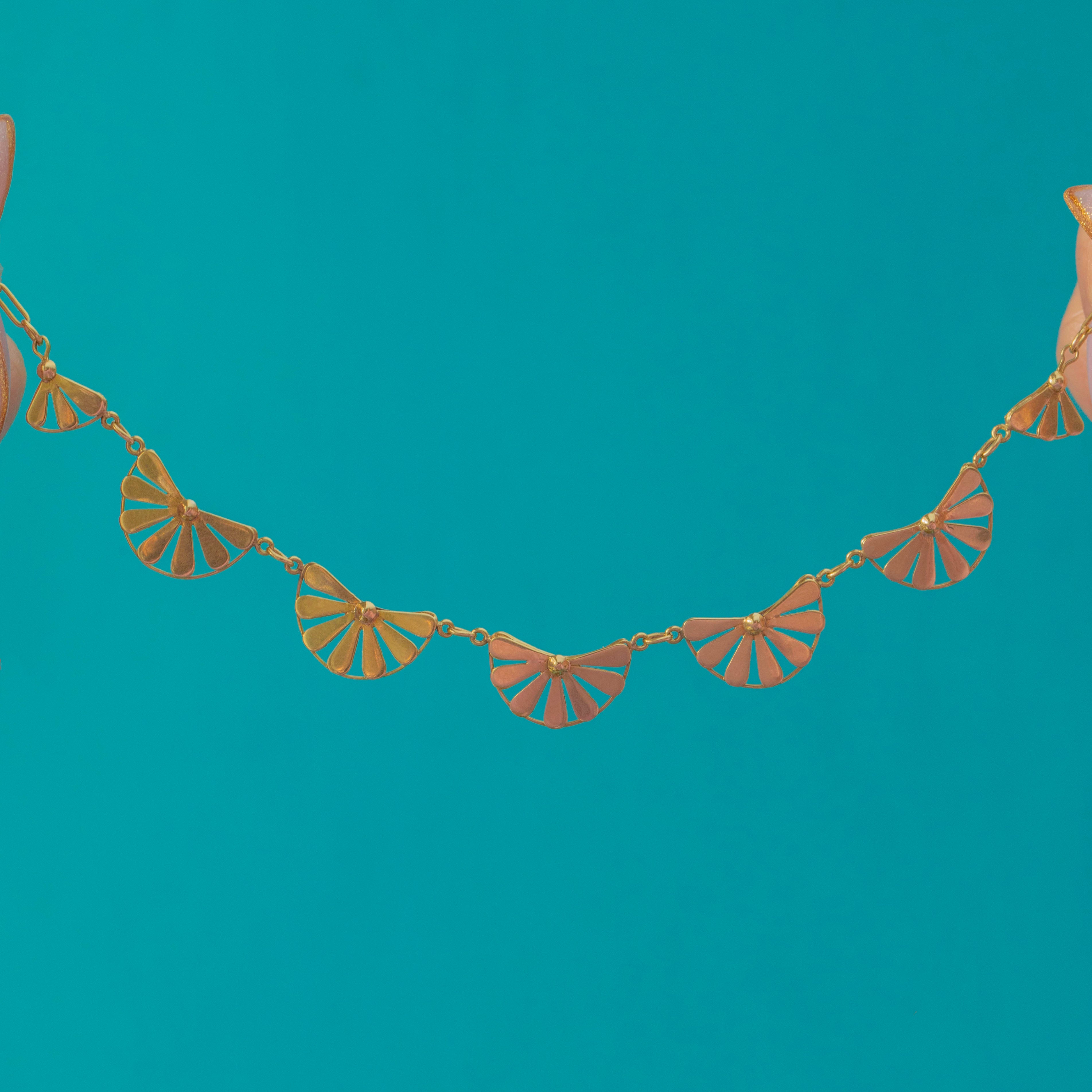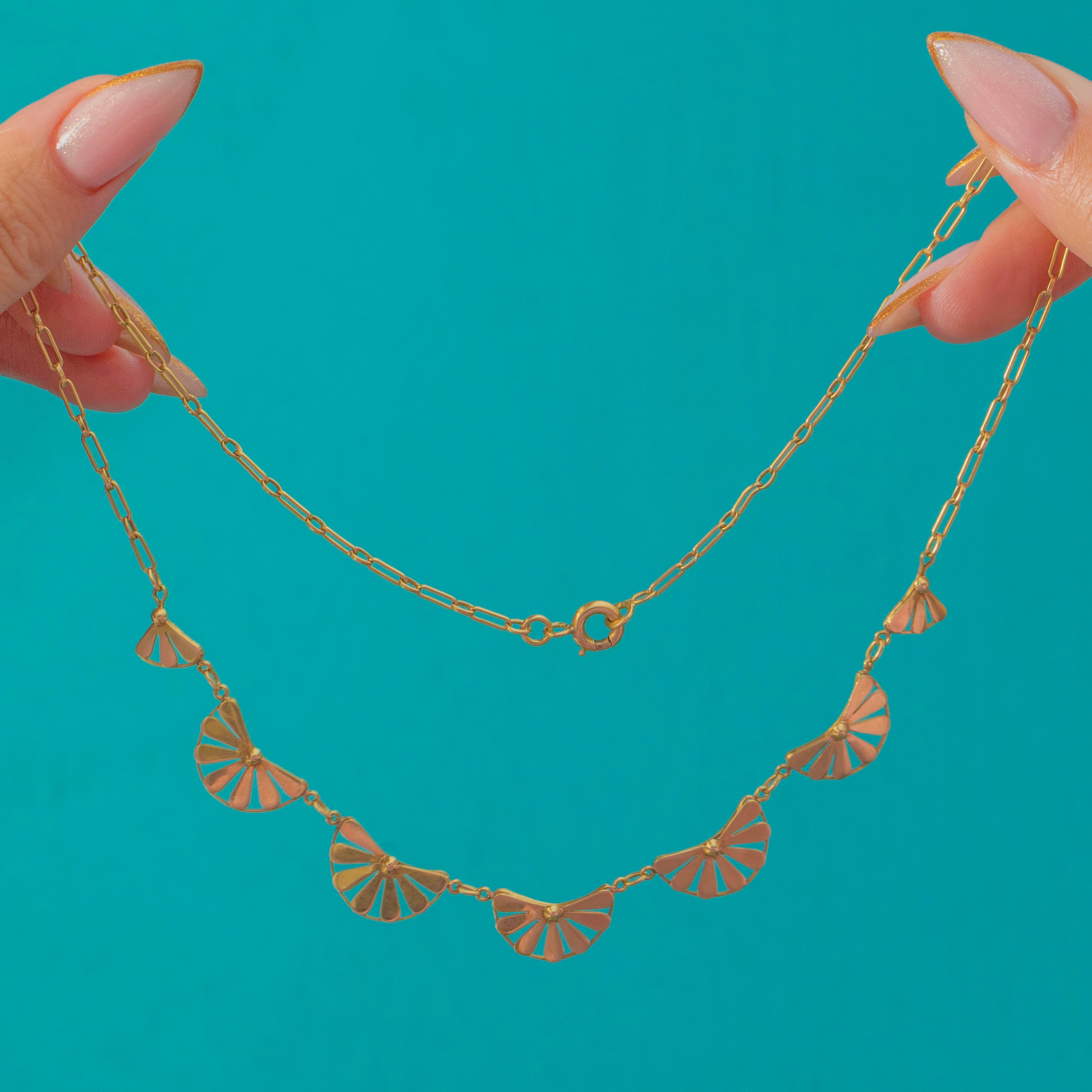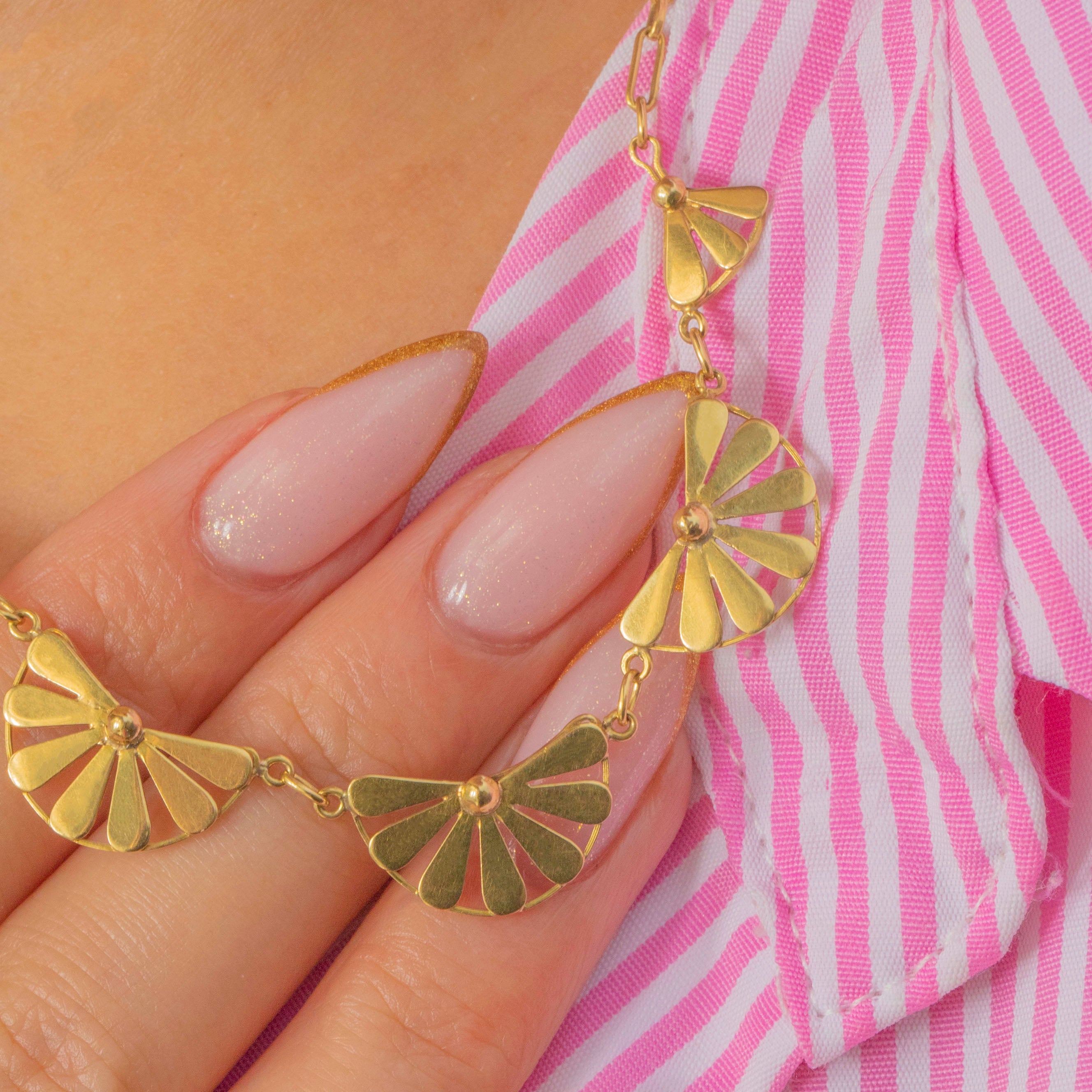 The design features a softly sculpted daisy motif at the centre, tapering to elegant miniature trombone links that lie flat and comfortably along the neckline. Radiating the joyful femininity of the Jazz Age, this piece combines craftsmanship and style in perfect measure, a rare and charming treasure from the height of French Art Deco design.