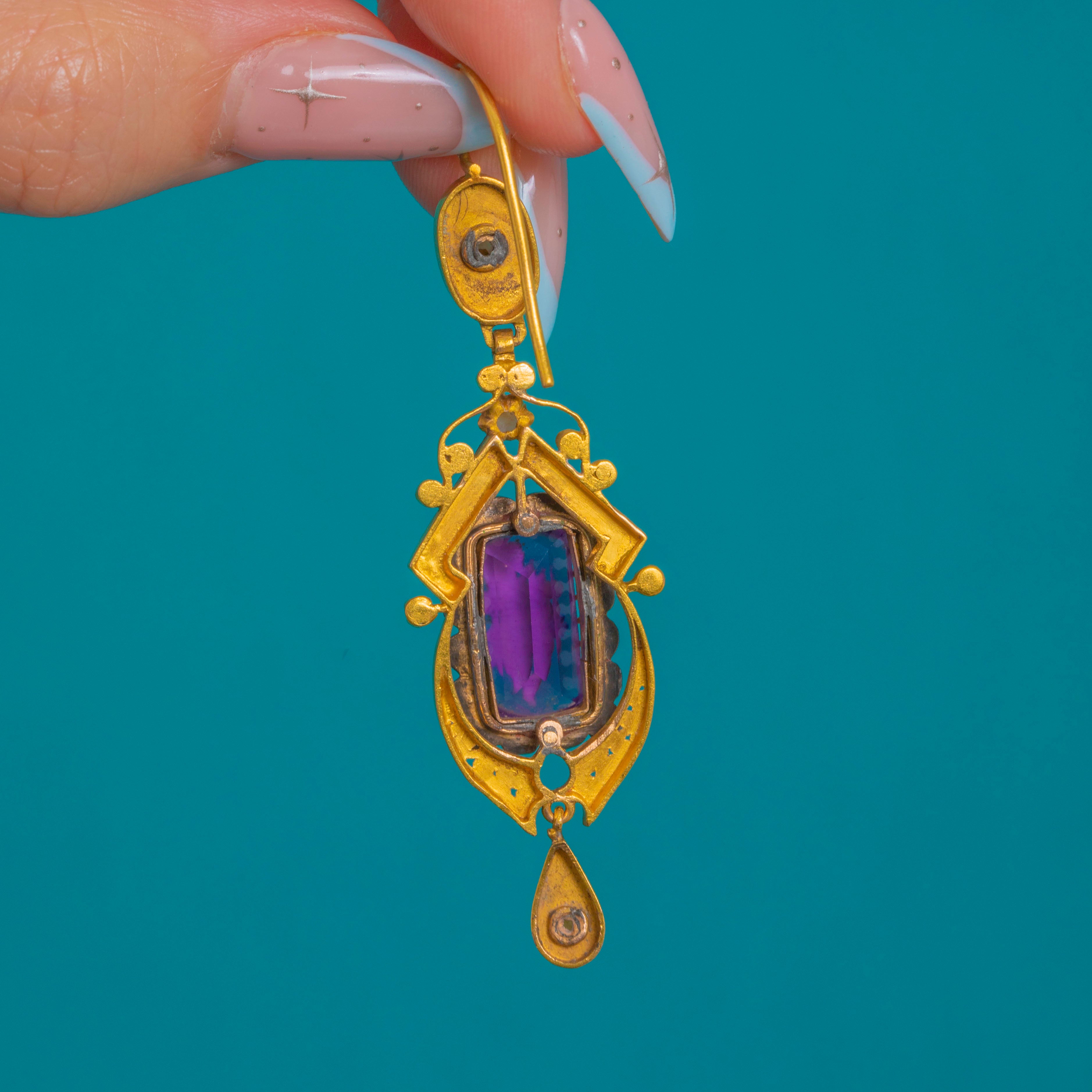 Sumptuous and romantic, these French Victorian 18ct Gold earrings showcase exquisitely painted cherub miniatures on a vivid purple glass ground. The elongated, articulated silhouette is richly adorned with applied bead-and-wire detail in the Etruscan Revival taste, delivering graceful movement and an opulent, shoulder-grazing presence.