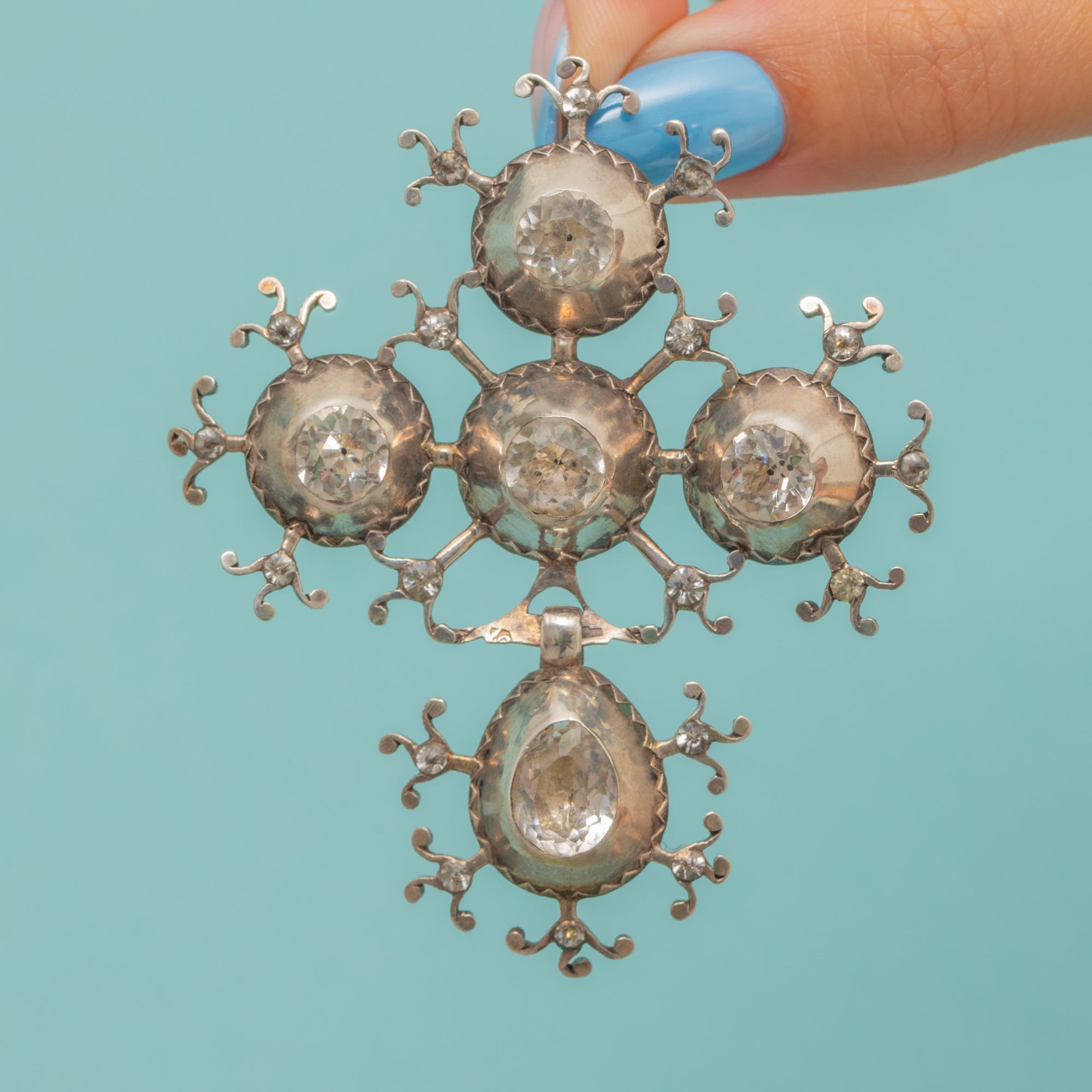 VERY GOOD: The Paste stones are radiant, faceted beautifully to ensure they sparkle, and are set securely in their settings. There are some significant signs of wear to the Silver - particularly the back - however given that pendant is over 200 years old, this is to be expected and is difficult to spot when wearing. Having retained a gorgeous formation, this French Georgian pendant can be worn with confidence.