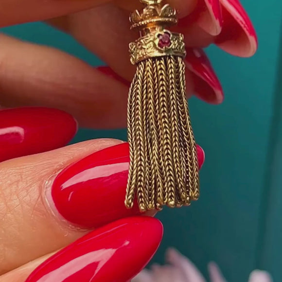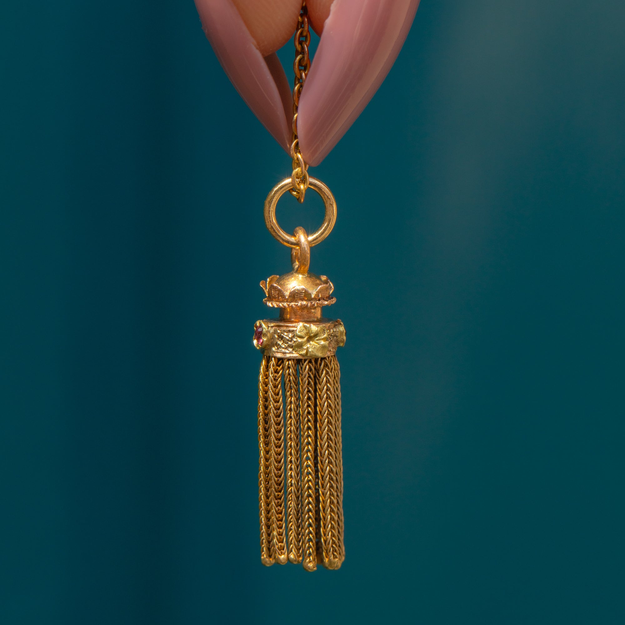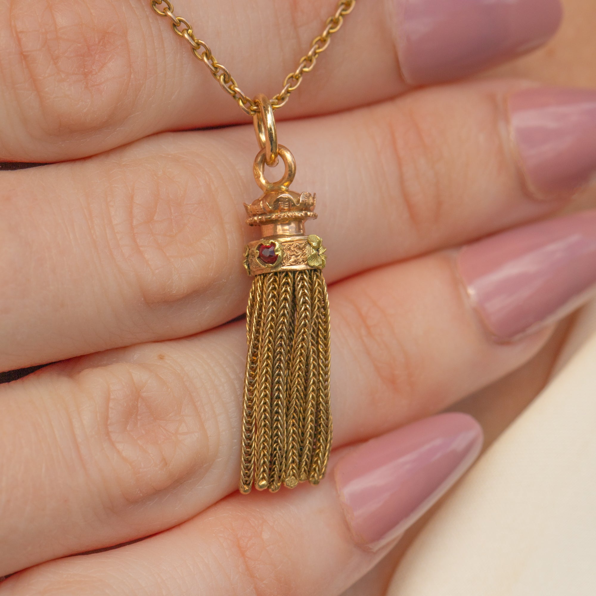 A rare treasure, this Napoleon III French 18ct Gold tassel pendant is a highly coveted piece for any antique jewellery aficionado or lover of resplendent jewels! Steeped in history, this Victorian pendant is crafted from solid 18ct Gold and set with rose-cut Garnets with floral accents topped by a crown, commemorating Napoleon III in the most sumptuous way!