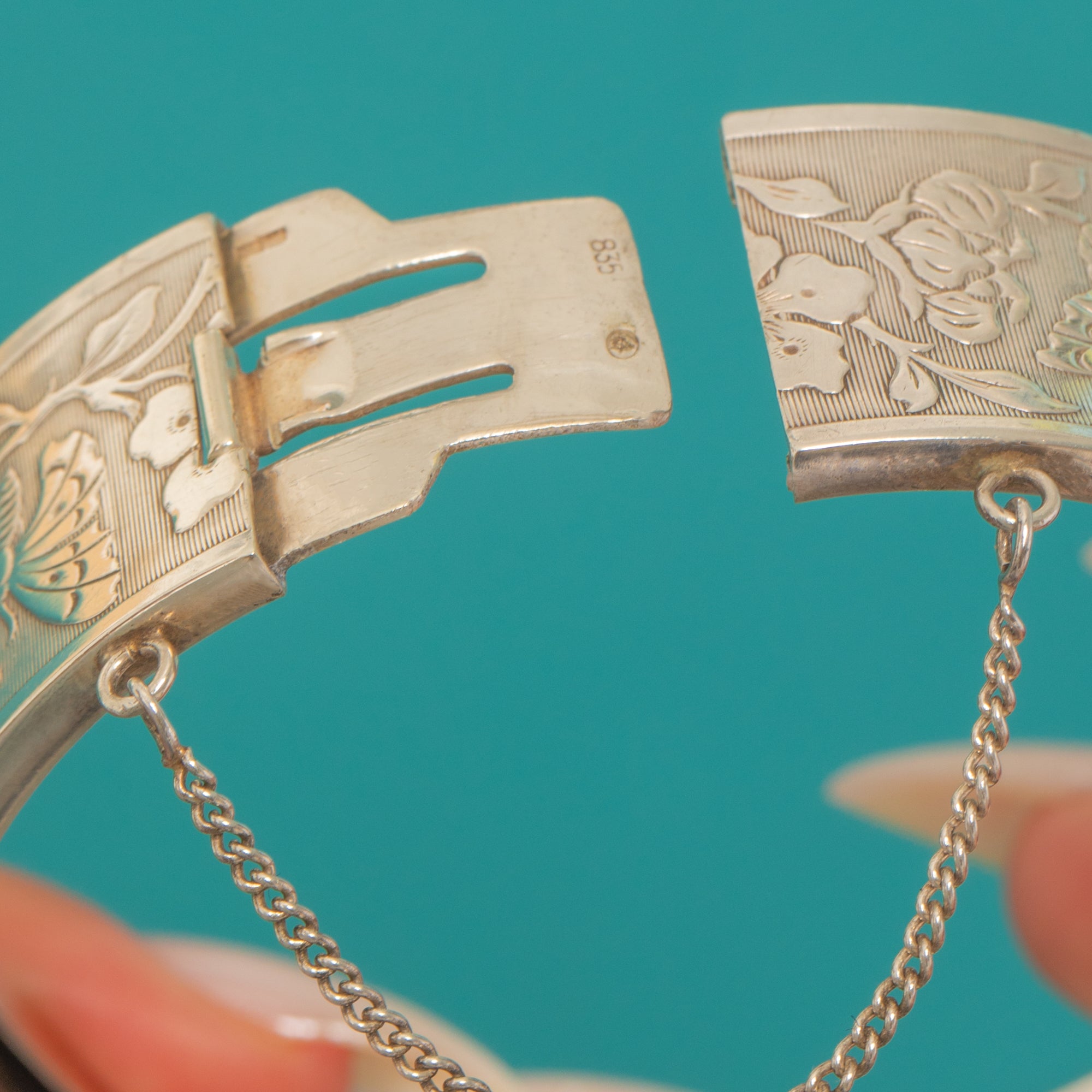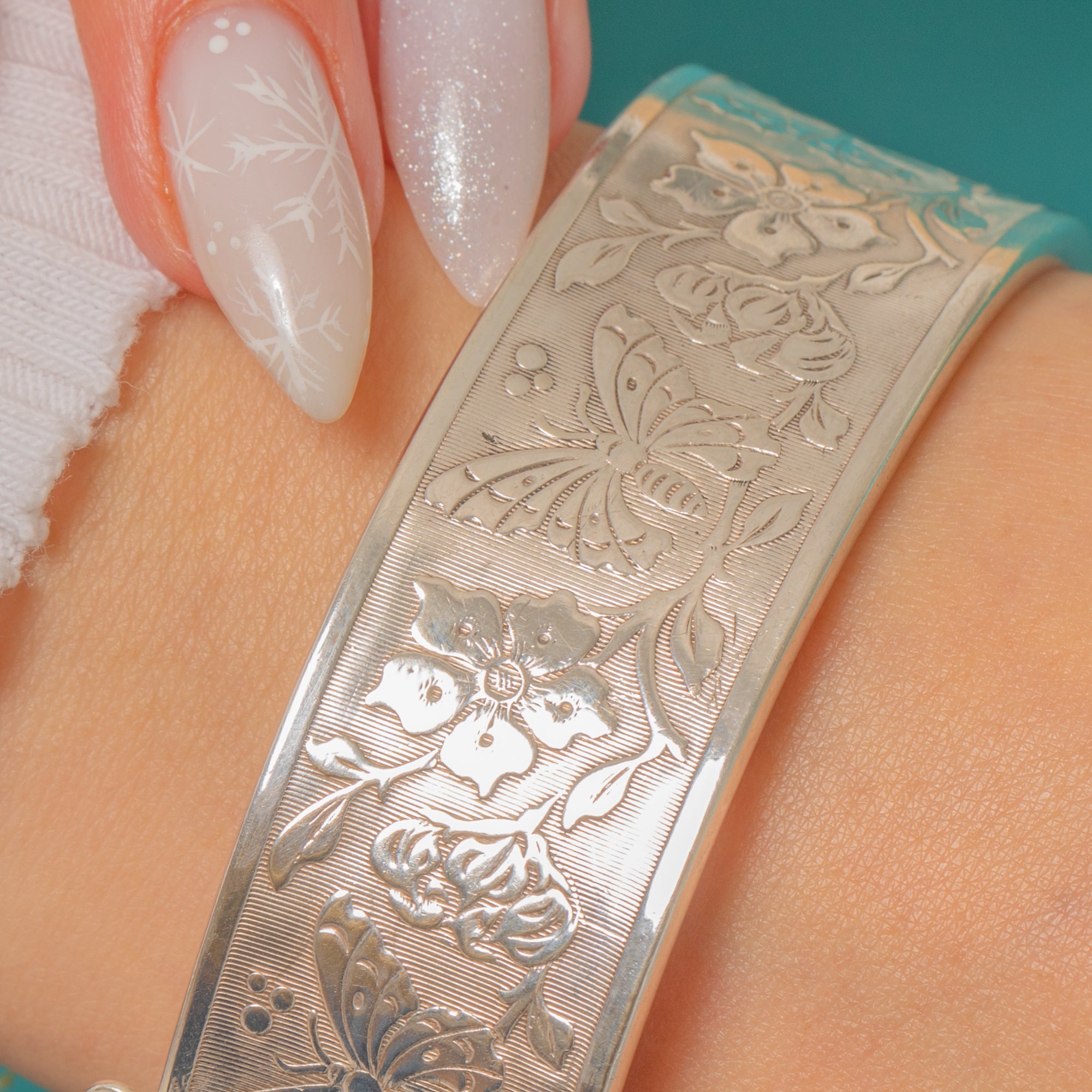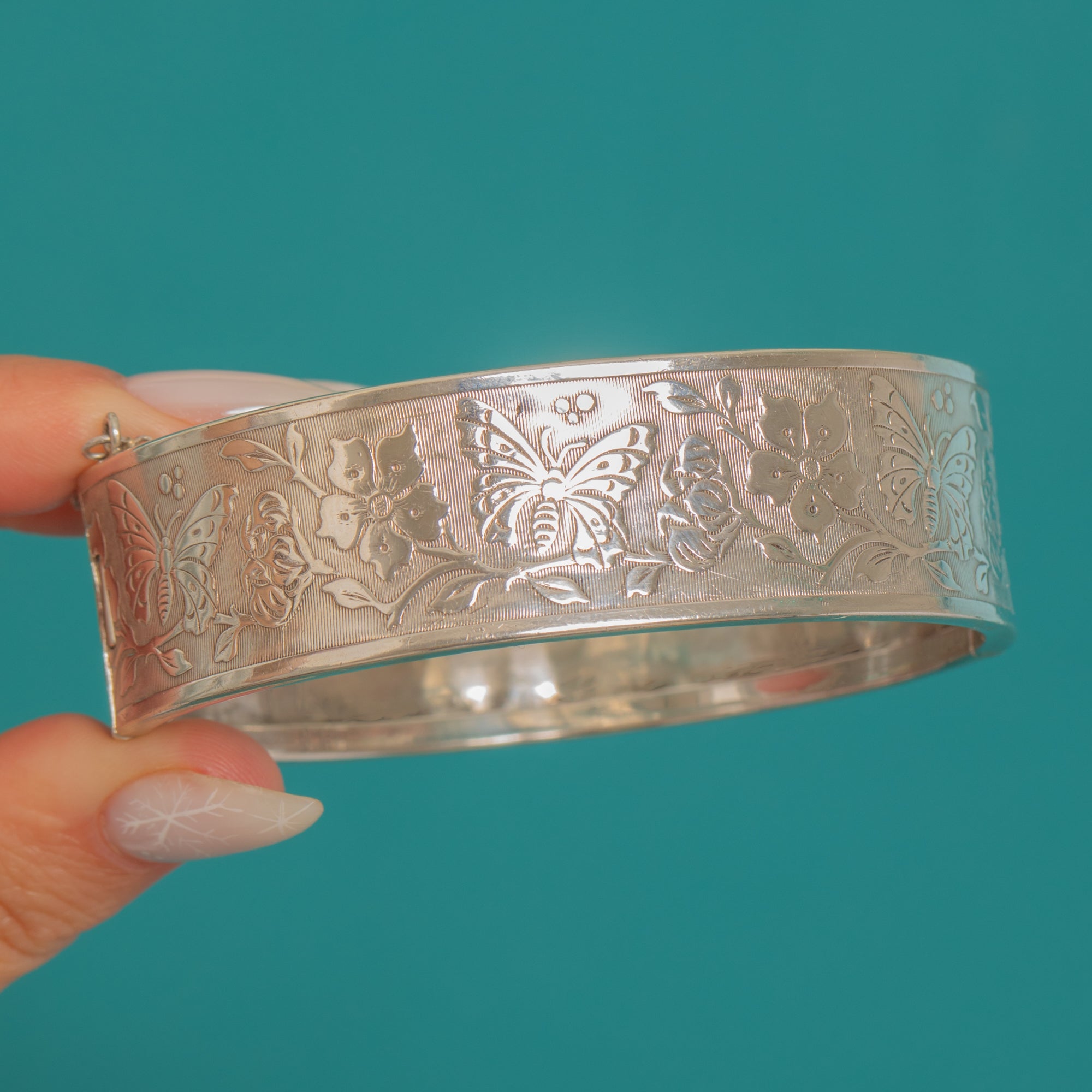 A wide, vintage Silver cuff bangle alive with bright-cut sparkle, this hinged cuff is intricately engraved with butterflies and flowing floral sprays over a fine linear ground. Raised border rims frame the design beautifully, giving a bold yet refined presence that feels timeless and nature-inspired.