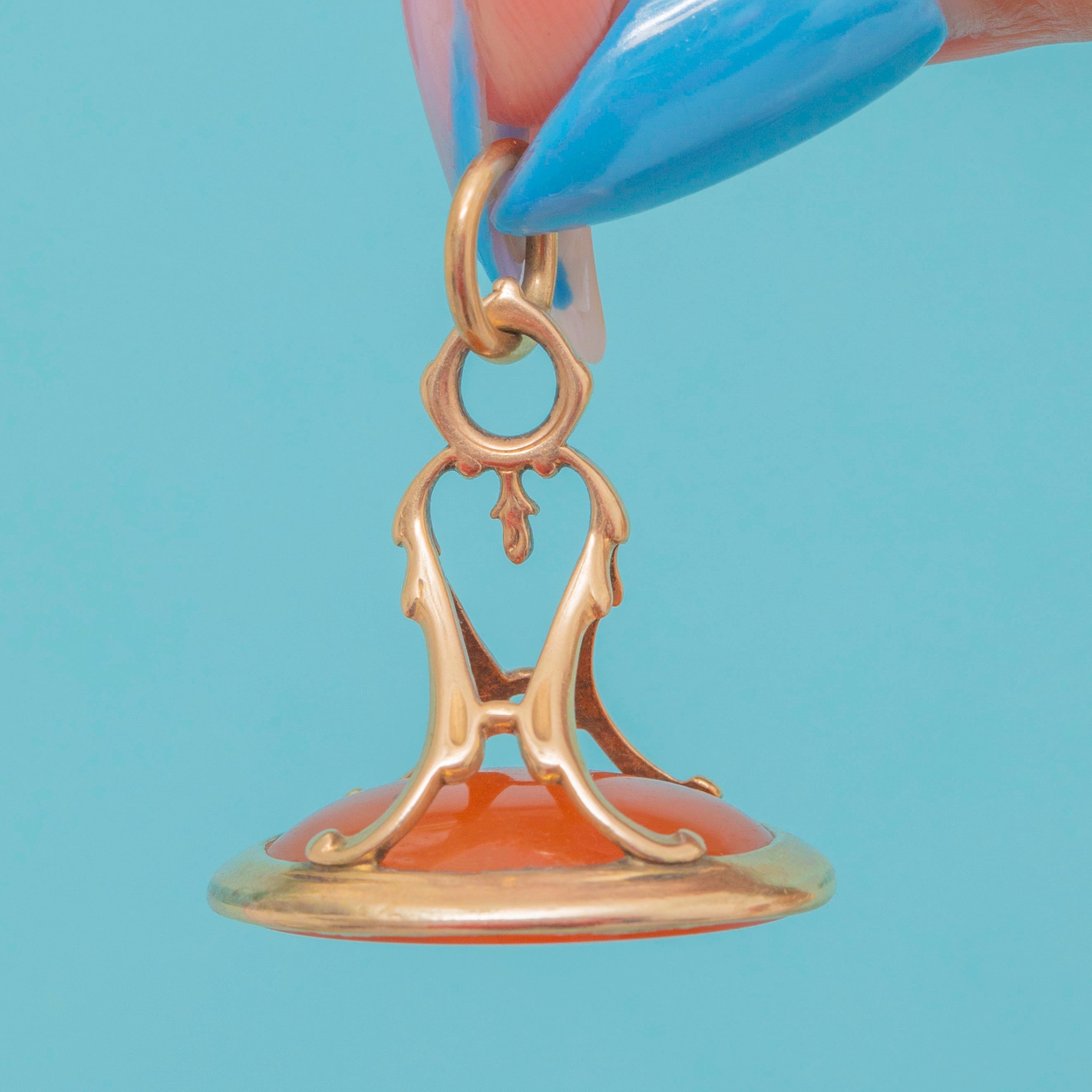 This Georgian wax seal pendant has been crafted from solid 14ct Gold, with an ornate, openwork pillar that holds a solid slab of Carnelian at its base.