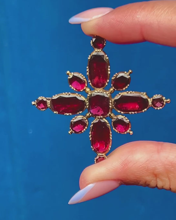 You will be blown away by this Georgian 15ct Gold flat-cut Garnet Maltese cross brooch! Steeped in Georgian charm, flat cut Garnets adorn every inch of this Maltese cross. Graduating in size, her intricately shaped Garnets exude fabulous red wine hues.