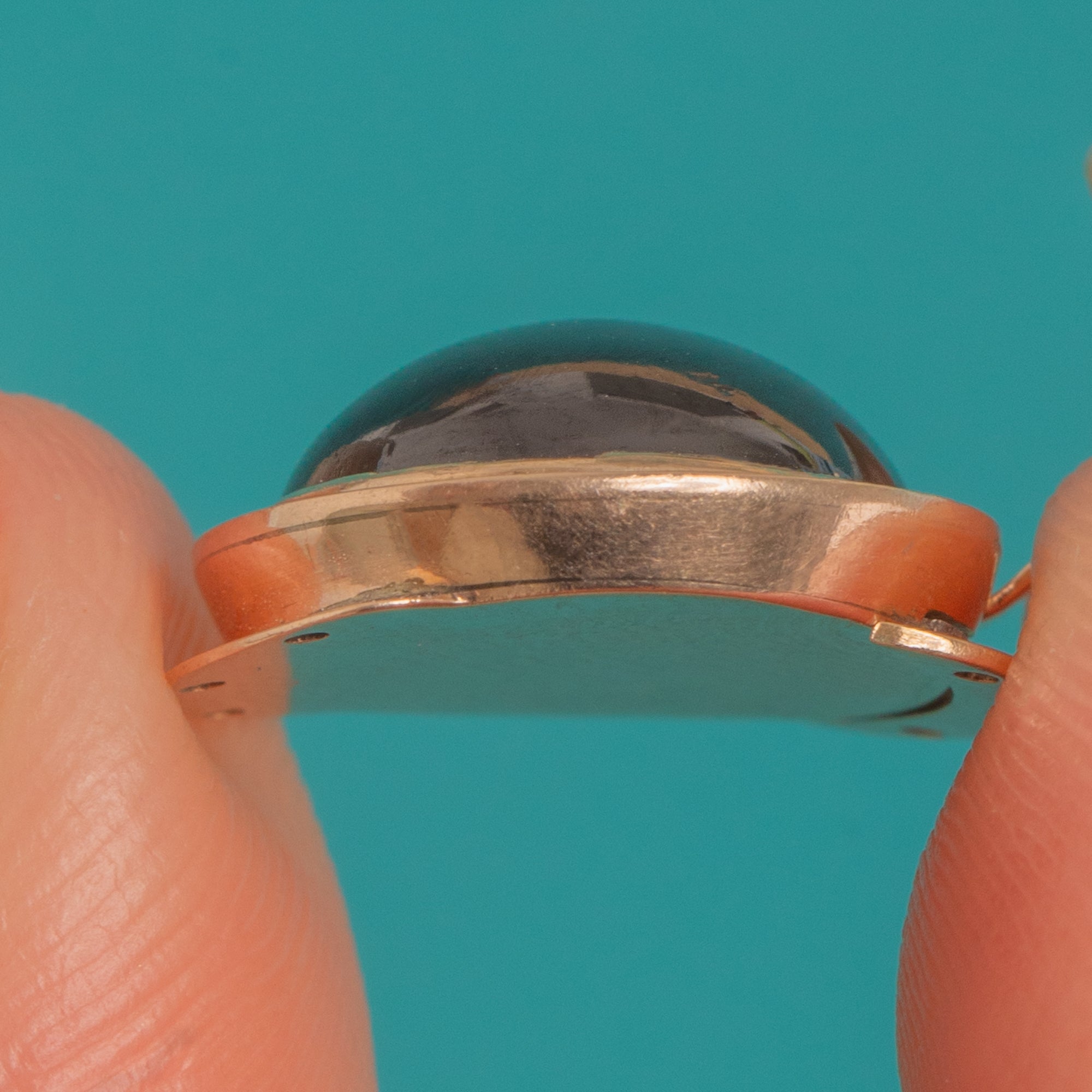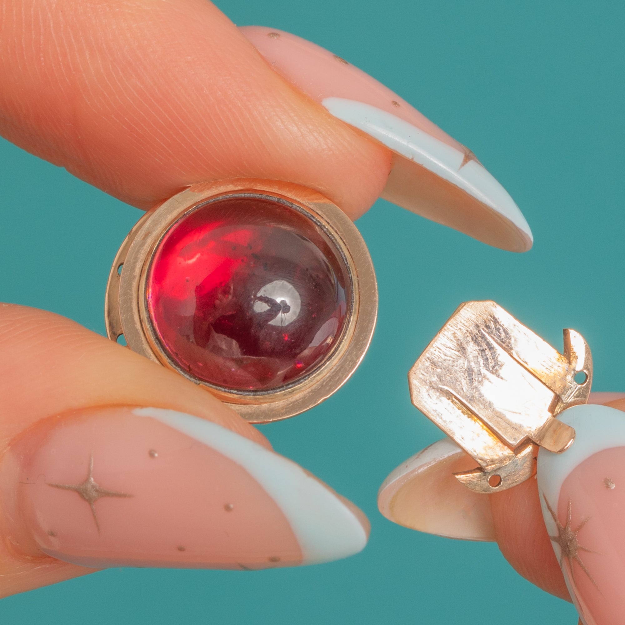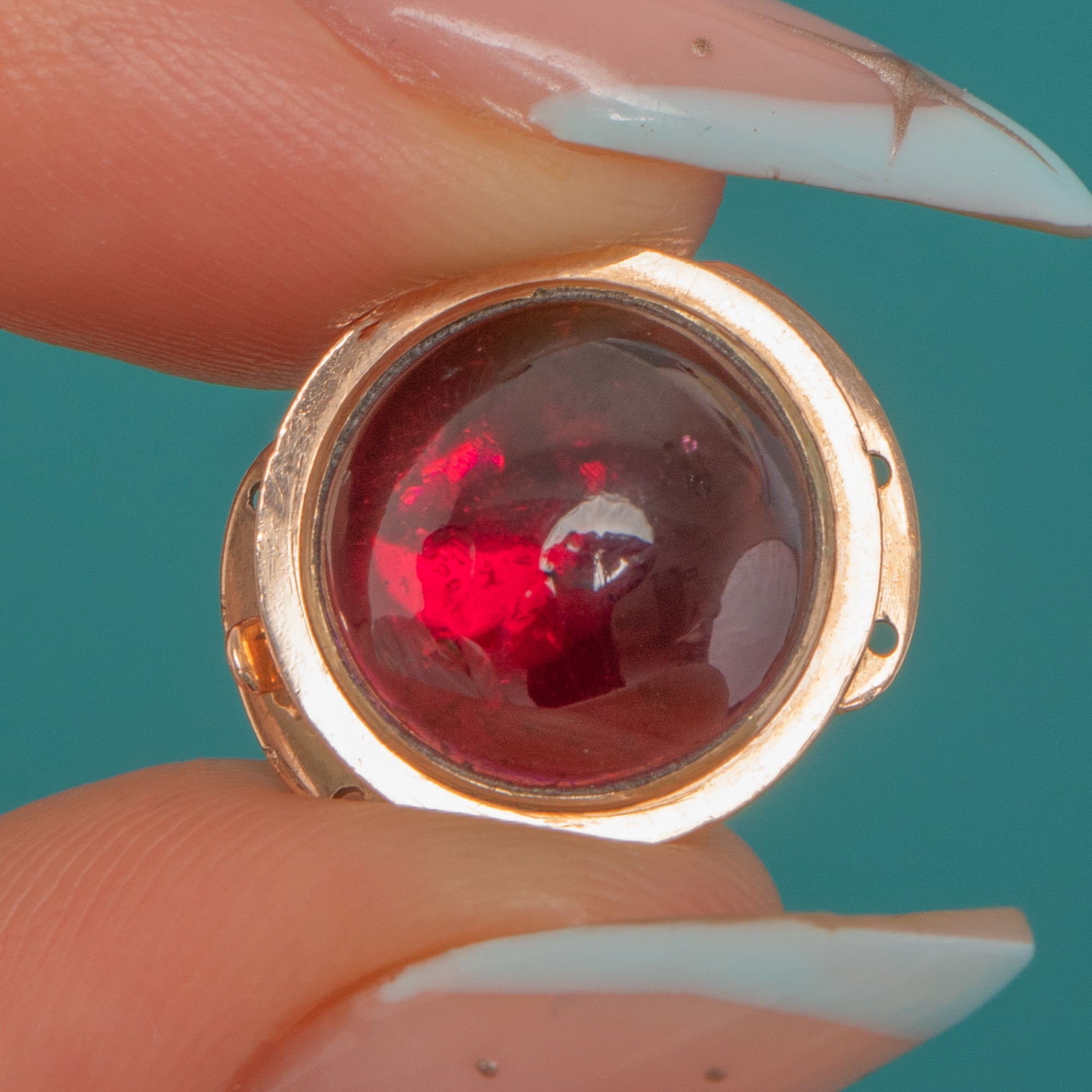 Understated and beautifully made, it’s a classic Georgian jewel with a focus on pure form and quality materials. The Garnet’s high dome adds depth and drama, while the warm 15ct Gold provides a soft, antique glow. A charming finishing touch for your favourite chain or bracelet, with that coveted early 19th-century allure.