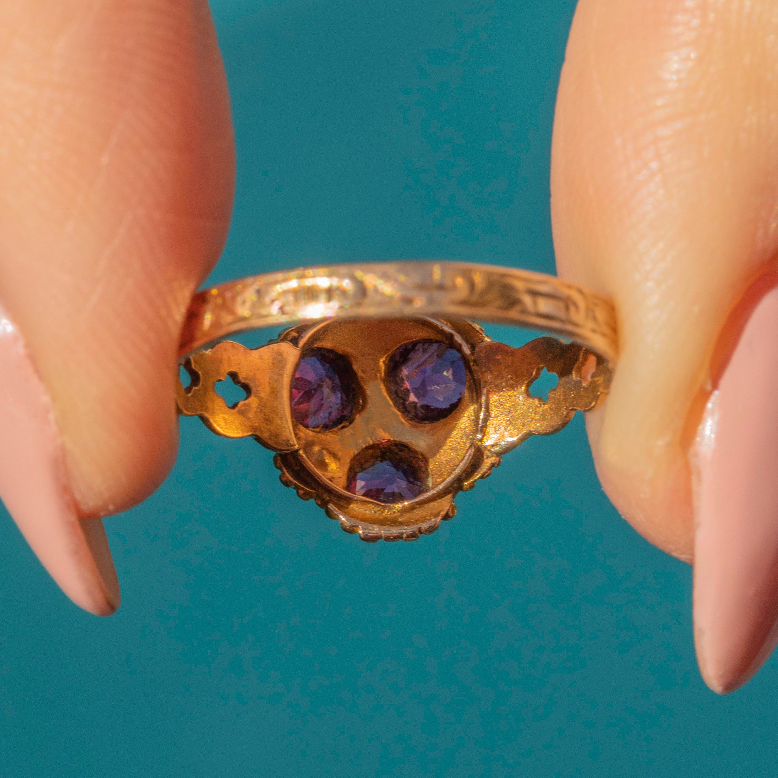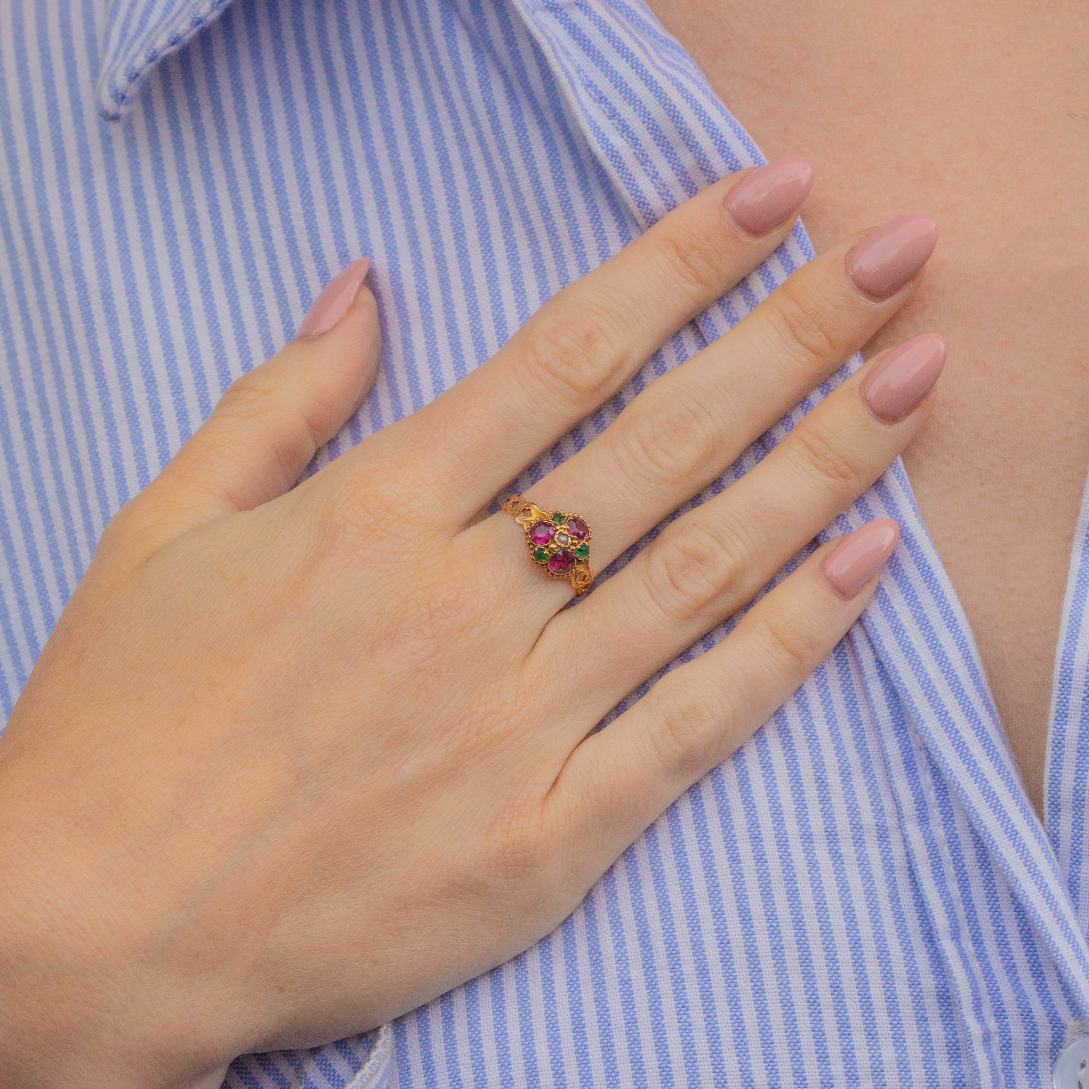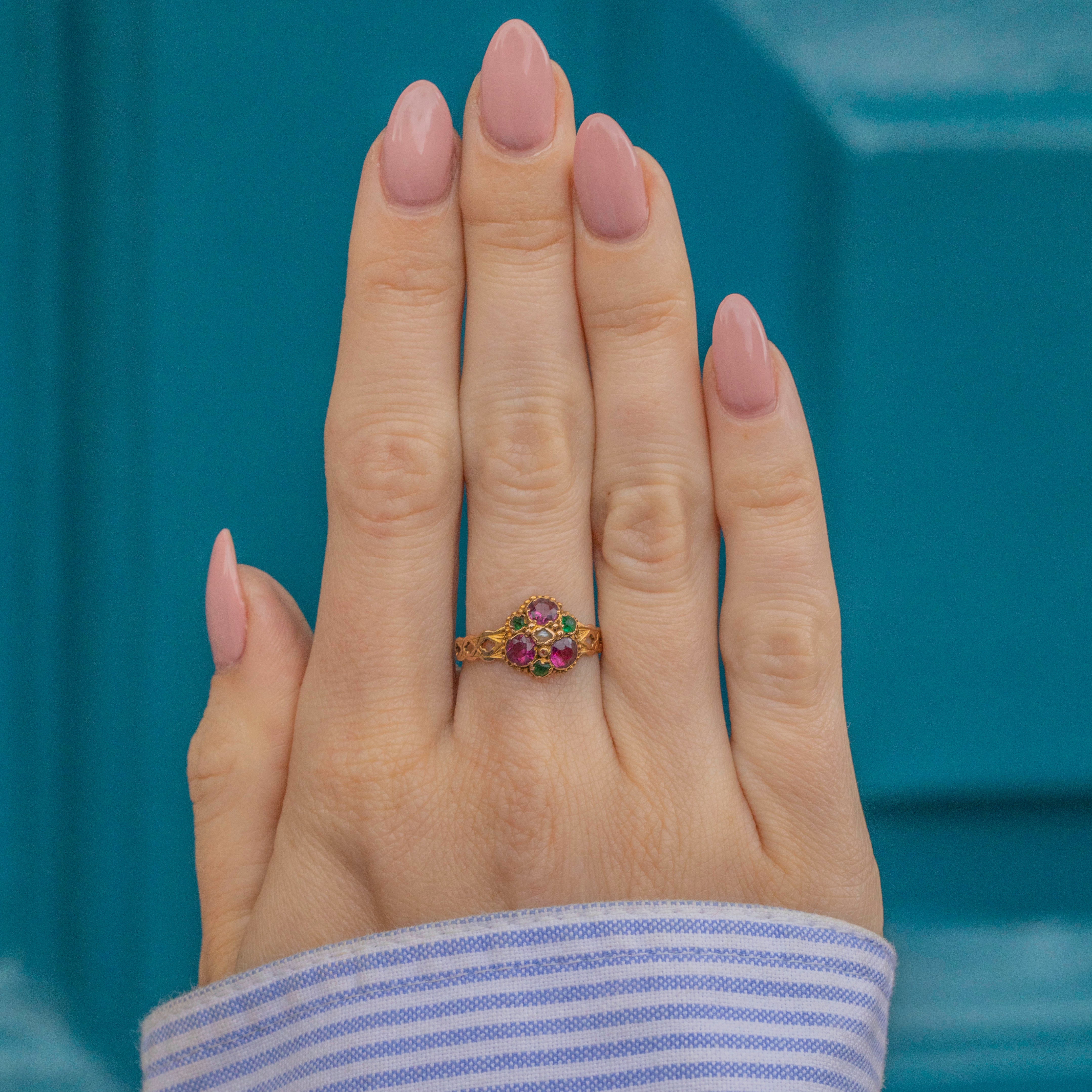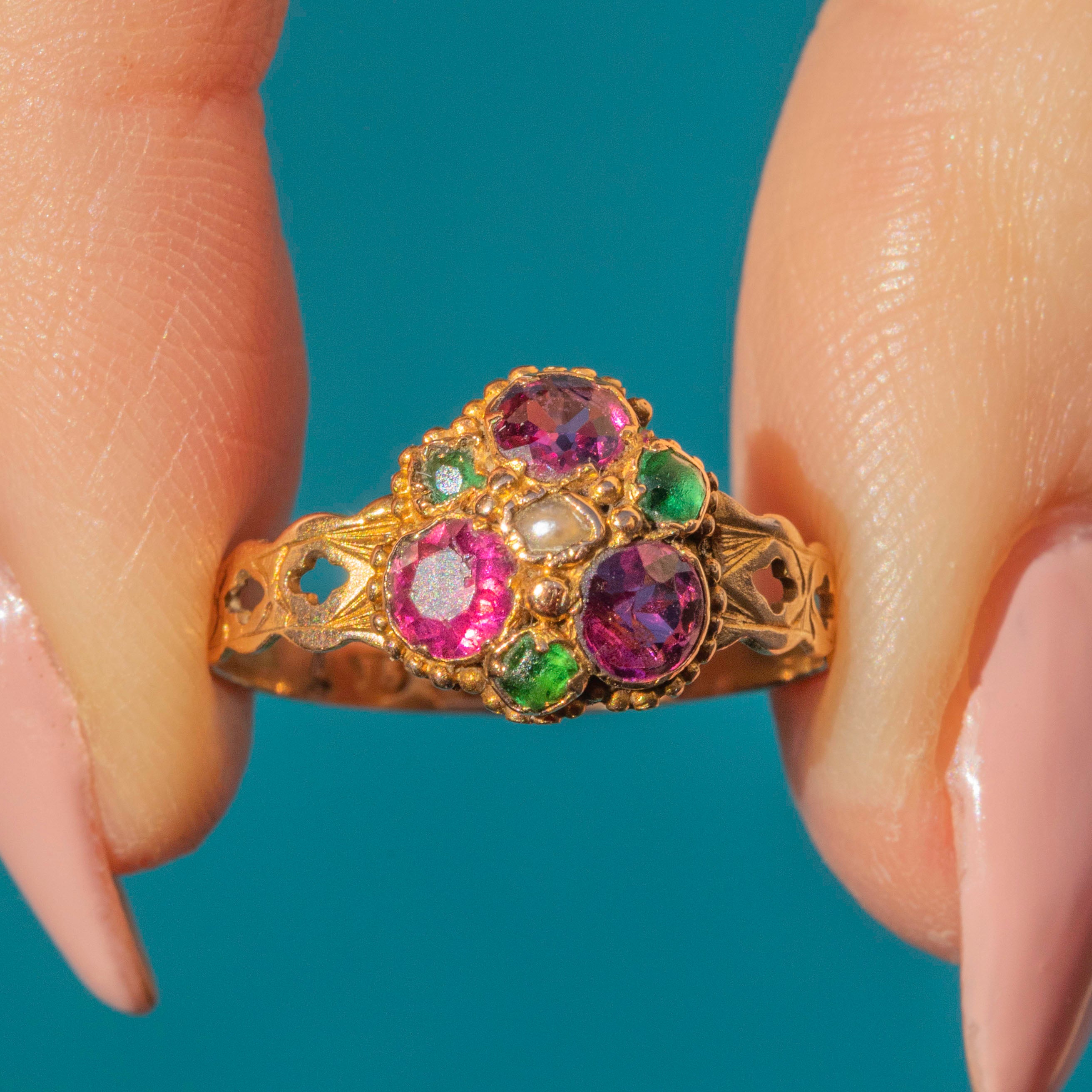 Full of charm, this Georgian 15ct Gold ring is adorable and features a vibrant floral design set with fuchsia Garnets framed by beautiful engravings