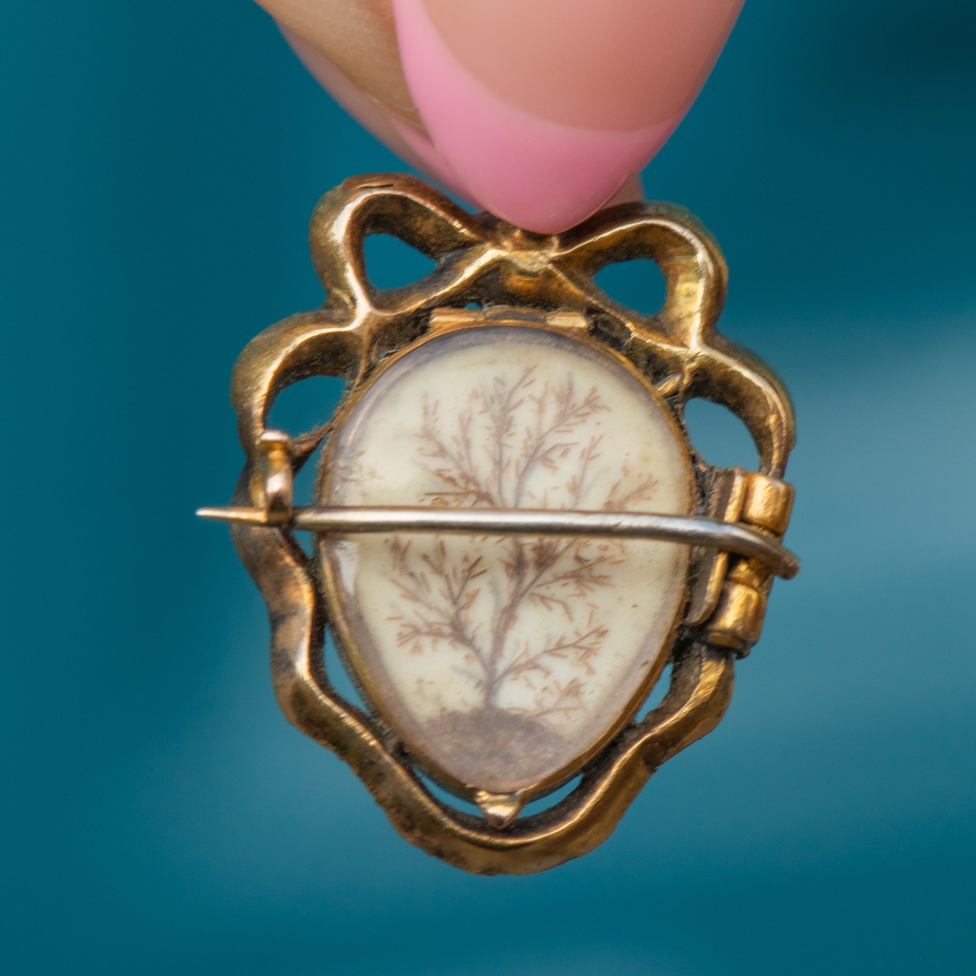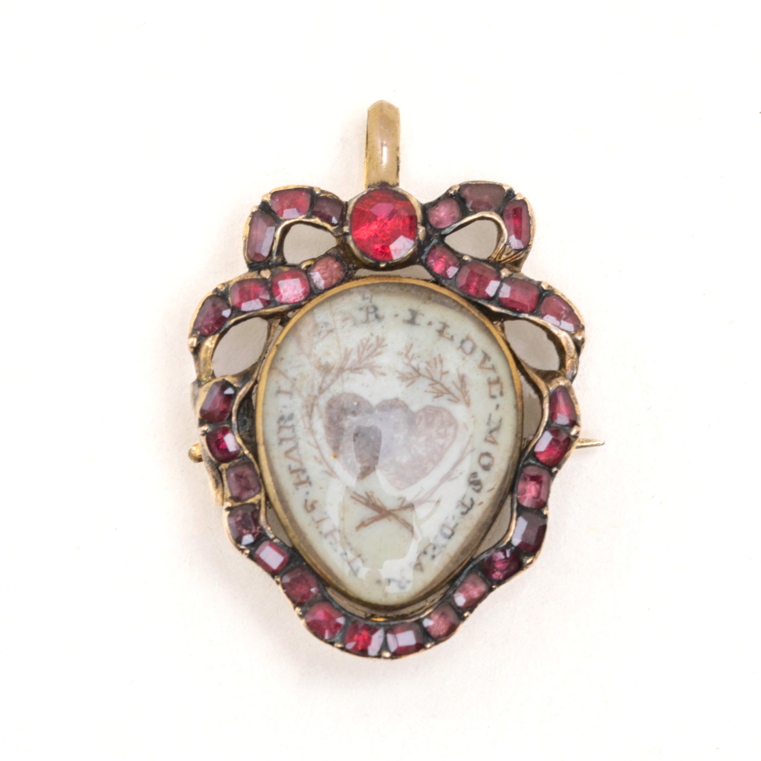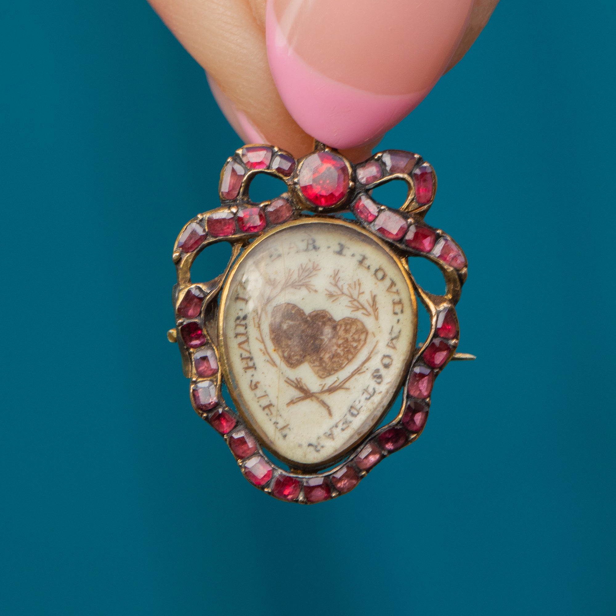 The front of the piece reads "This Hair I Wear, I Love Most Dear", with a double heart that has been woven from hair. As you look towards the back of the piece, there is a tree of life, which acts as a symbol of the afterlife; this is also woven from hair and makes this an incredibly rare find.