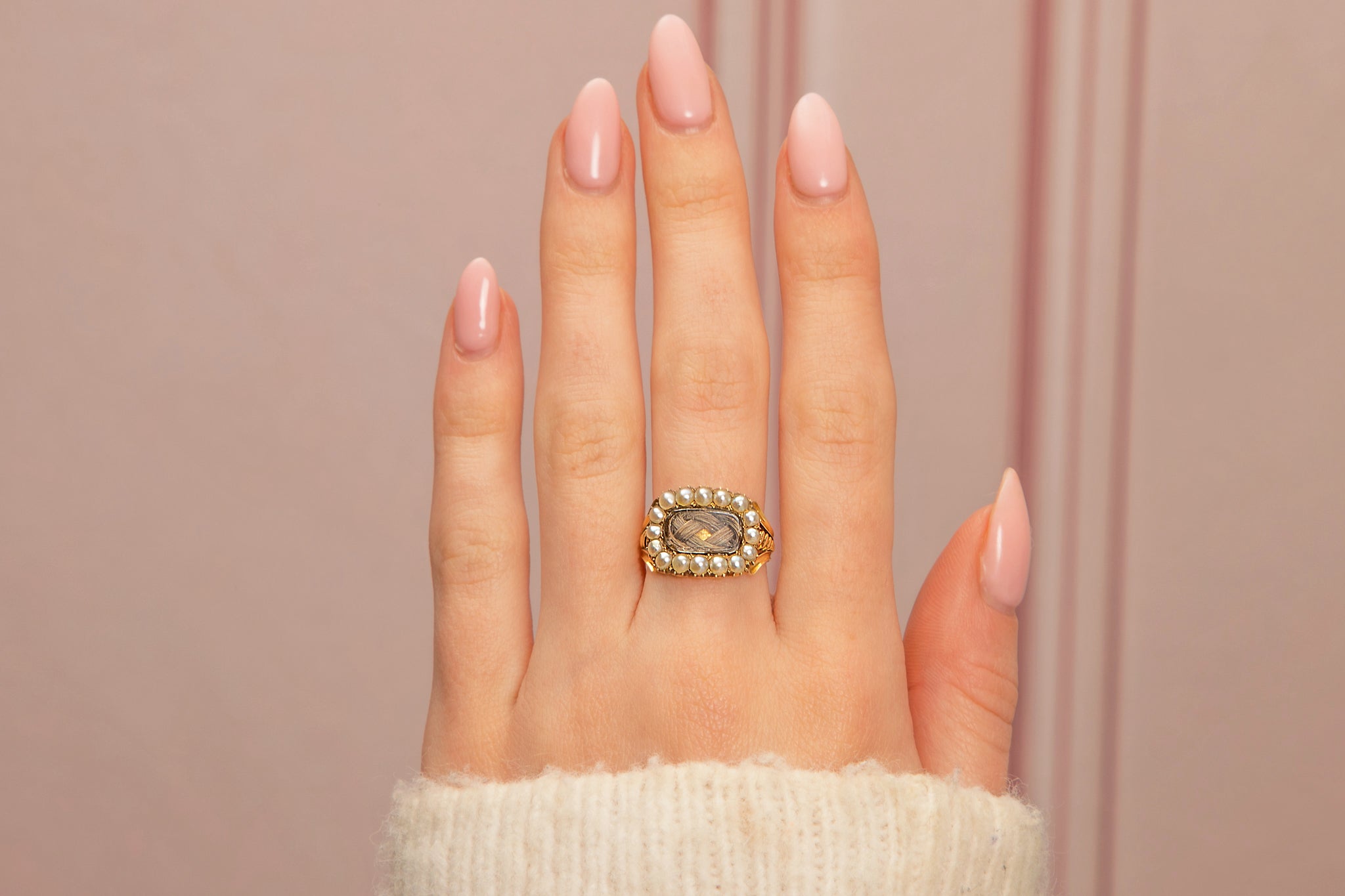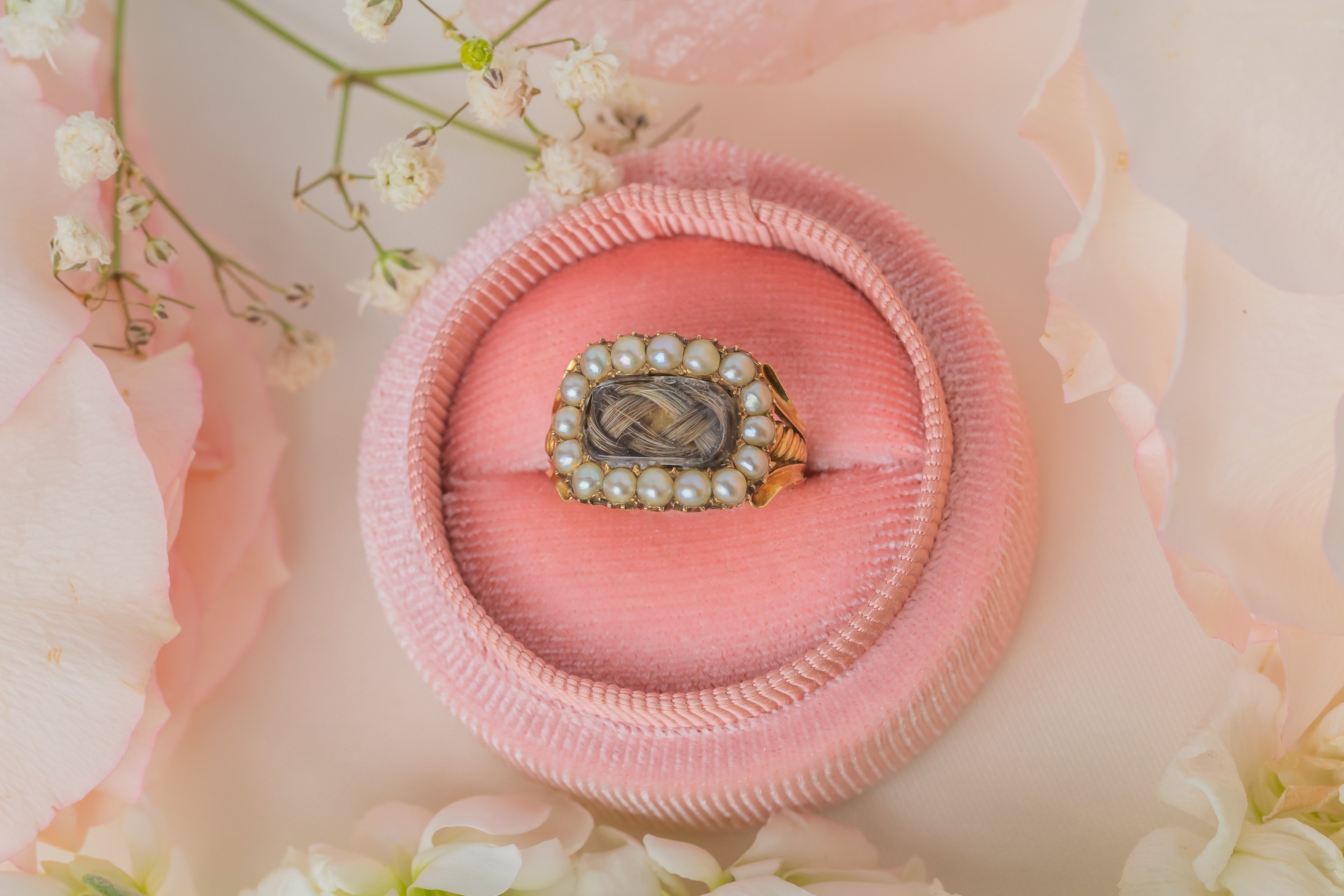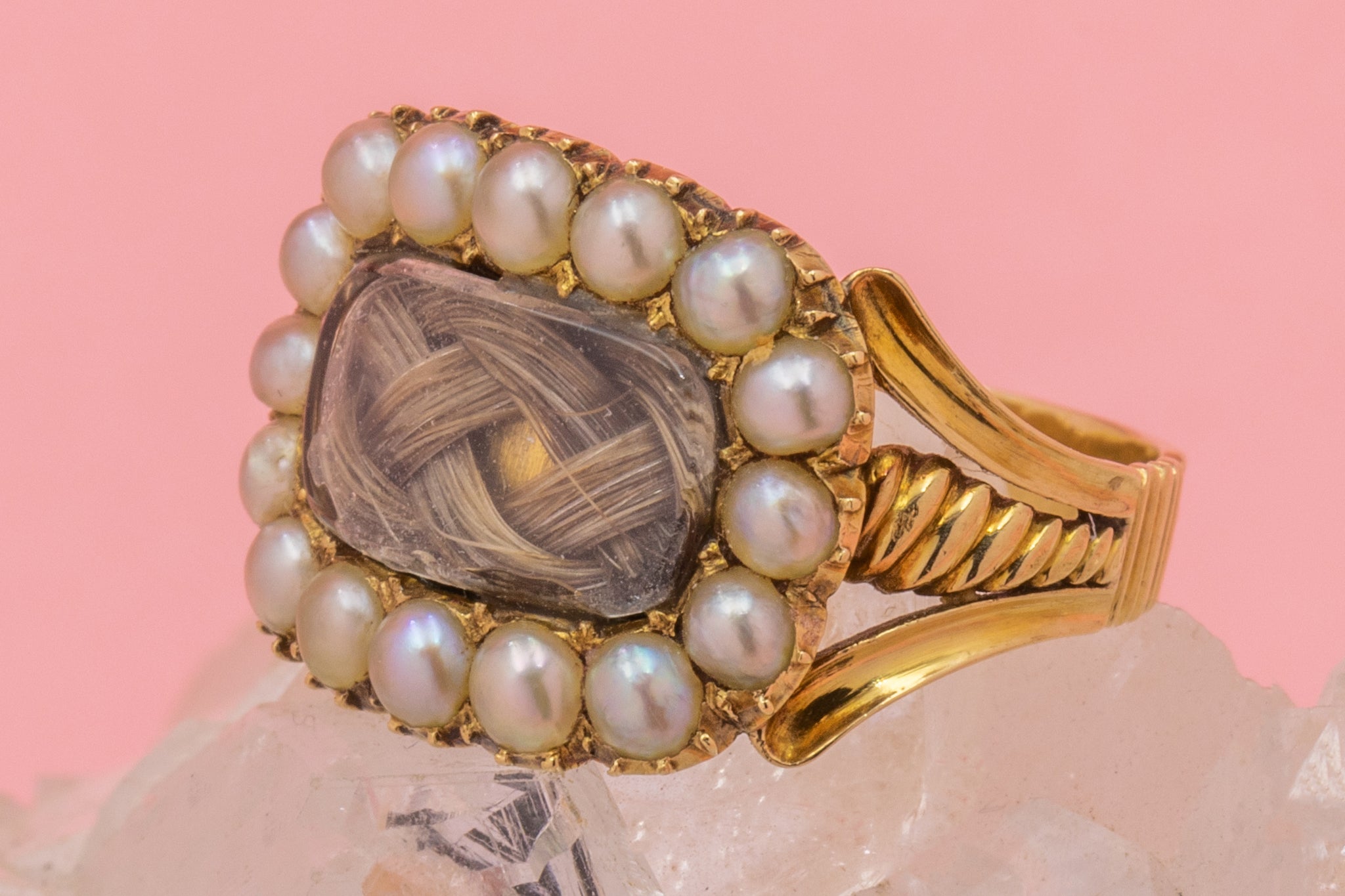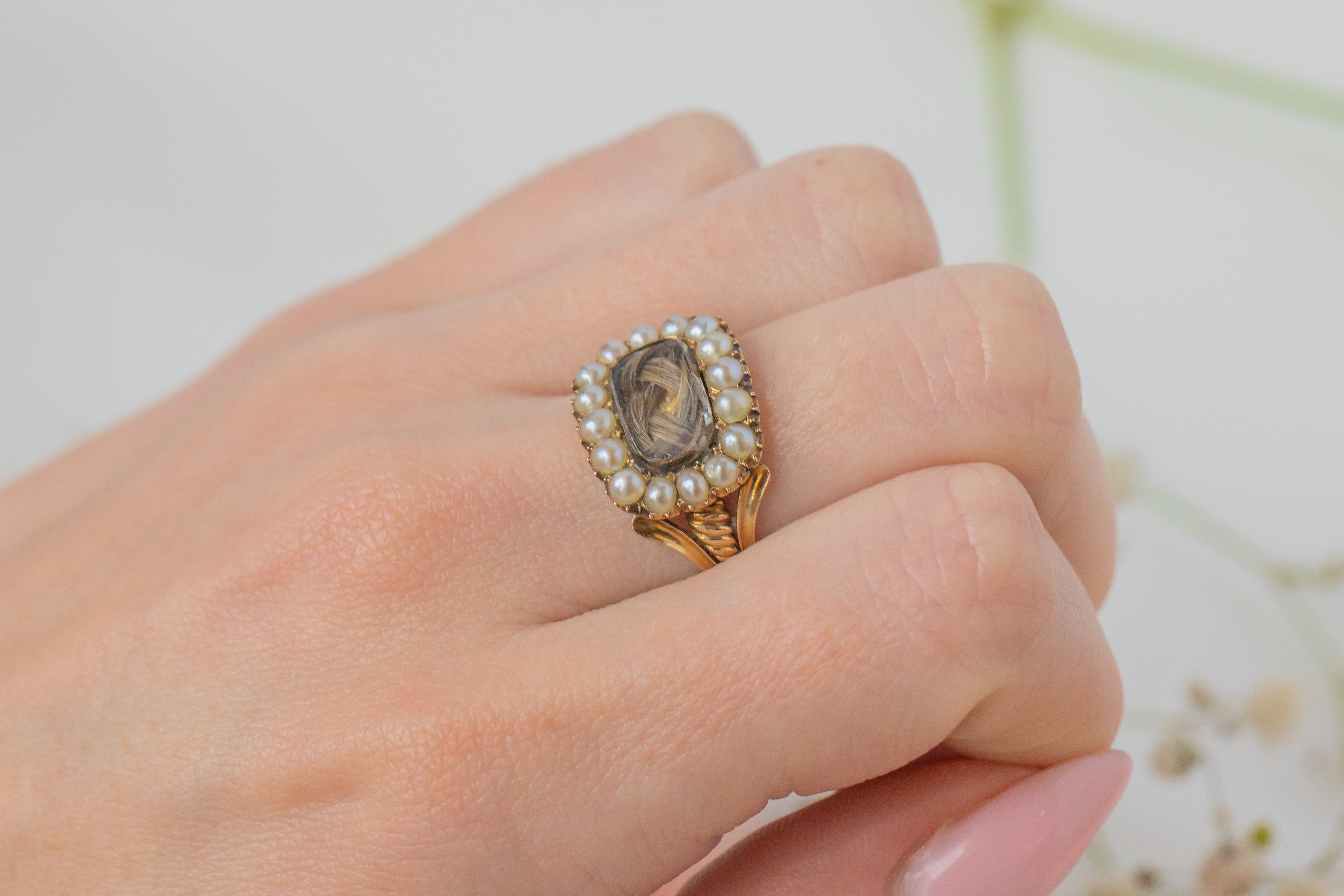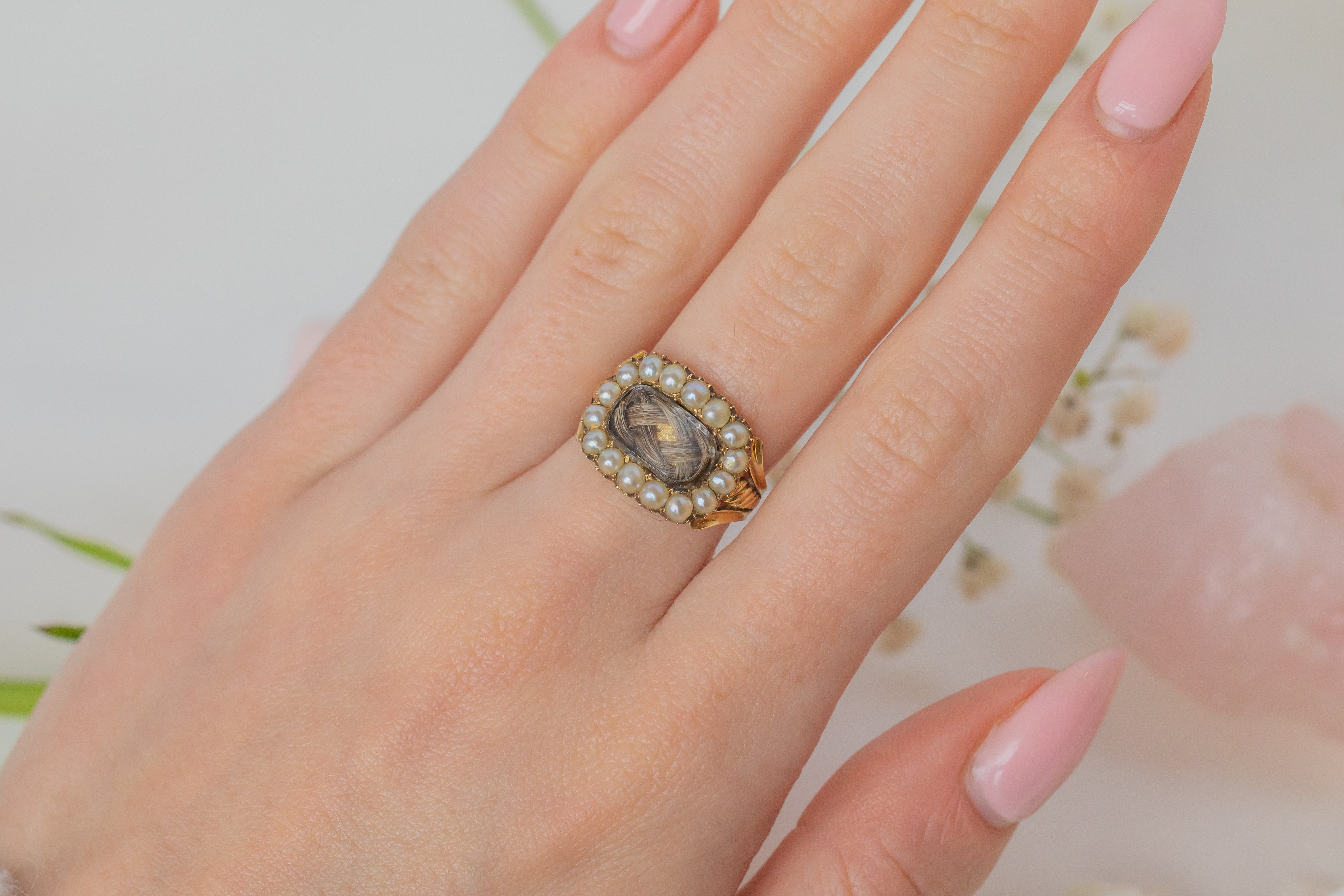 We not only love the story behind this ring, but how it epitomises Georgian sentimental jewellery, encapsulating the fine craftsmanship each piece of mourning jewellery entails. Held securely around your finger with saturated 15ct Gold, this antique ring flaunts ornate shoulder work akin to Greek pillars, she truly is a work of art!