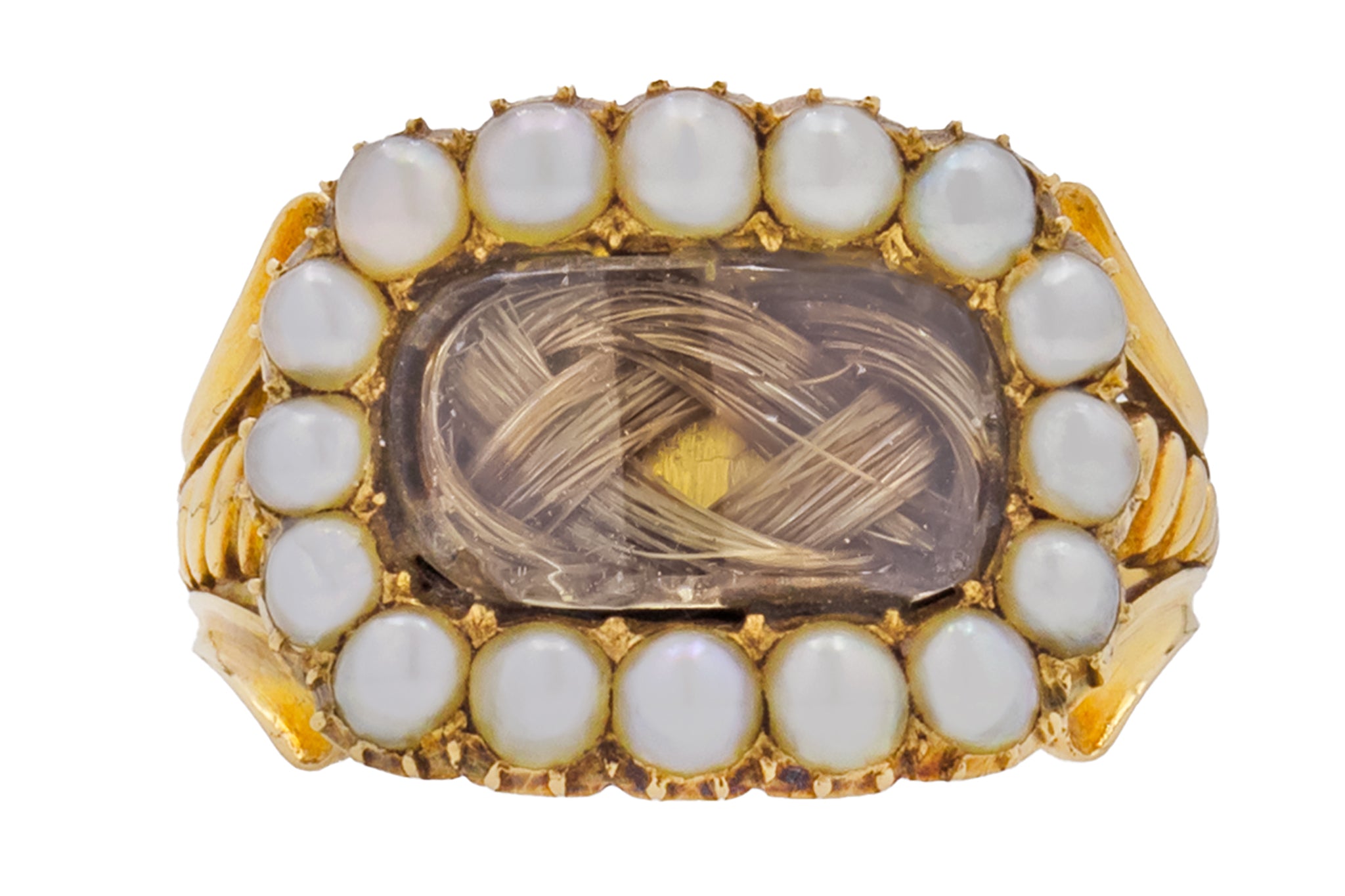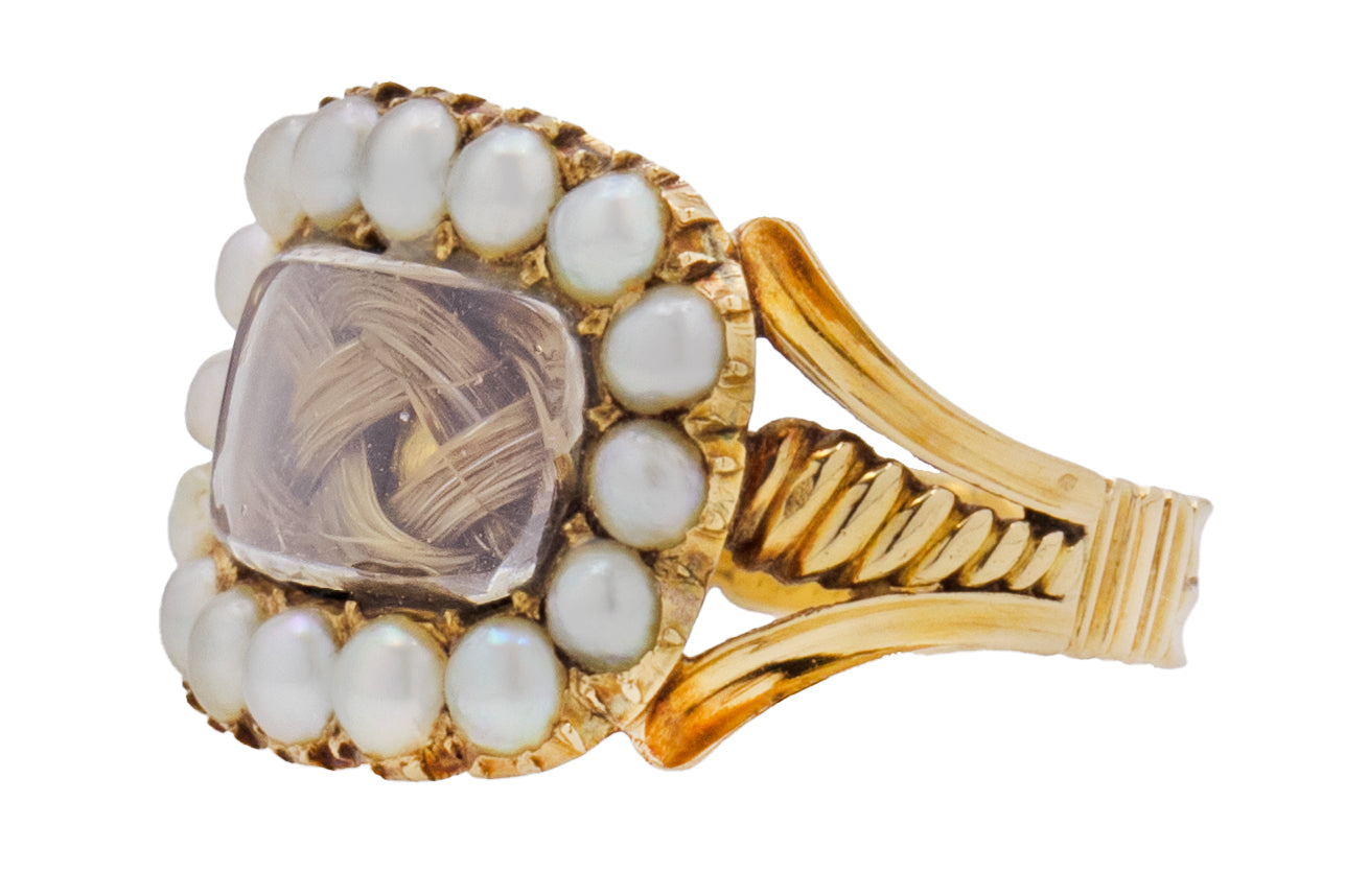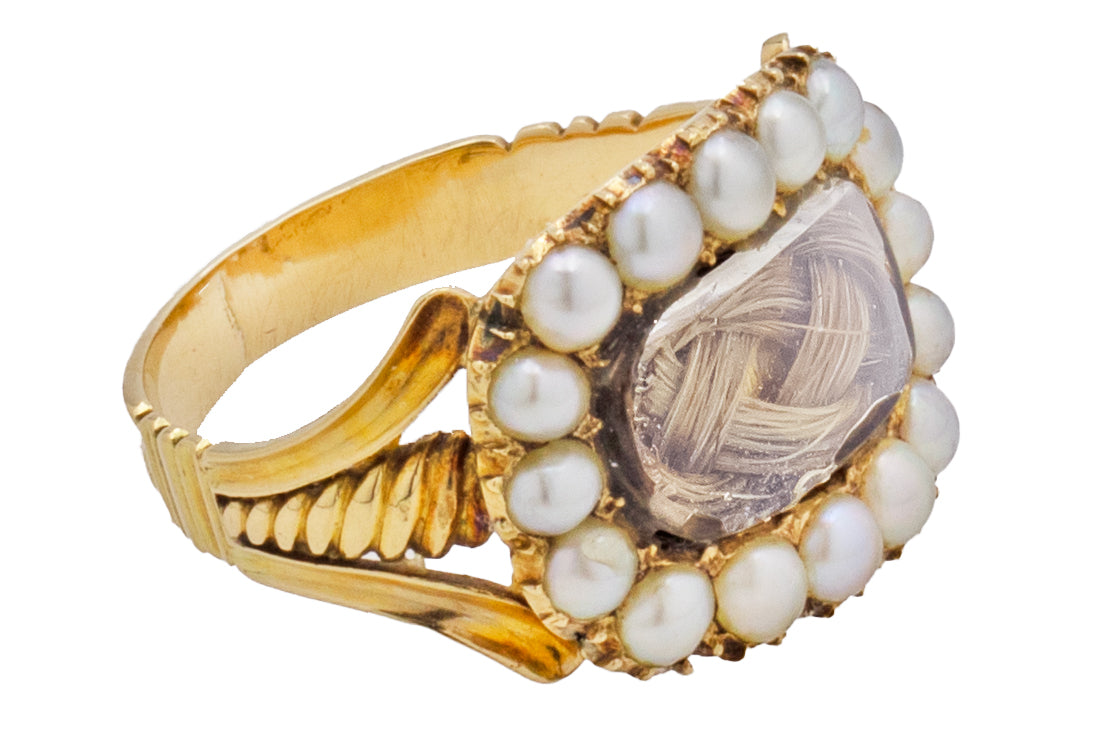 EXCELLENT: This rare Georgian 15ct Gold mourning ring is in pristine condition throughout! We surmise that all of the Gold, Pearls and hair are original to the piece, amazing considering its 200 year age! Although her ring band is not completely round, she still fits comfortable as she adorns your hand. The inscription on the reverse is clear and readable - a fabulous relic from the past.