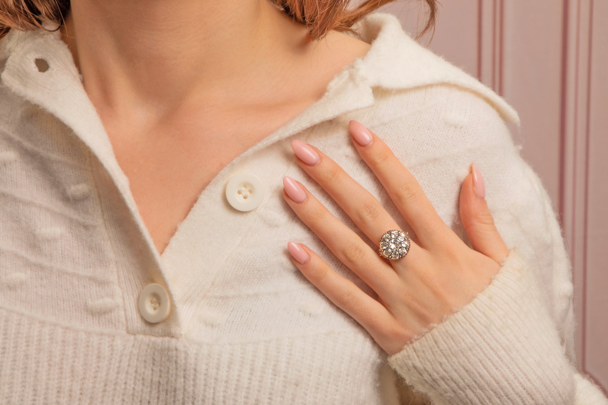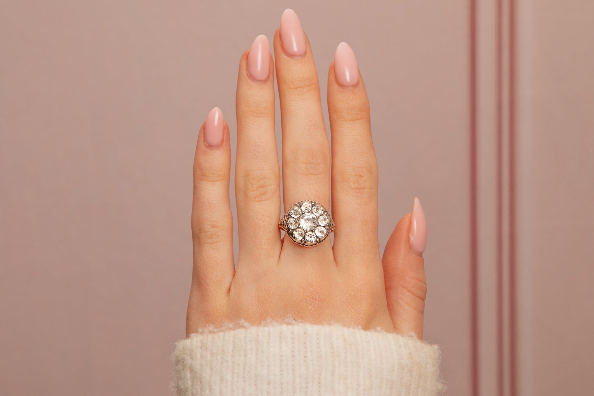 This magnificent Georgian 15ct Gold Paste cluster ring will create an exquisite statement! Inlaid with nine sparkling Black Dot Diamond Paste gemstones, this pretty Georgian ring is an easy way to elevate your antique jewellery collection!