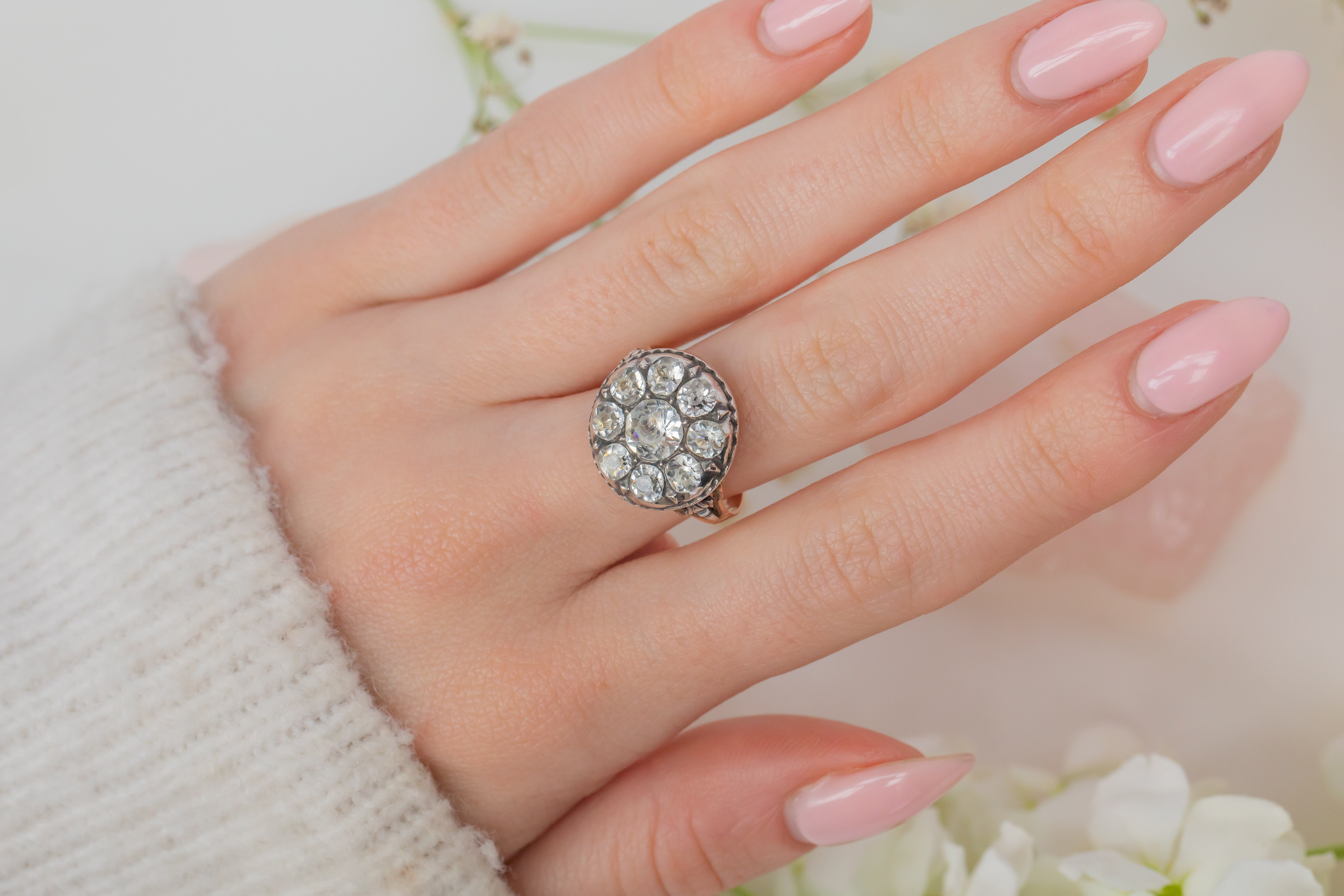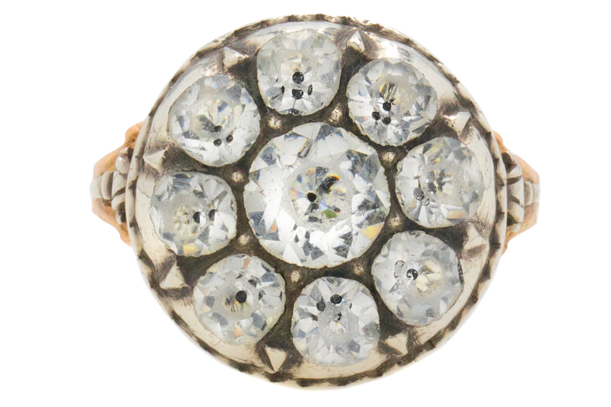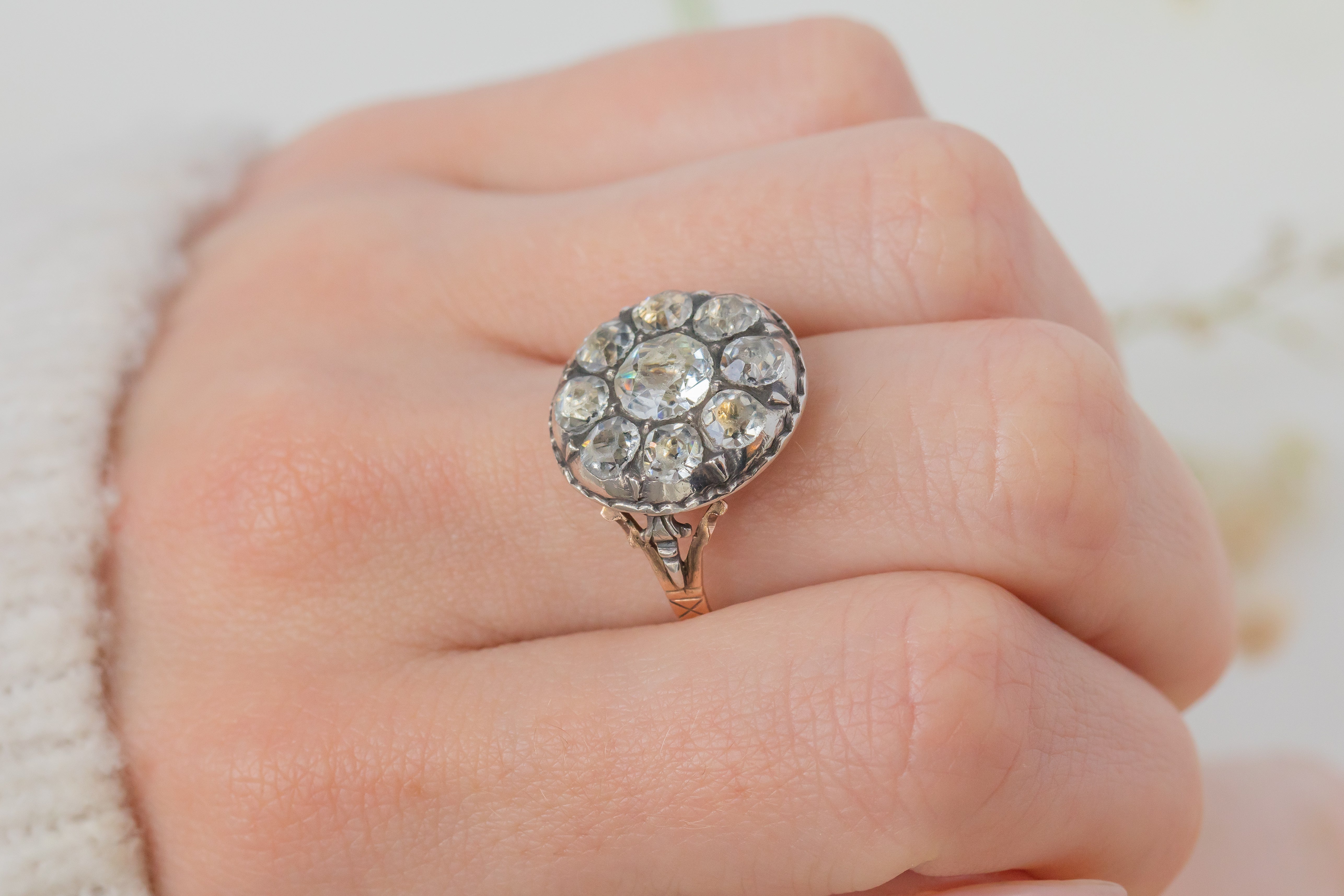 EXCELLENT. This Georgian Paste cluster dress ring is in excellent condition. With no dings on its Sterling Silver back or 15ct Gold band, this is a remarkable ring. She has accrued an admirable patina but we feel this only adds to her antique charm. The Black Dot Paste is bright, secure and without chips or fleabites! The engraved band shows no signs of resizing. This is a lovely antique heirloom!