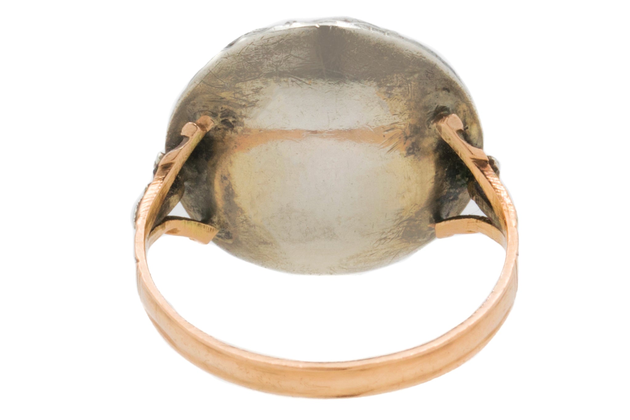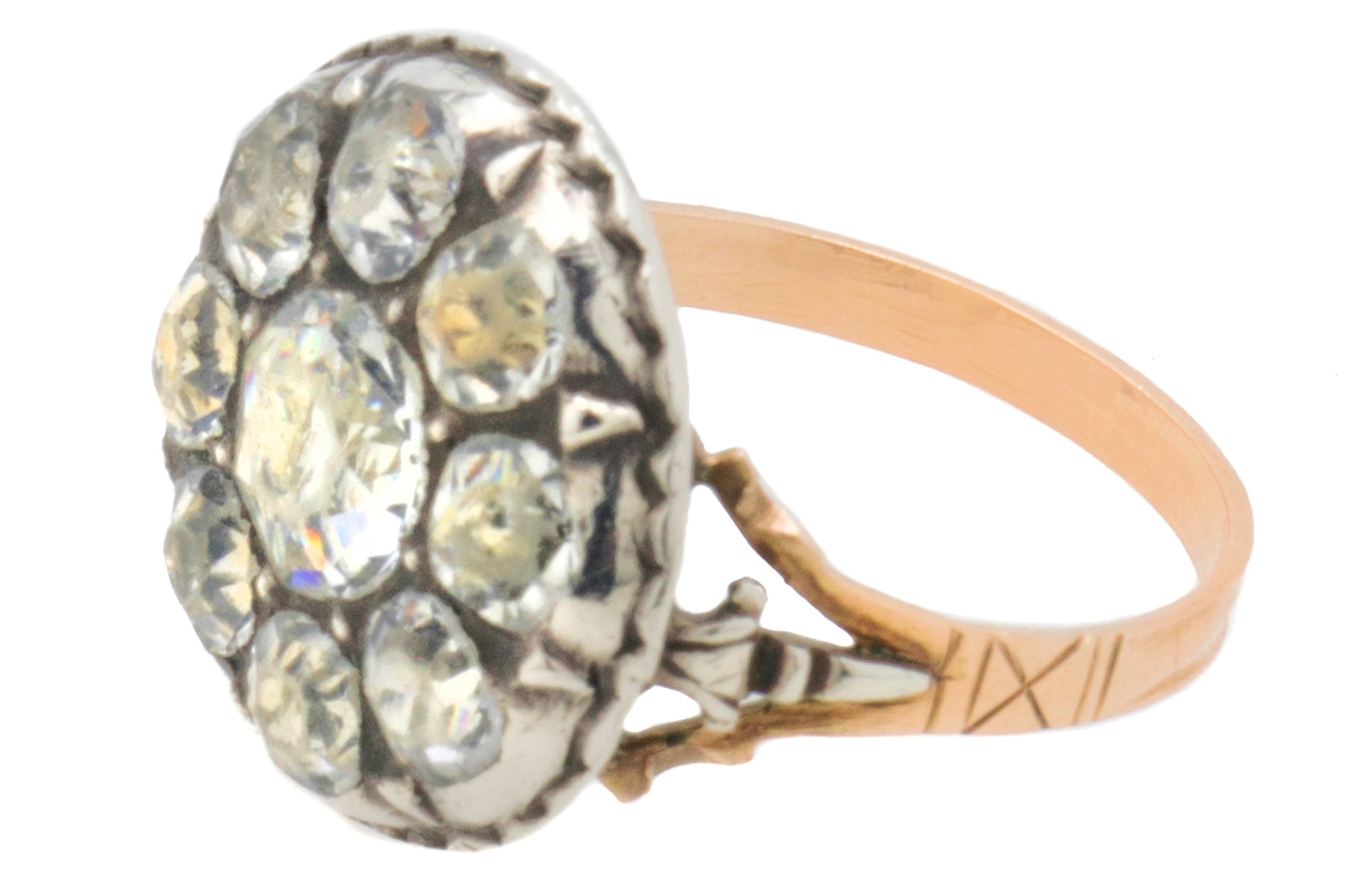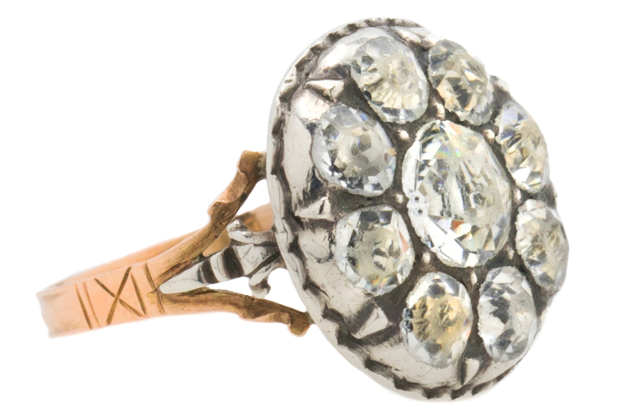 EXCELLENT. This Georgian Paste cluster dress ring is in excellent condition. With no dings on its Sterling Silver back or 15ct Gold band, this is a remarkable ring. She has accrued an admirable patina but we feel this only adds to her antique charm. The Black Dot Paste is bright, secure and without chips or fleabites! The engraved band shows no signs of resizing. This is a lovely antique heirloom!