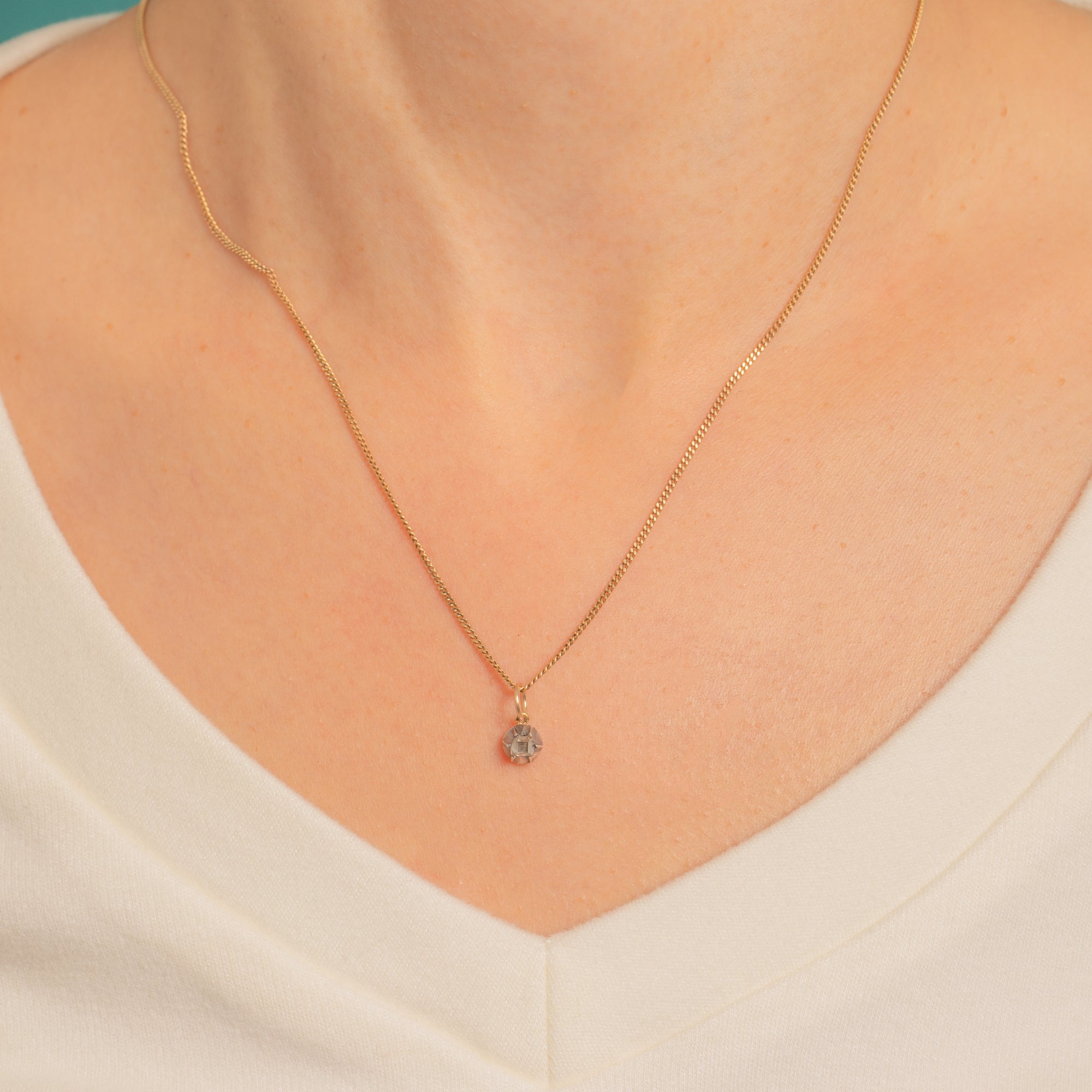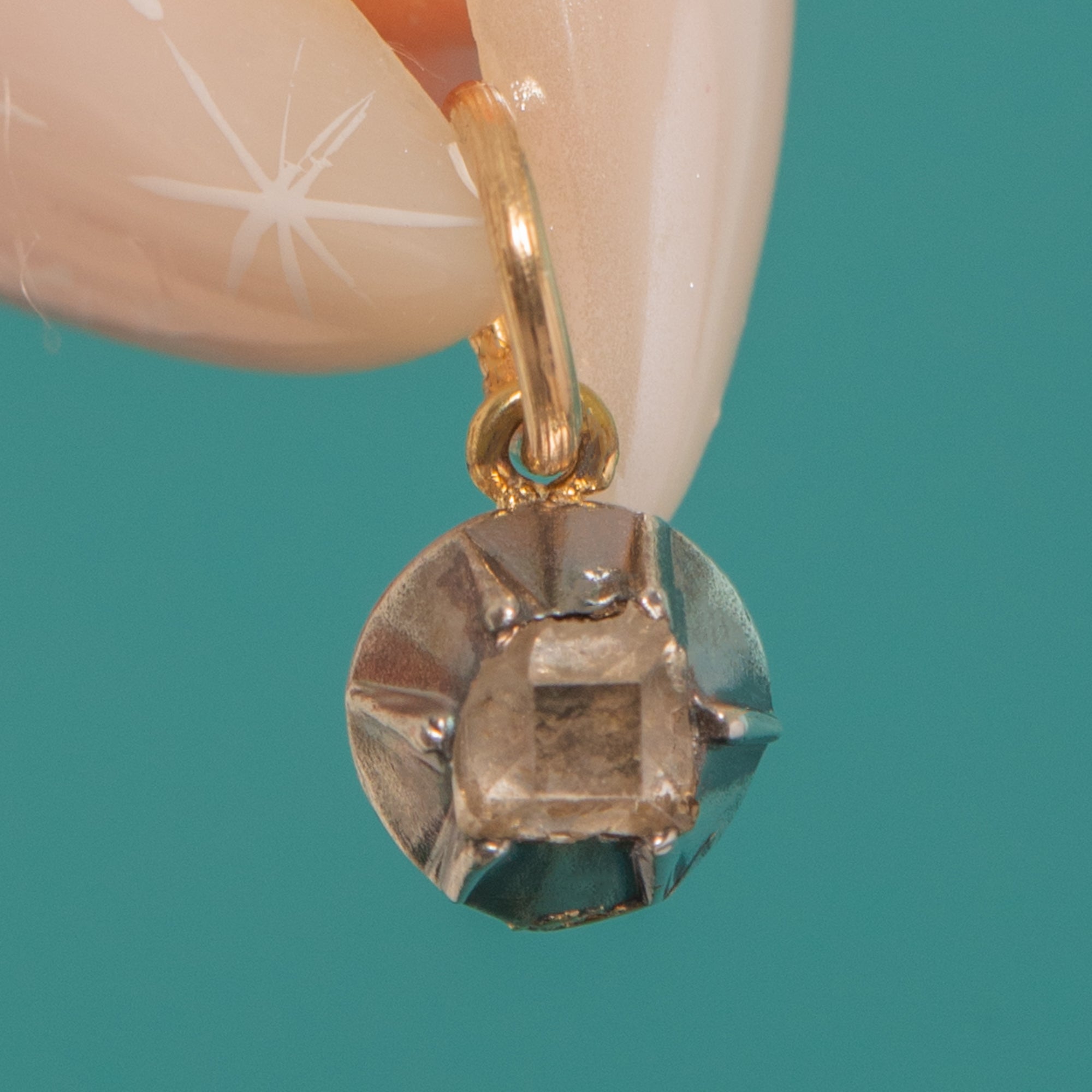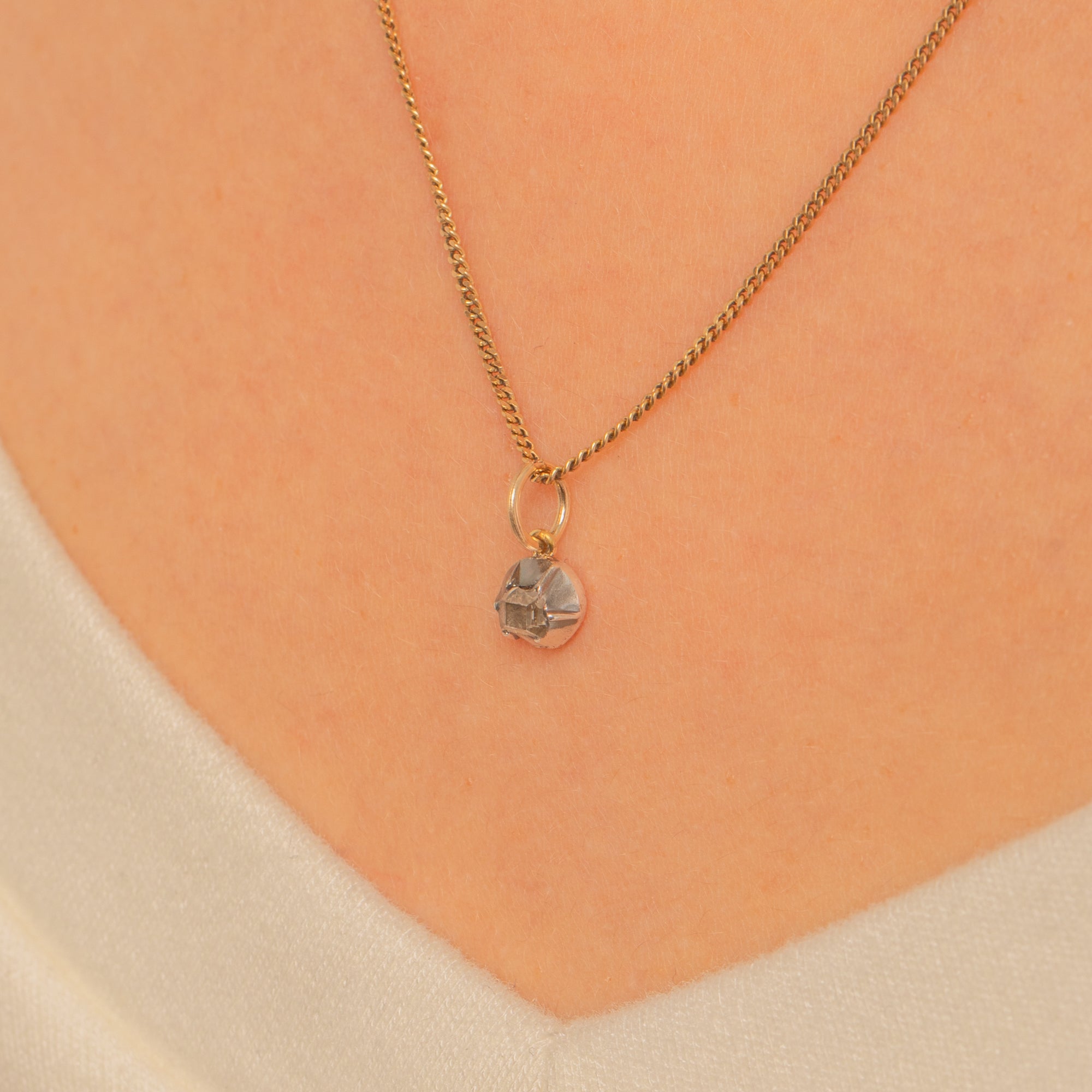 Delicate and steeped in history, this petite Georgian charm showcases a rare 16th/17th Century table-cut Diamond of approximately 0.10ct. The old table-cut’s quiet, glassy glow sits within a starry buttercup-style collet, giving that quintessential antique sparkle in a refined, minimalist silhouette.