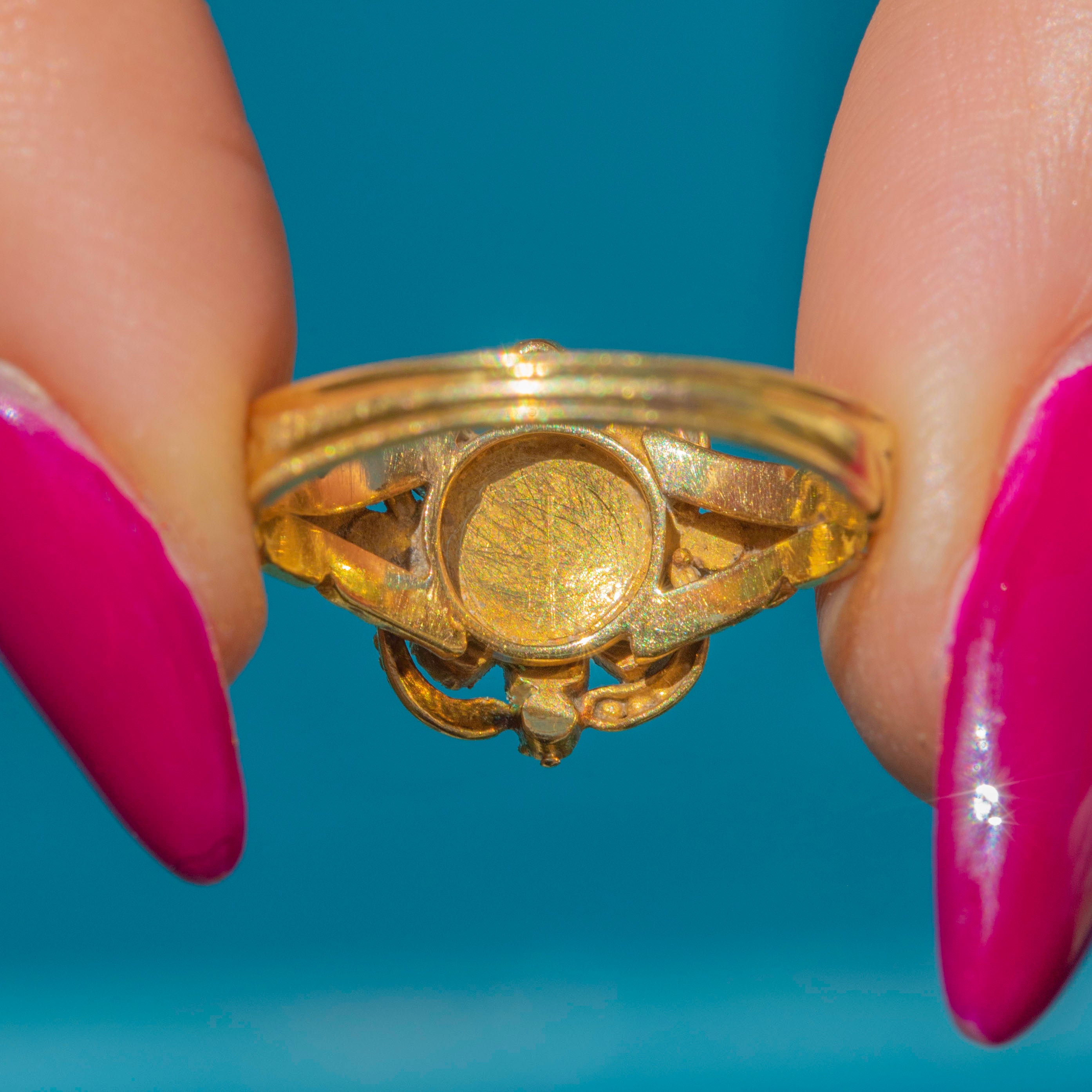 EXCELLENT: This Georgian ring is in sublime condition for its age. All of the gemstones are secure within their settings, with hardly any signs of wear to their facets, and the ring shoulders are immaculate. There is some variation in the colour of the Emeralds, an indicator of their natural essence.