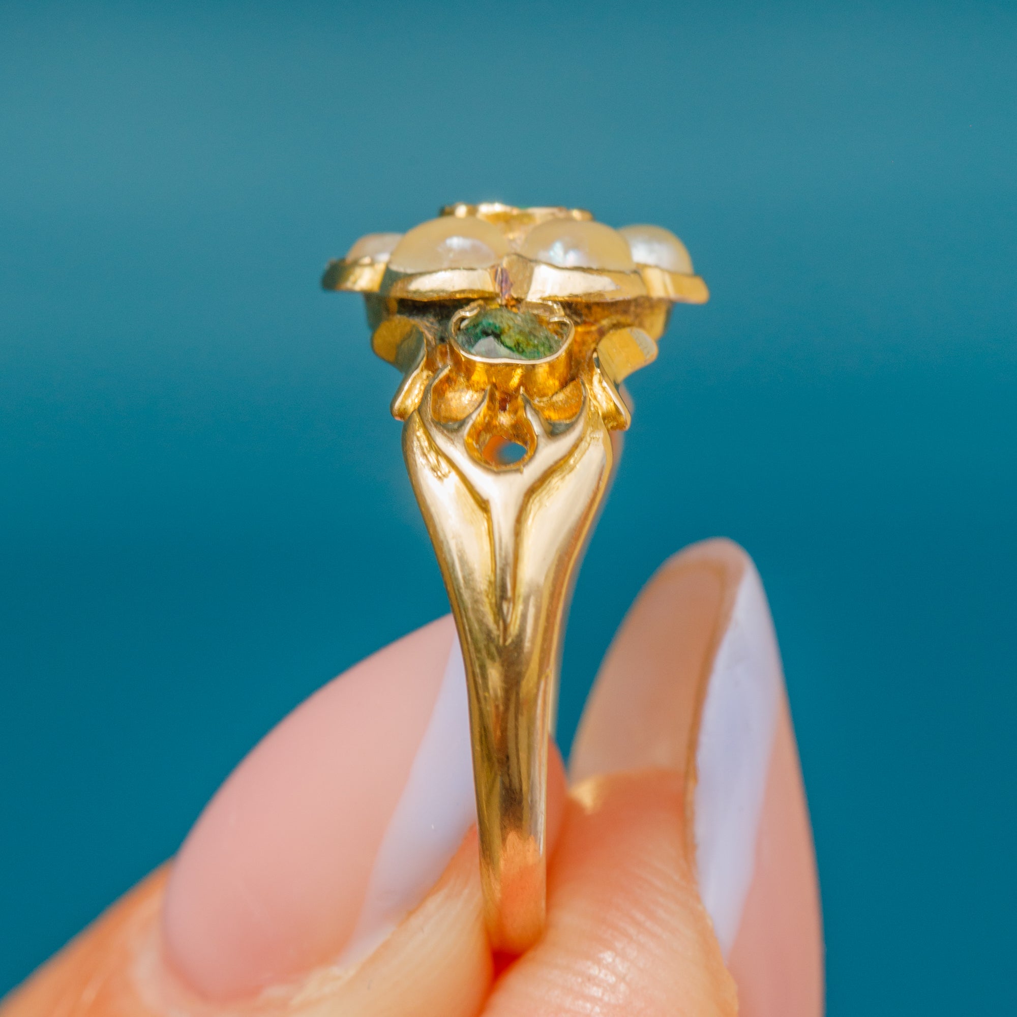 Exquisitely crafted almost two centuries ago, this Georgian 18ct Gold Emerald & Pearl daisy flower ring looks as though she's been plucked from an enchanted forest! The luxurious gemstone cluster displays deep green Emeralds and plump iridescent Pearls, forming a delectable, eye-catching flower.