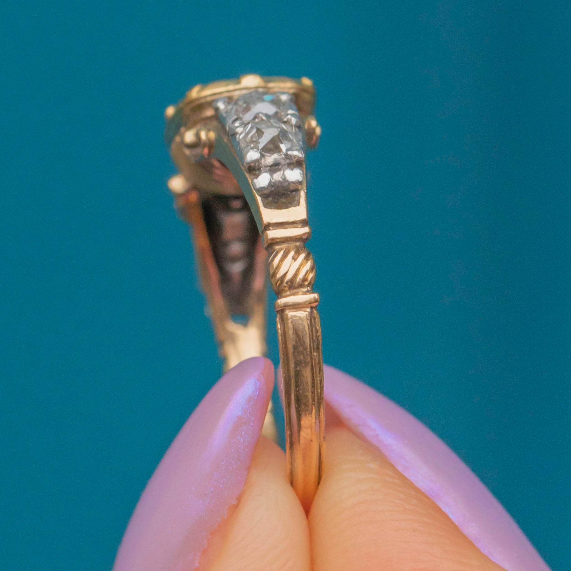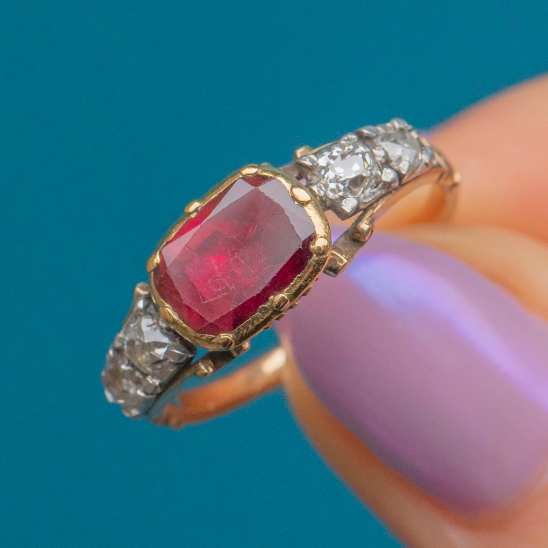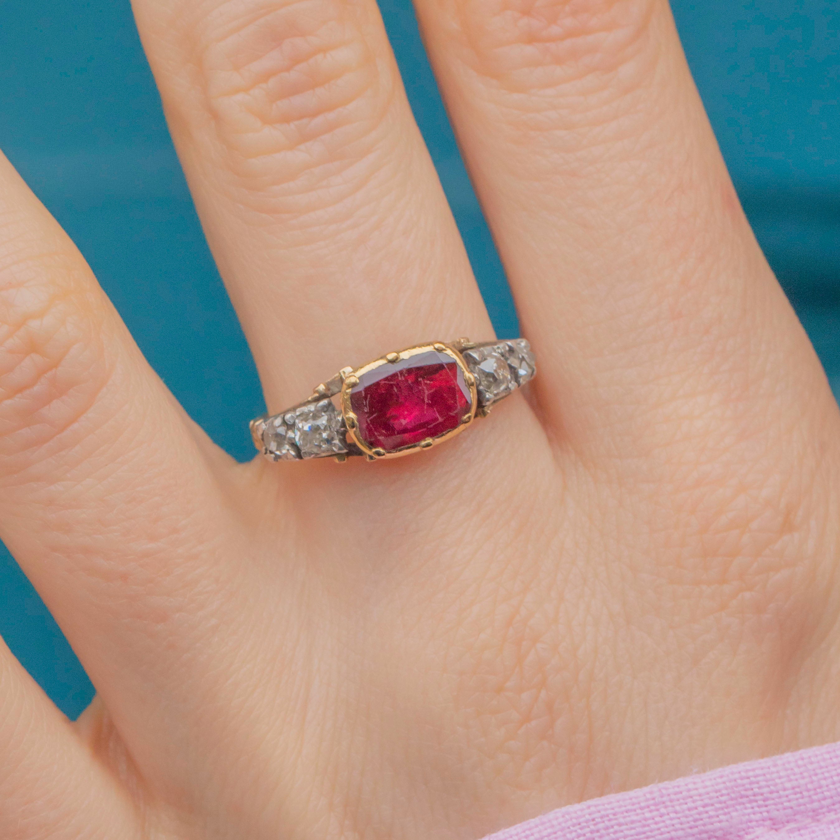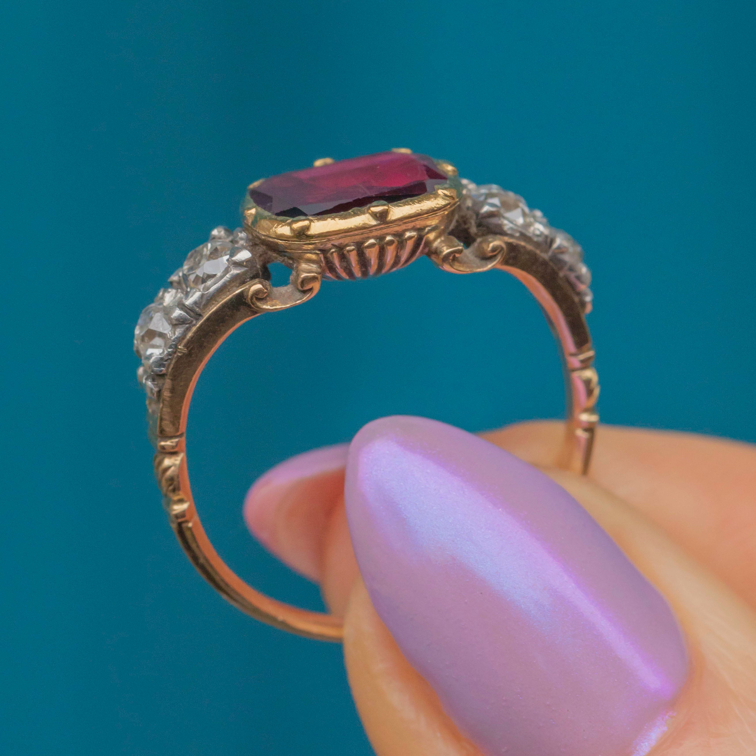 This exquisitely preserved 18th-century Georgian 18ct Gold flat-cut Garnet Diamond half hoop ring is a true treasure from the late 1700s. Dating to around 1790, she embodies the elegance of the era, when jewellery designs were fluid, graceful, and effortlessly enchanting.