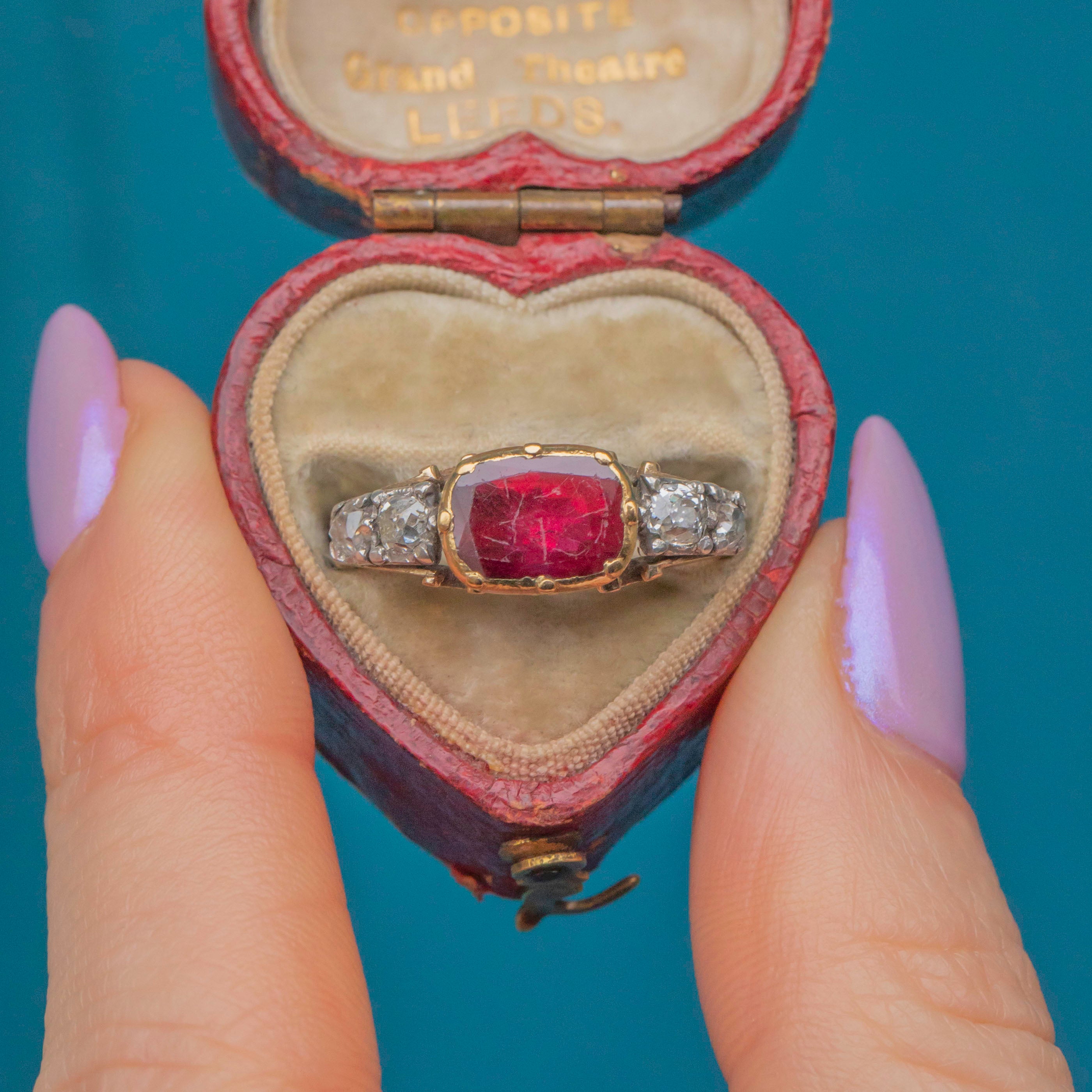 GOOD-VERY GOOD. This Georgian 18ct Gold flat-cut Garnet Diamond half hoop ring remains a stunning antique treasure, despite the natural signs of age. The gemstones are secure in their settings, with the Garnet displaying her rich, berry-red hue, though faint surface scratches are visible upon close inspection. The original shank remains well-formed and smooth to the touch, but shows some signs of wear from years of loving use. With proper gentle care, this rare piece of history can continue to be cherished for many years to come.
