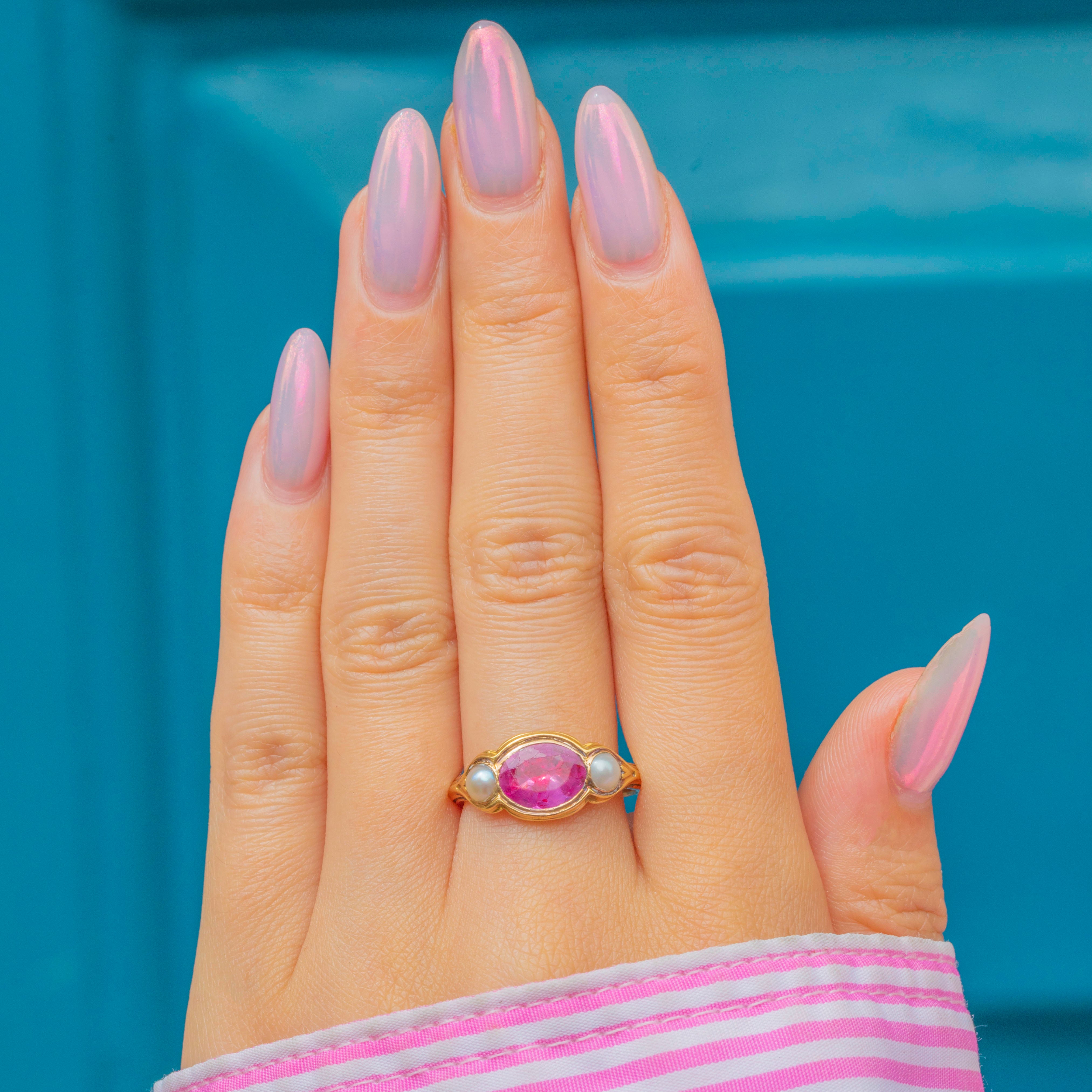The Ruby is flanked by lustrous Pearls, creating a striking trilogy that spreads the width of the finger, and each one is framed by curvaceous settings for a smooth finish. Created circa 1820, this Georgian Ruby ring has been wonderfully preserved and is guaranteed to enchant for generations to come!